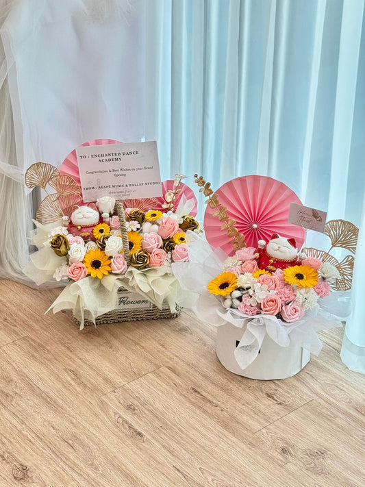 Blossoms of Fortune Opening Flower Basket with fortune cat