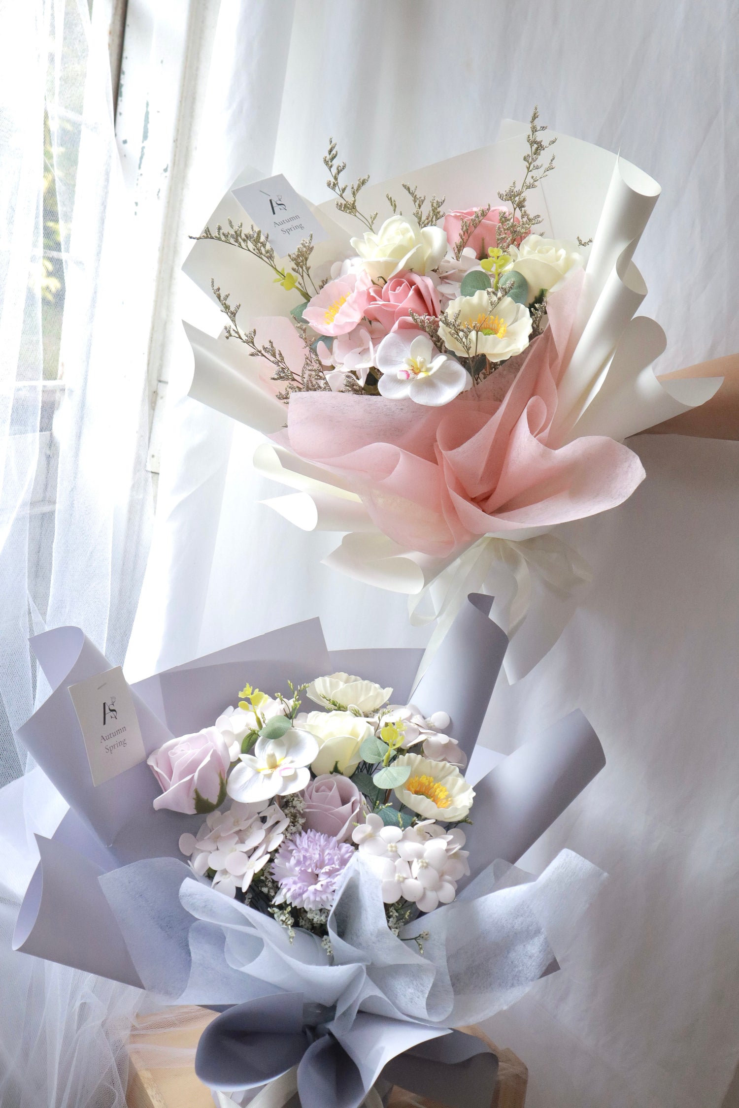 3.Once you receive the bouquet, store it in an air-conditioned room away fom direct airflow and sunlight. For additional hydration, you can place the bouquet in a vase of clean water.