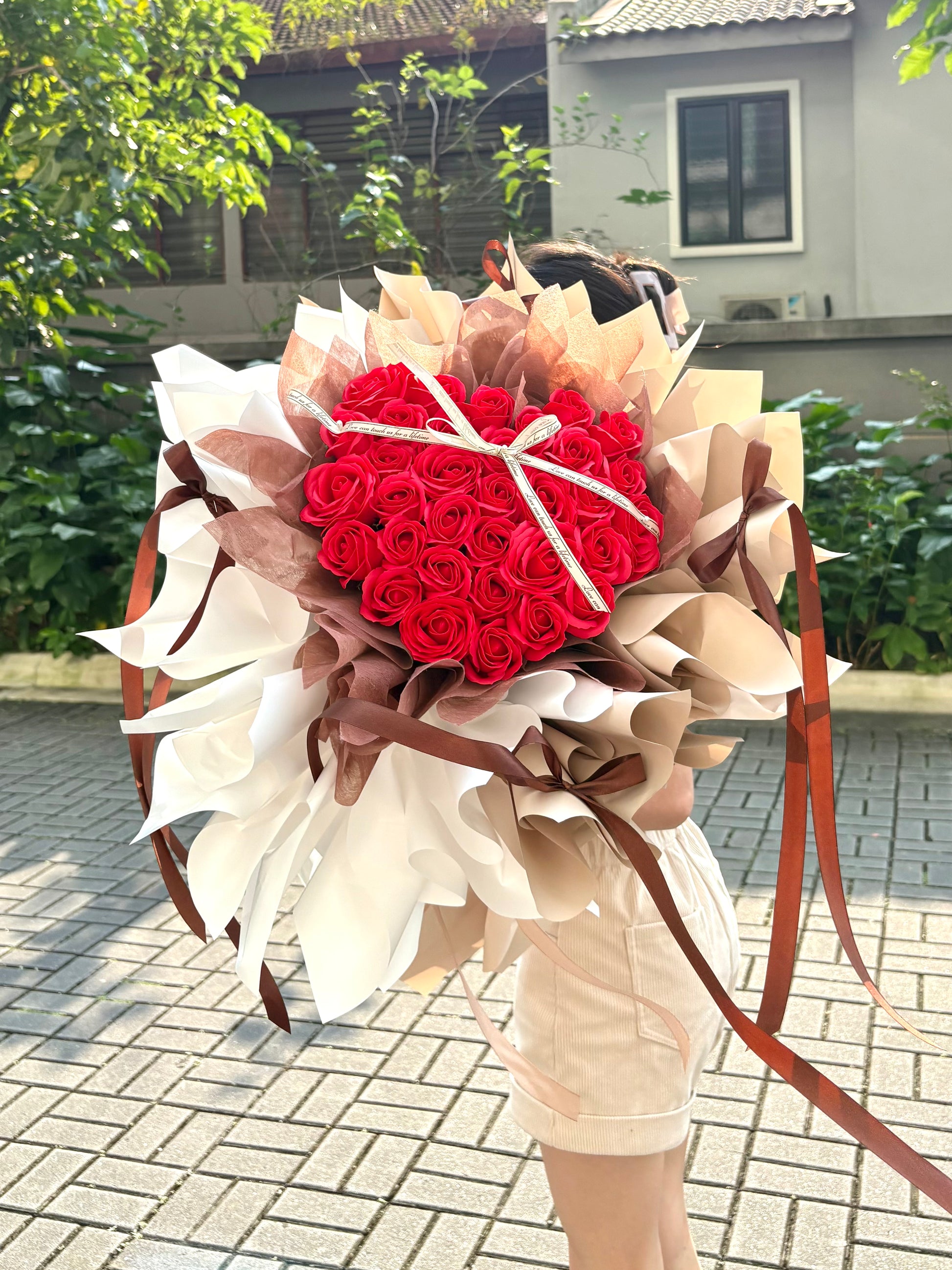 A striking bouquet of 33 red soap roses, symbolizing passionate love, deep devotion, and heartfelt sincerity. Wrapped in earthy khaki tones for a natural, elegant contrast, this everlasting bouquet blends timeless romance with grounded charm — the perfect gift to say “I love you” in the most enduring way.