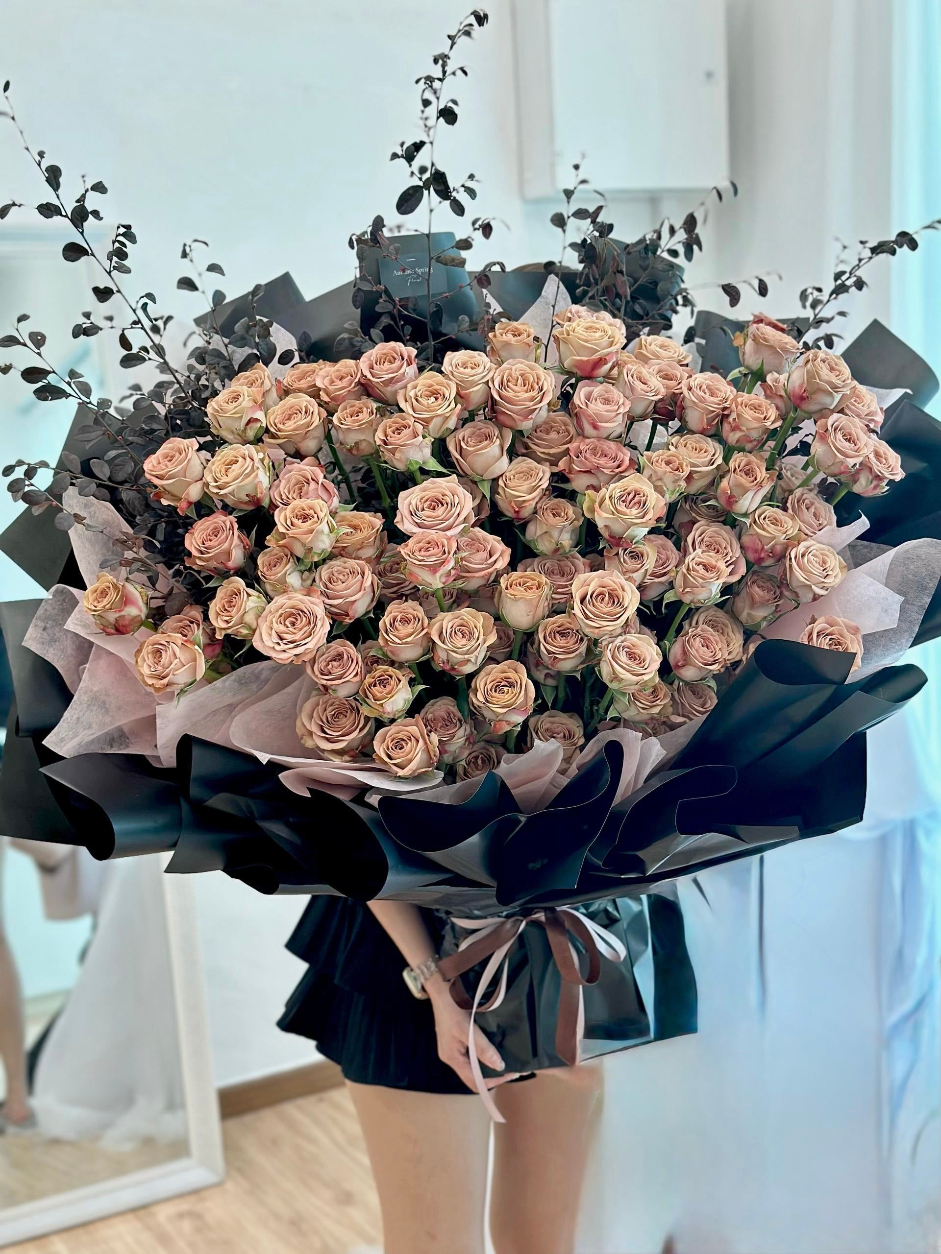 99 hand-selected cappuccino roses– Each bloom at its peak "burnt caramel" hue, ranging from pale latte at the center to edges dipped in cinnamon dust.Suitable for Birthday, Proposal, Surprise Bouquet !