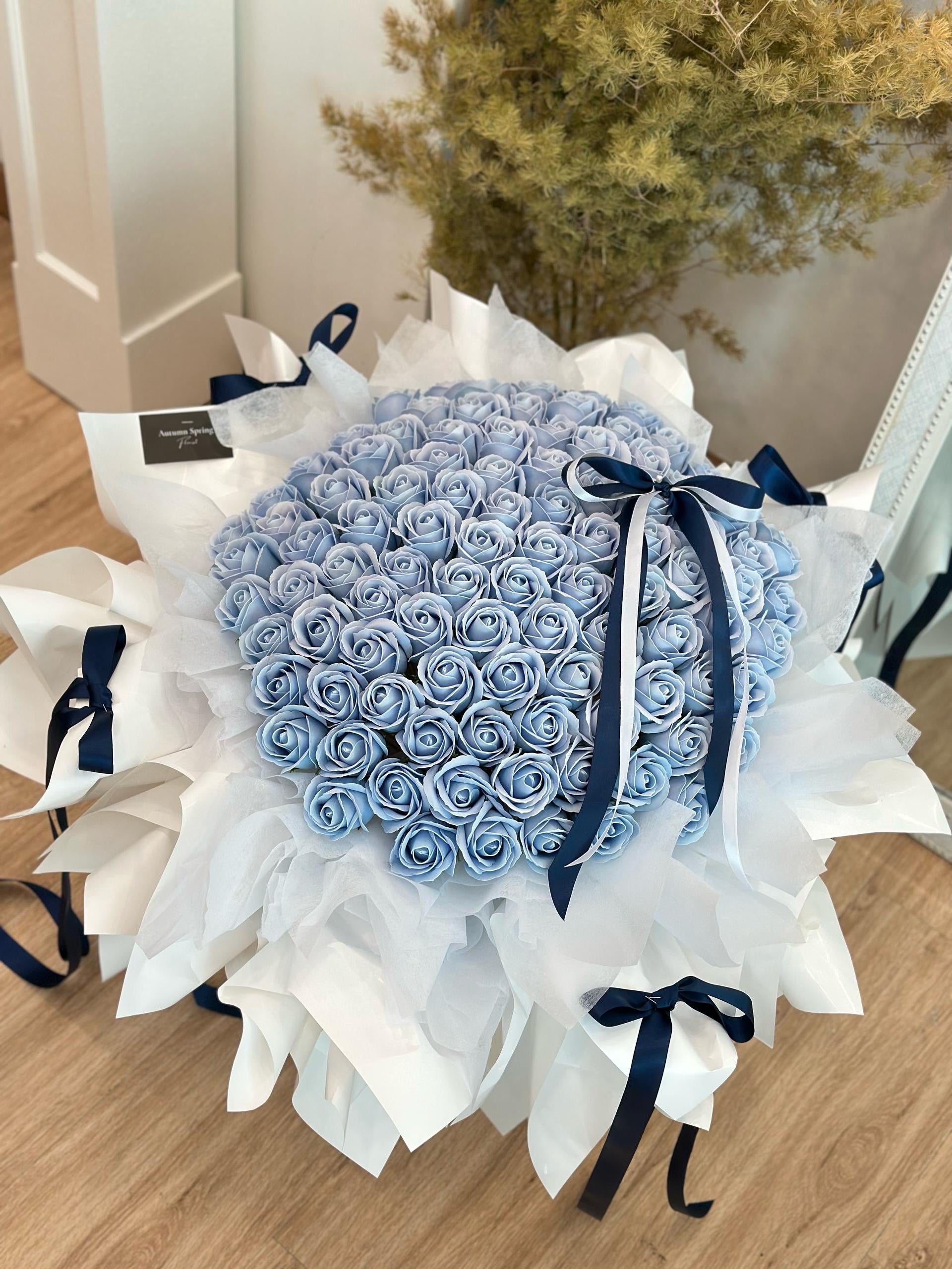 This stunning bouquet of 99 blue soap roses, wrapped in elegant white wrapper, symbolizes eternal love and unwavering devotion. The soft blue blooms represent peace and trust, while the white wrapping adds a touch of purity. Crafted from scented soap, these roses are long-lasting and incredibly lifelike, making it the perfect gift to celebrate love that lasts forever.