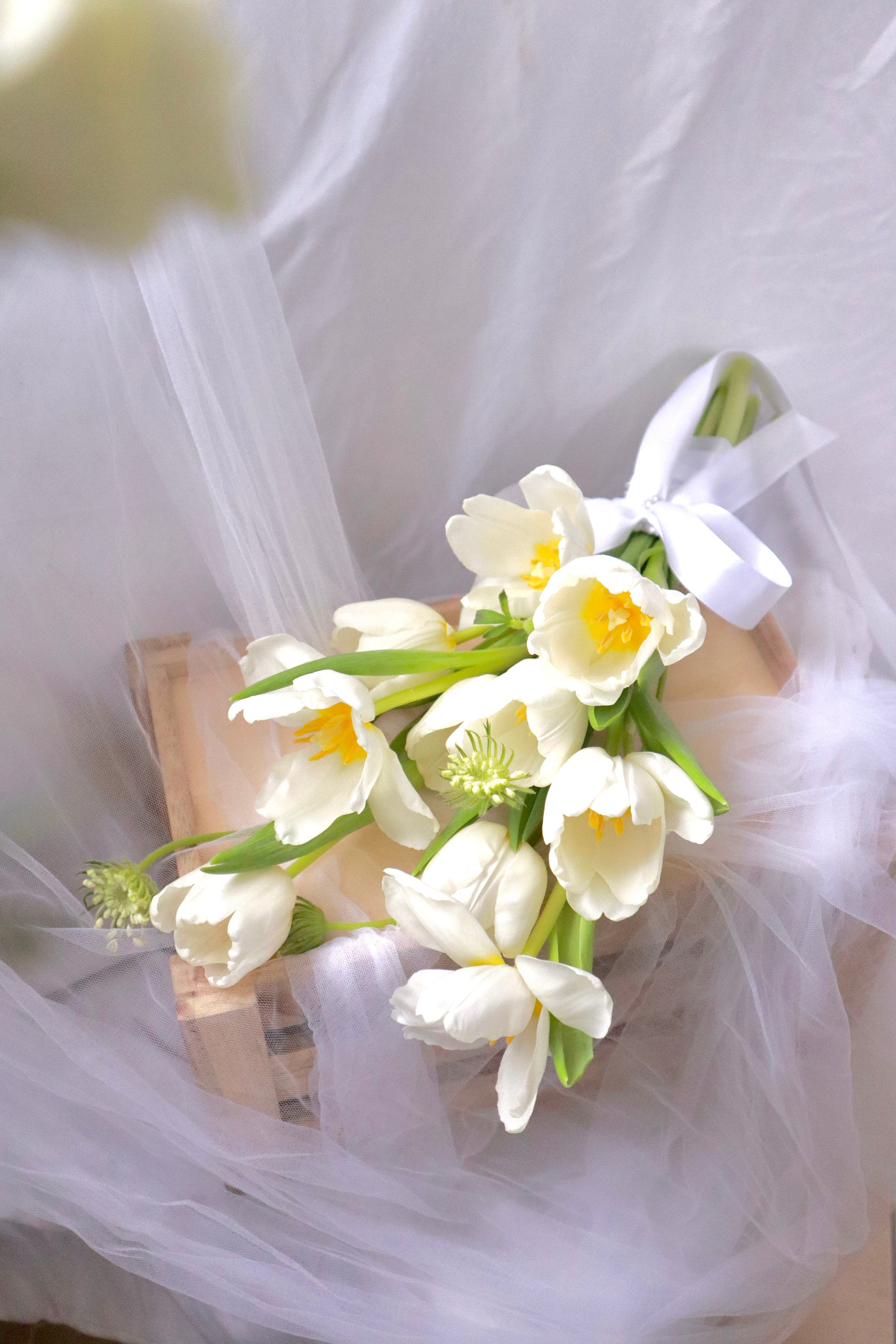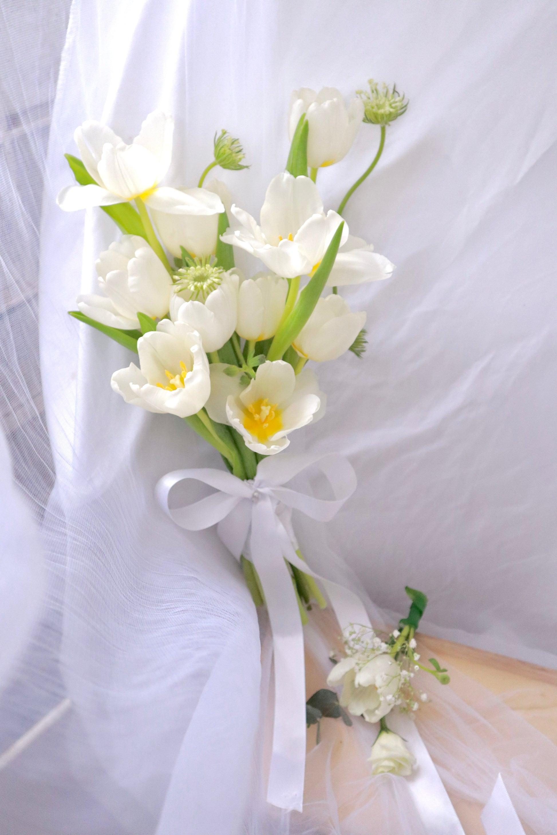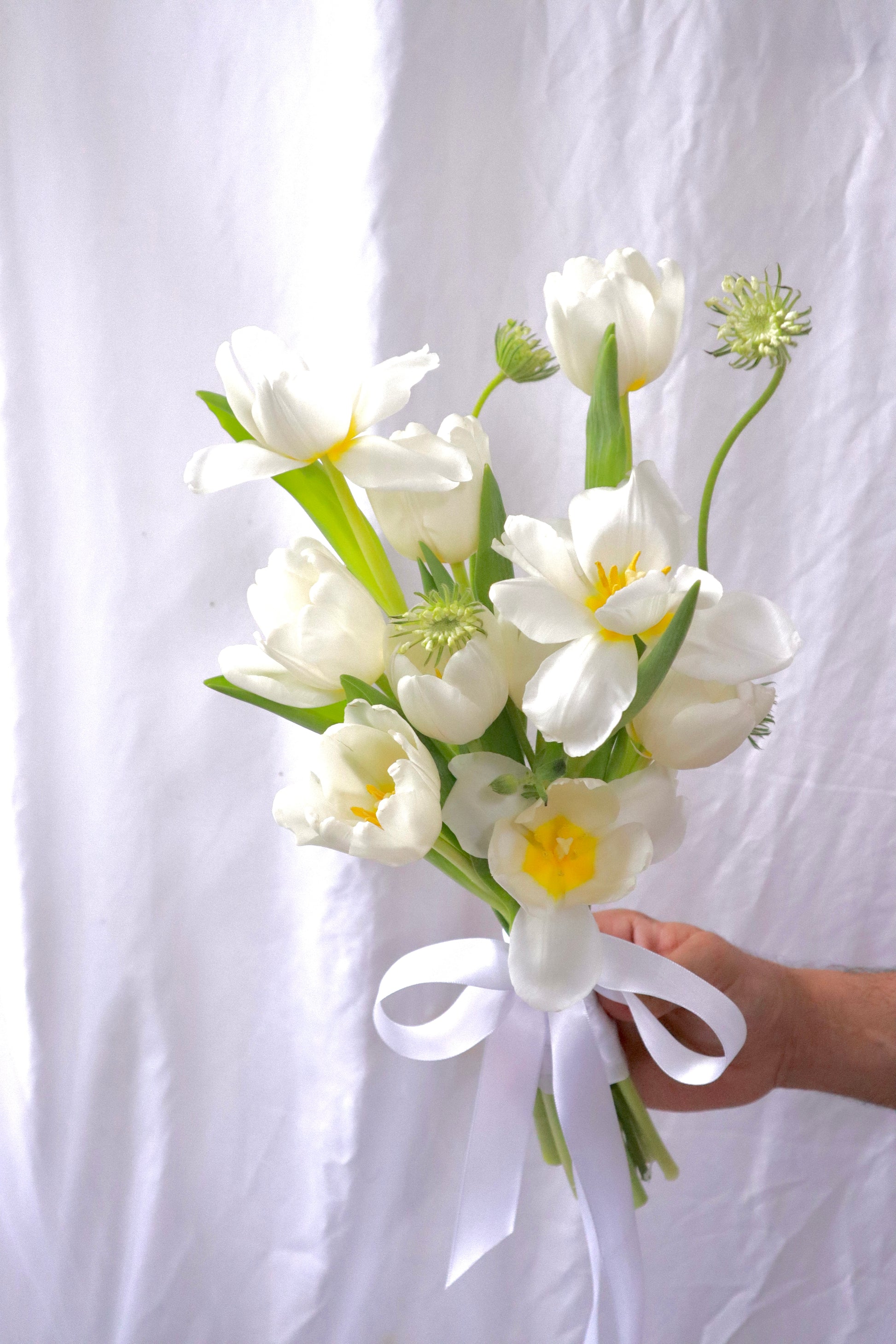 The Angelica White Tulip Bridal Bouquet is a stunning floral arrangement featuring pristine white tulips and delicate lace-like flowers. This minimalist yet elegant bouquet embodies a refined and timeless aesthetic, making it a perfect choice for the modern bride.