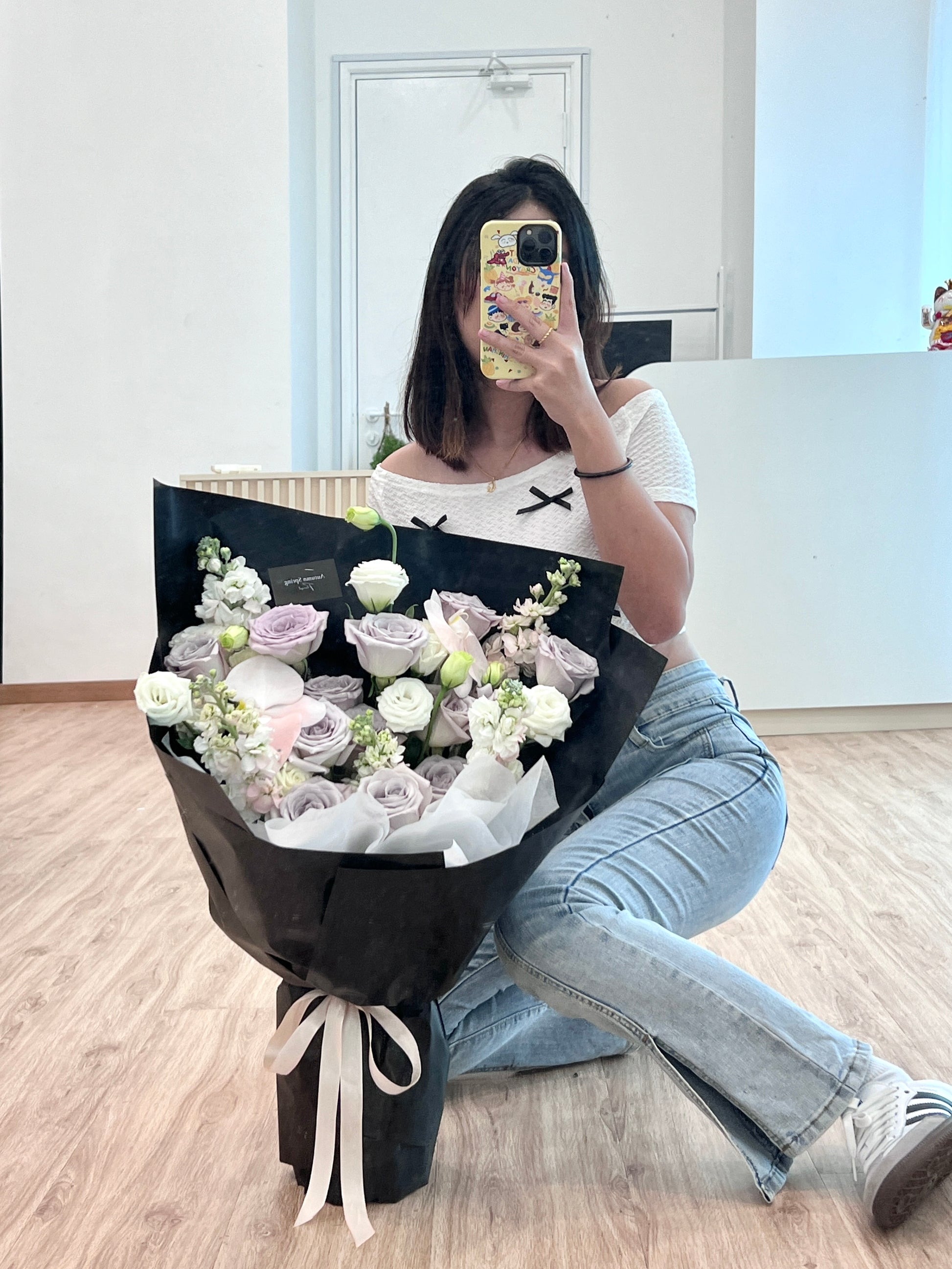 The “Twilight Vows” bouquet is a sophisticated and timeless arrangement that pairs the delicate beauty of menta roses, white eustoma, and white matholia with the bold elegance of black wrapping. This striking combination of soft, romantic blooms against the deep, dramatic backdrop creates a modern, yet classic look that exudes refinement and mystery