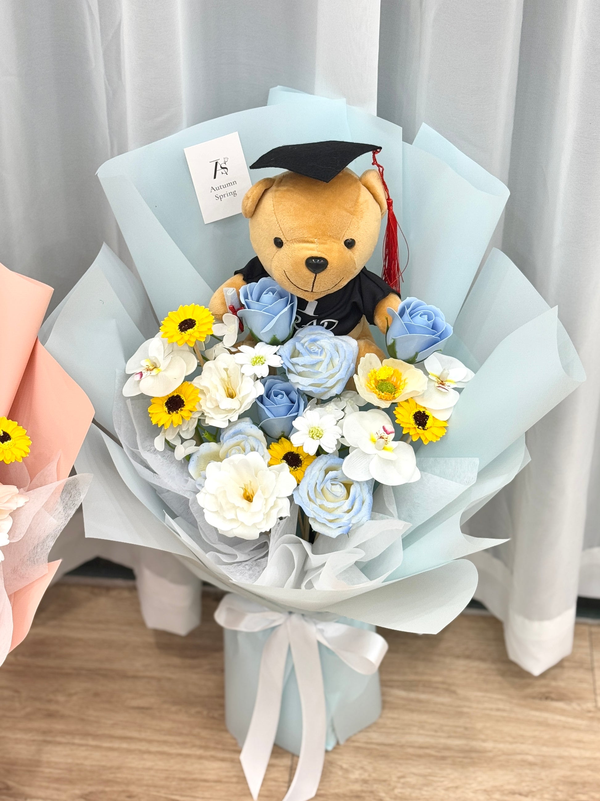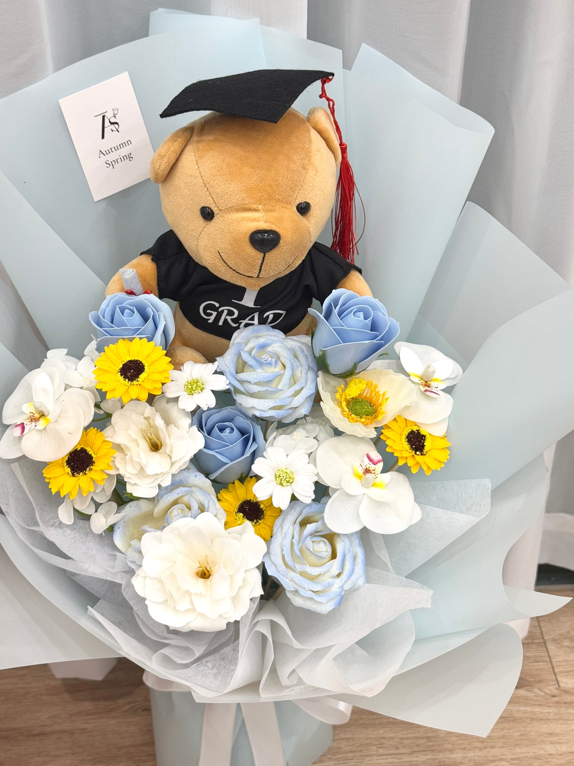 Blue Dream Graduation Soap Flower Bouquet with teddy bear