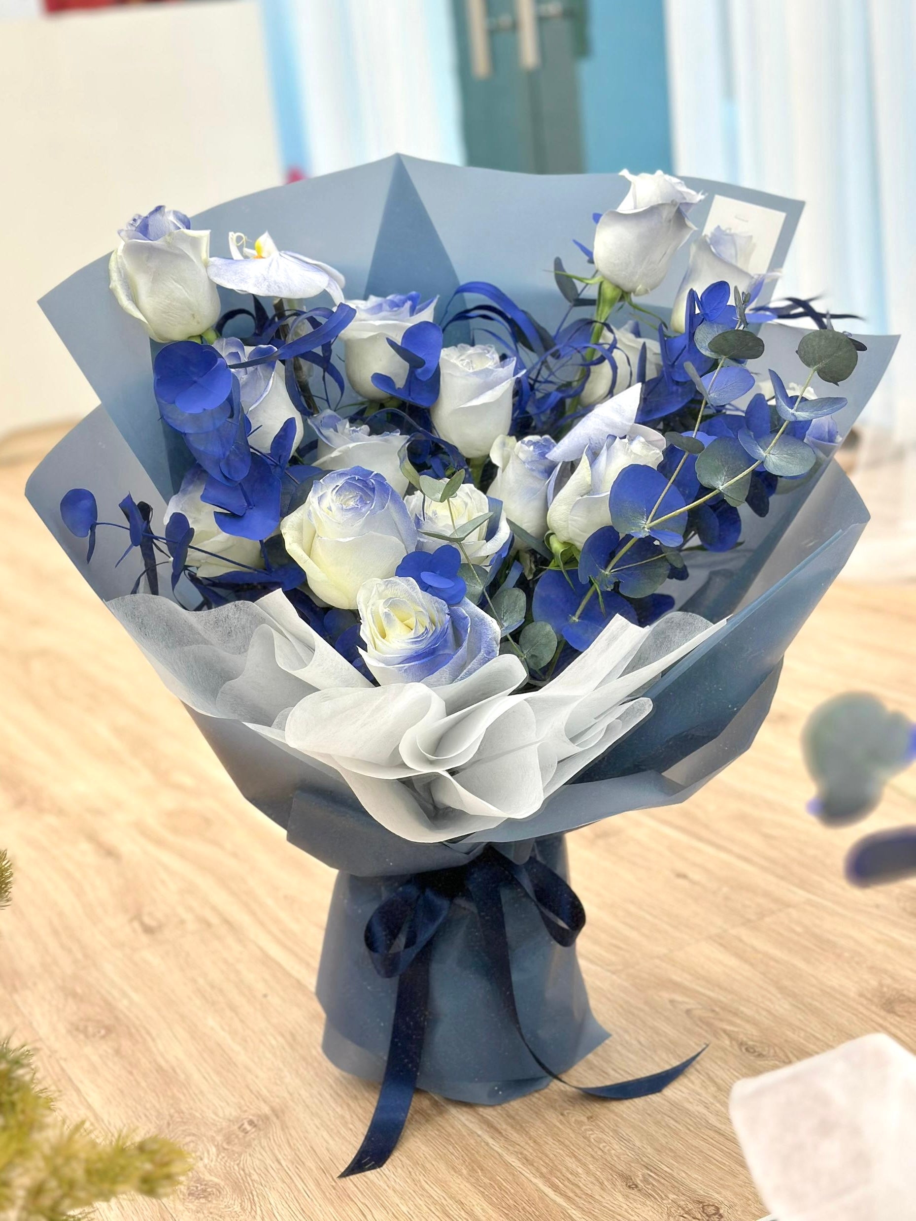 The “Blue Dream Promise” bouquet features a stunning combination of delicate blue spray roses and refreshing eucalyptus, creating a calming, serene, and elegant floral arrangement. The soft blue hue of the roses symbolizes tranquility, loyalty, and peace, while the eucalyptus adds a touch of freshness and natural beauty, with its soft green tones and aromatic leaves.