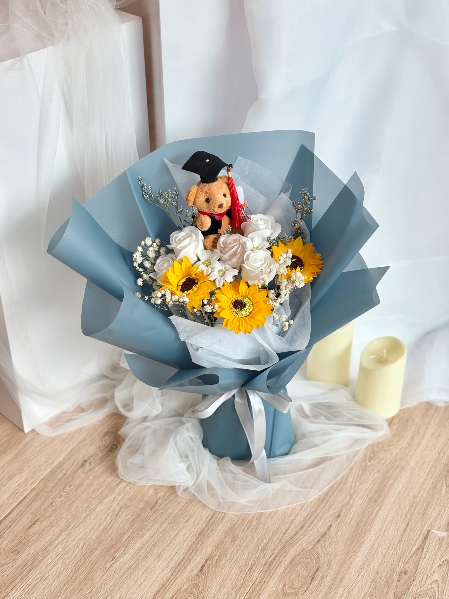 Celebrate academic achievements with this elegant bouquet featuring blue soap flowers, symbolizing wisdom and success. Designed to last, it serves as a timeless reminder of the graduate's journey and accomplishments.