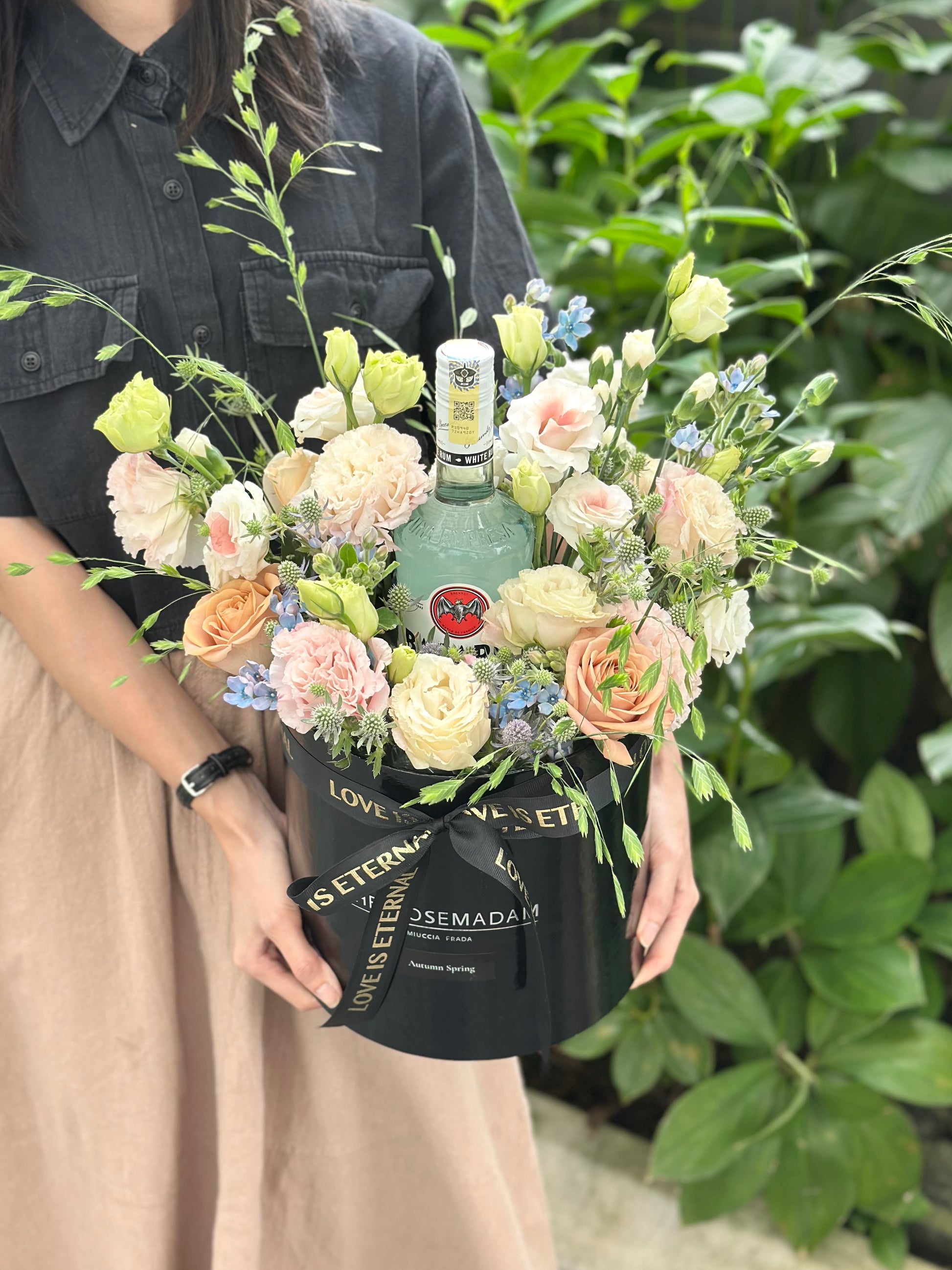 An elegant pairing of handpicked blooms and premium alcohol—designed to charm both the eyes and the senses.A perfect choice for thoughtful gifting, celebration moments, or simply treating yourself to a touch of floral intoxication.Wrapped with care, delivered with heart.