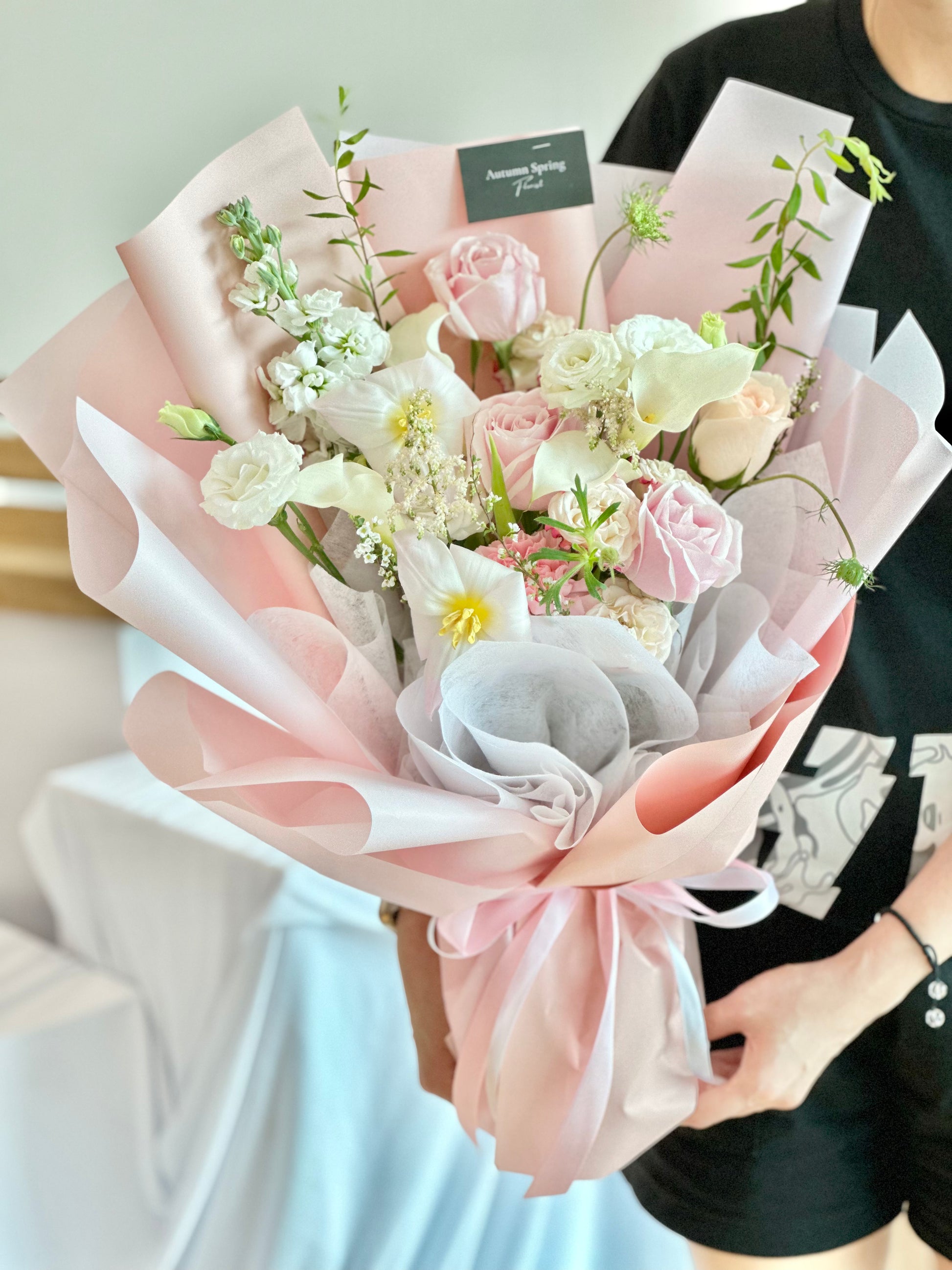 A charming mix of seasonal blooms wrapped in a soft pink wrapper, Blushing Garden brings together the joy of vibrant florals with the sweetness of pastel tones. Featuring fresh tulips, eustomas, roses, and delicate fillers, this bouquet bursts with warmth and cheerful elegance. The pink wrap adds a romantic and playful touch — perfect for birthdays, celebrations, or just because