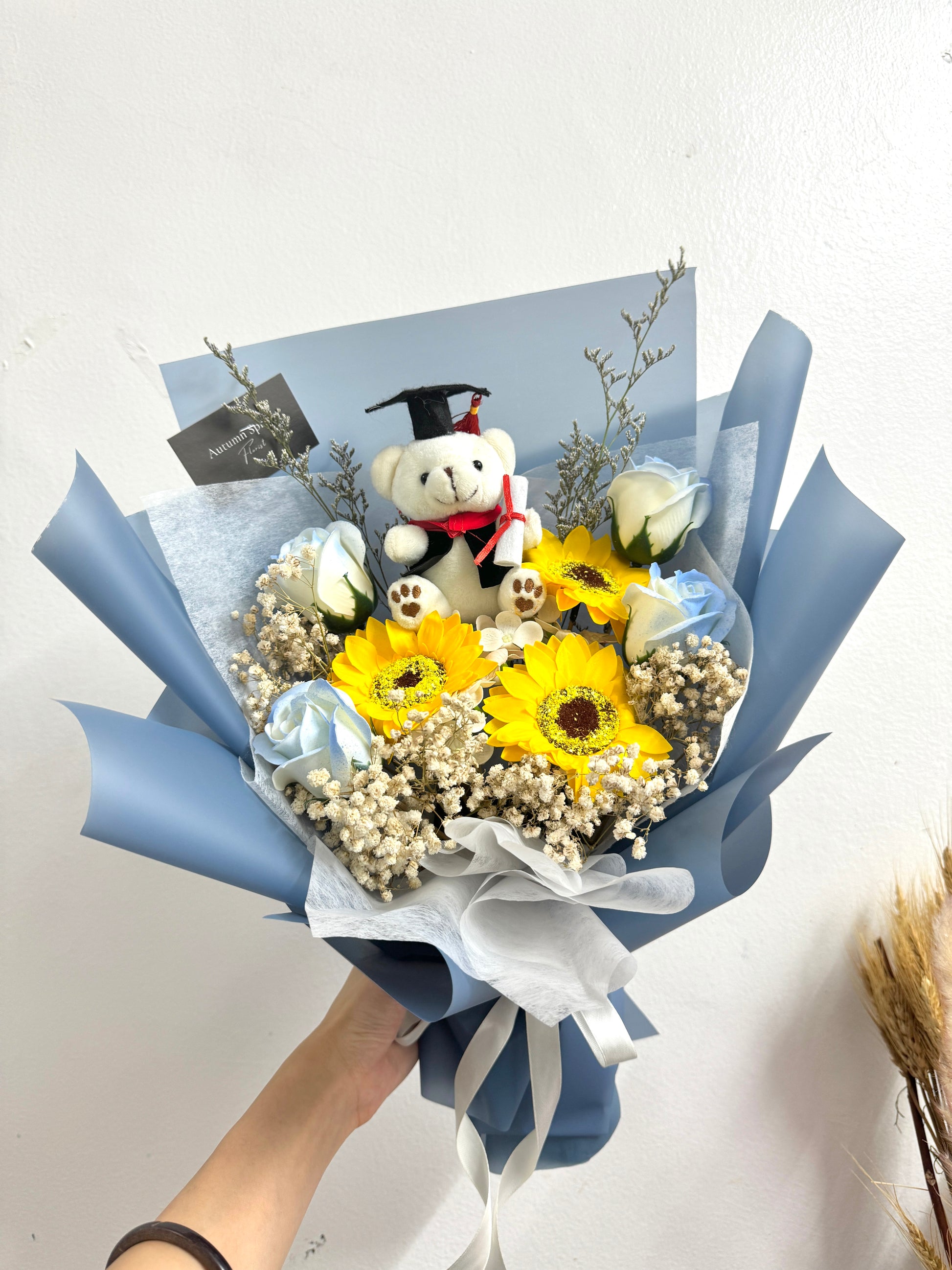 Celebrate new beginnings with the Bright Journey Soap Flower Bouquet. This vibrant arrangement features a stunning mix of bold, cheerful colors, beautifully crafted in soap flowers, and topped with an adorable graduation teddy bear perfect for marking this special milestone.