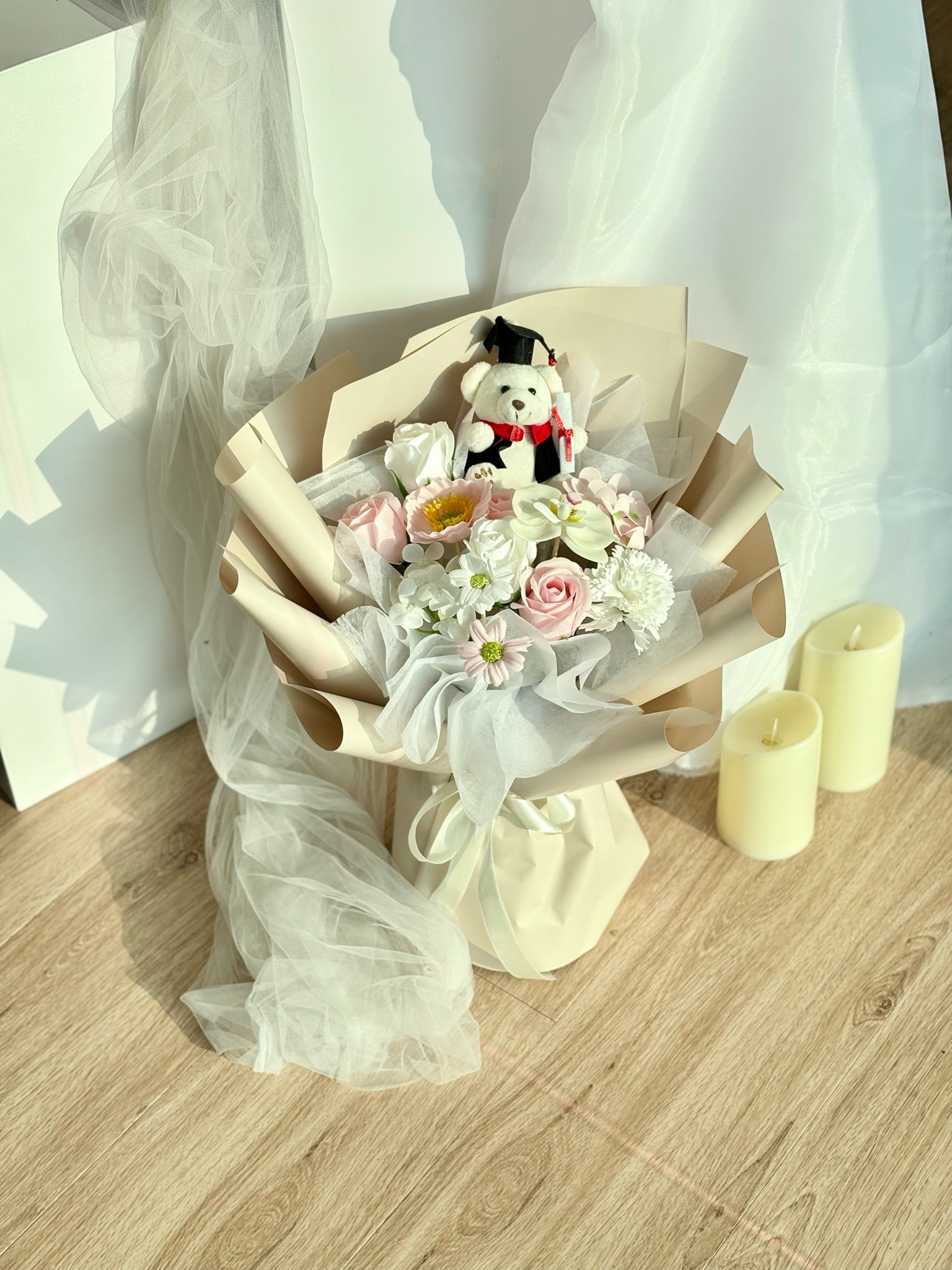 Celebrate their achievement with this elegant bouquet of soap flowers, symbolizing growth, success, and the exciting journey ahead. Vibrant blooms that last, wrapped in charm and grace—perfect for marking a graduation milestone. A timeless gift to remember their special day.