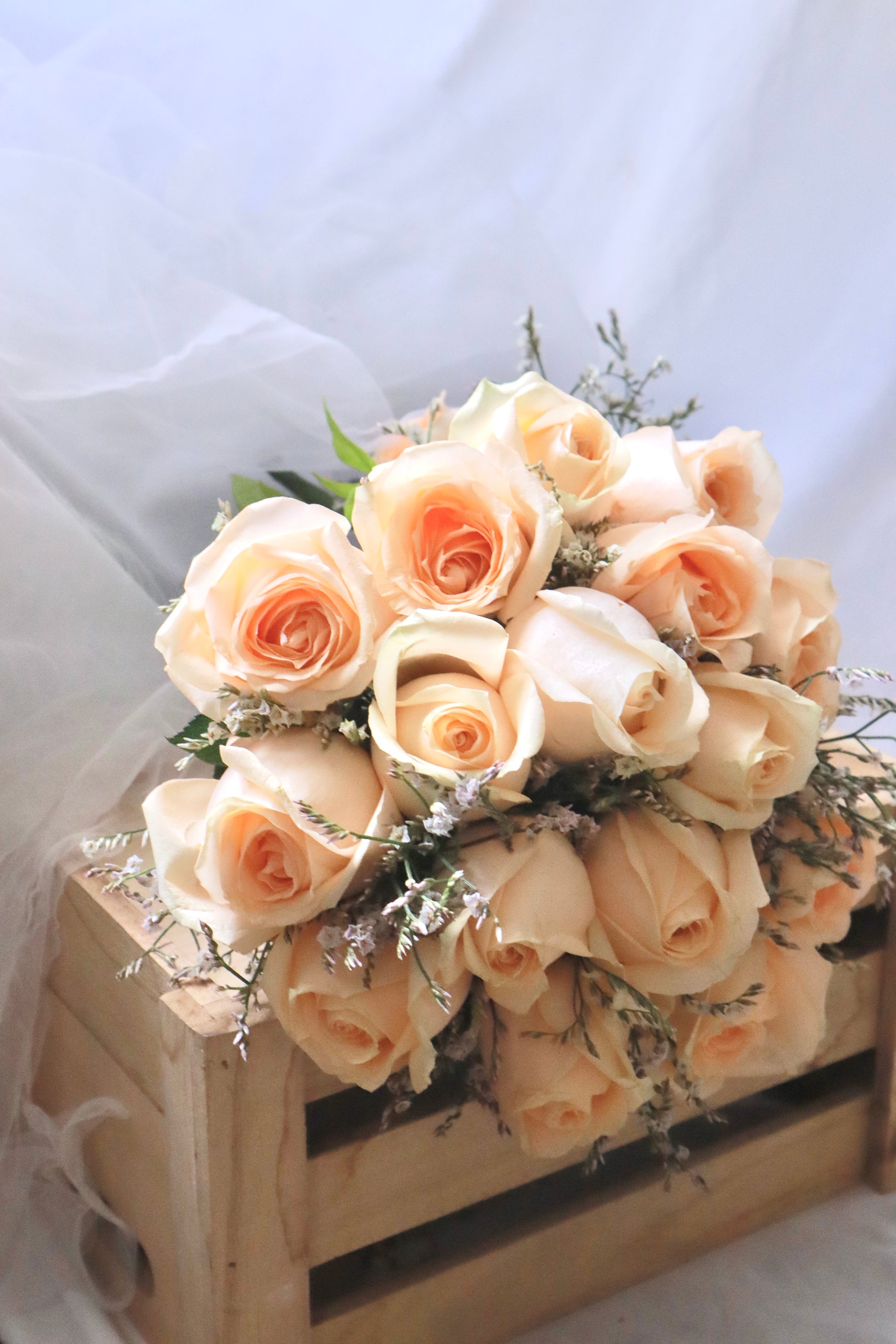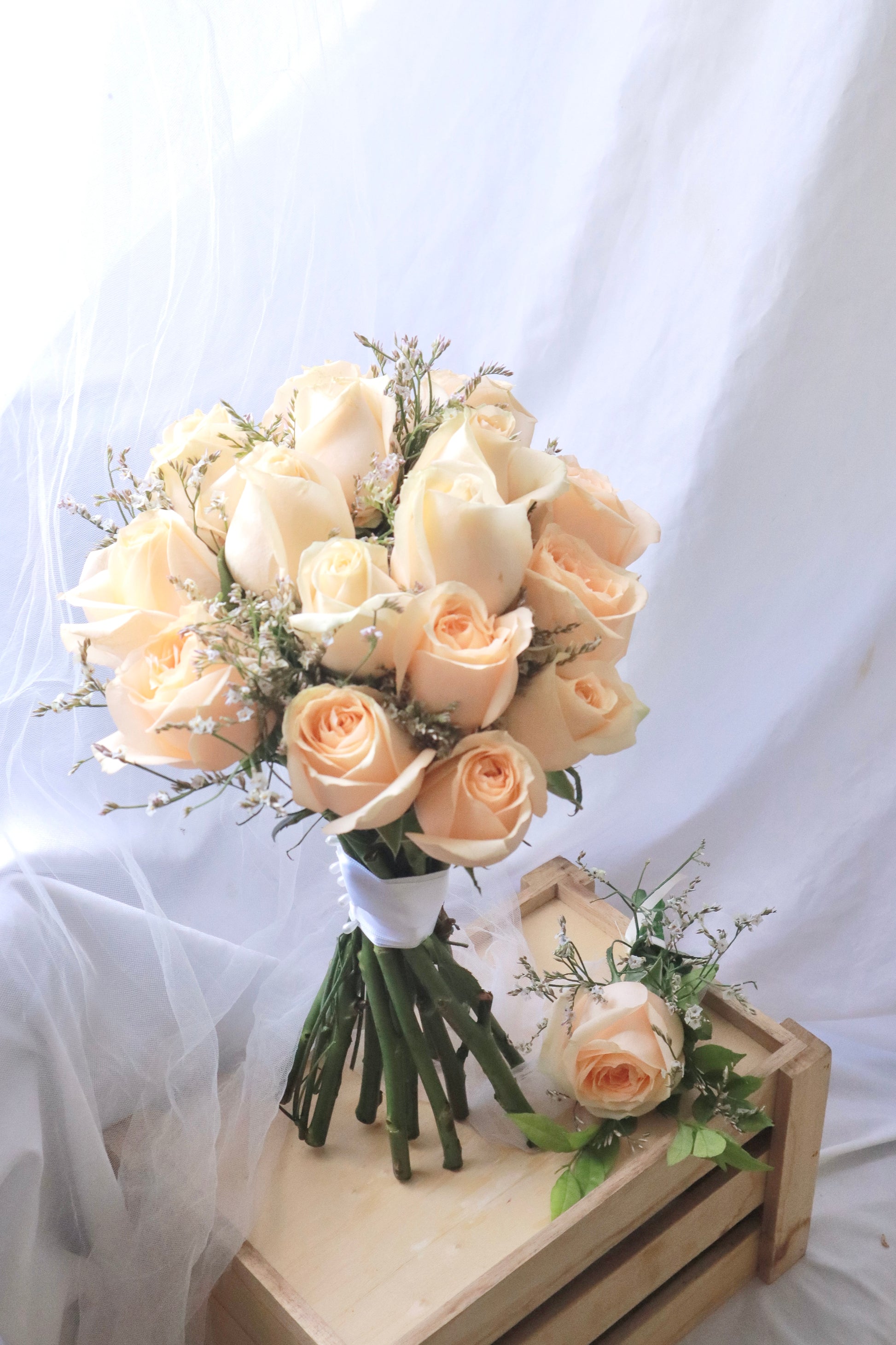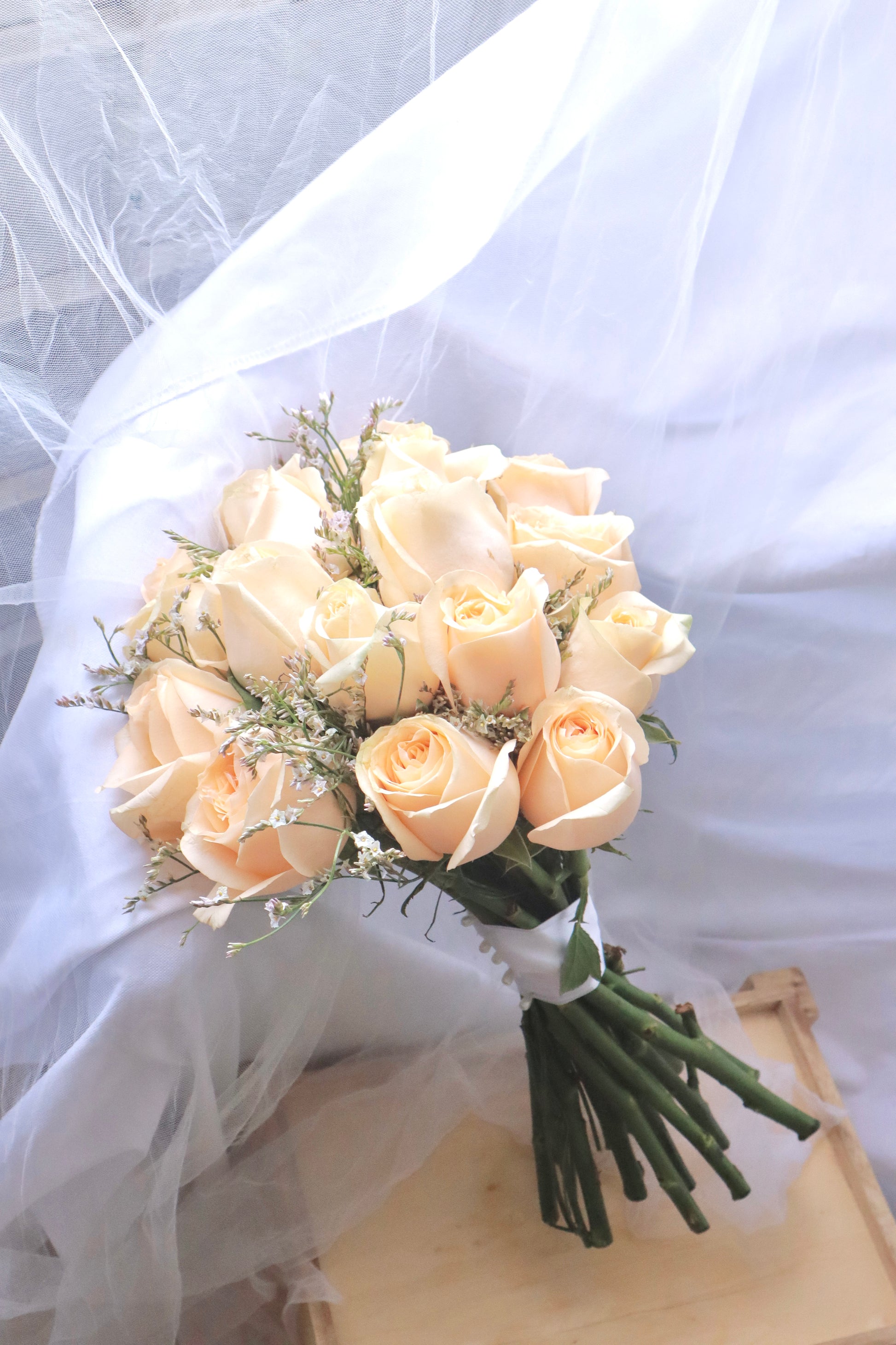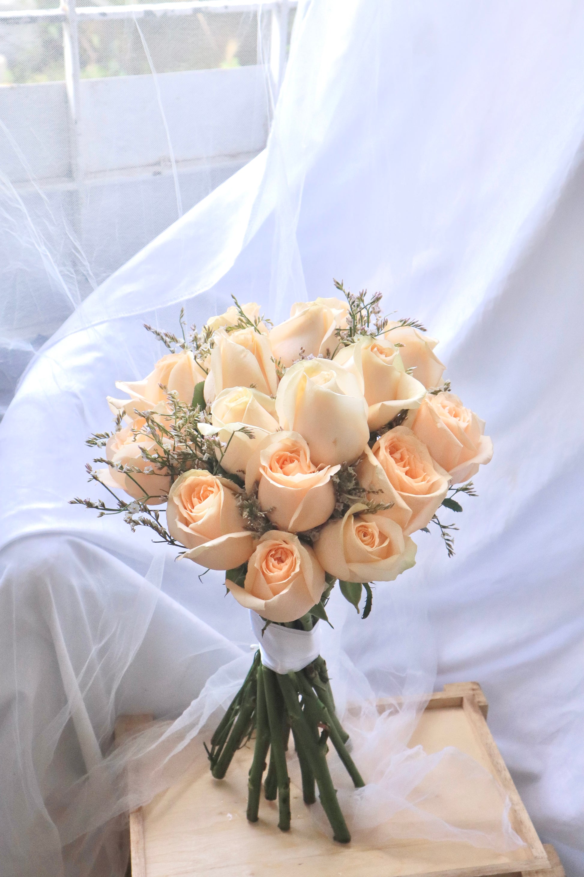 Introducing the Ivory Champagne Rose Bridal Bouquet, a sophisticated pairing of delicate champagne roses and airy casphia white. This bouquet exudes timeless elegance with its soft hues and graceful textures, perfect for the bride seeking a classic and refined floral arrangement.
