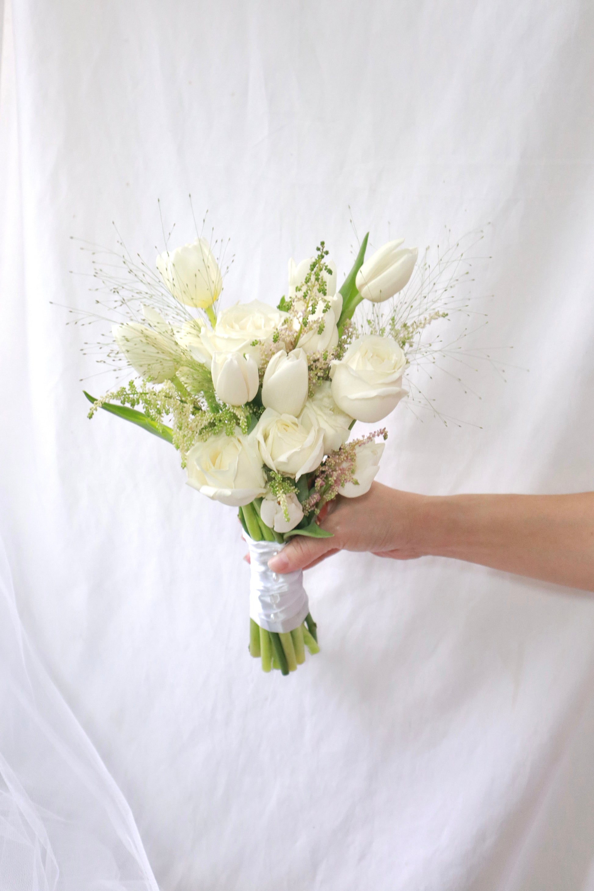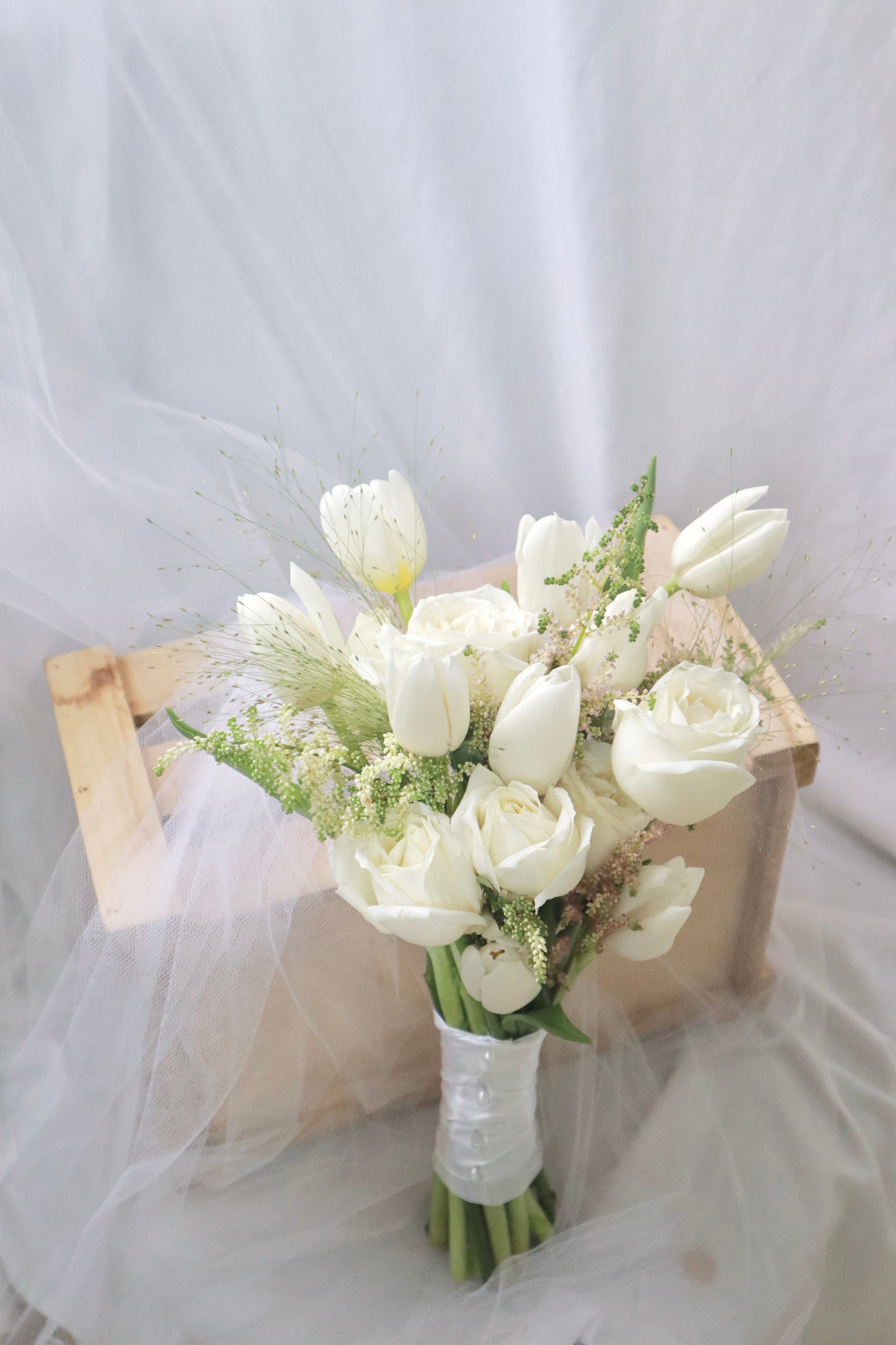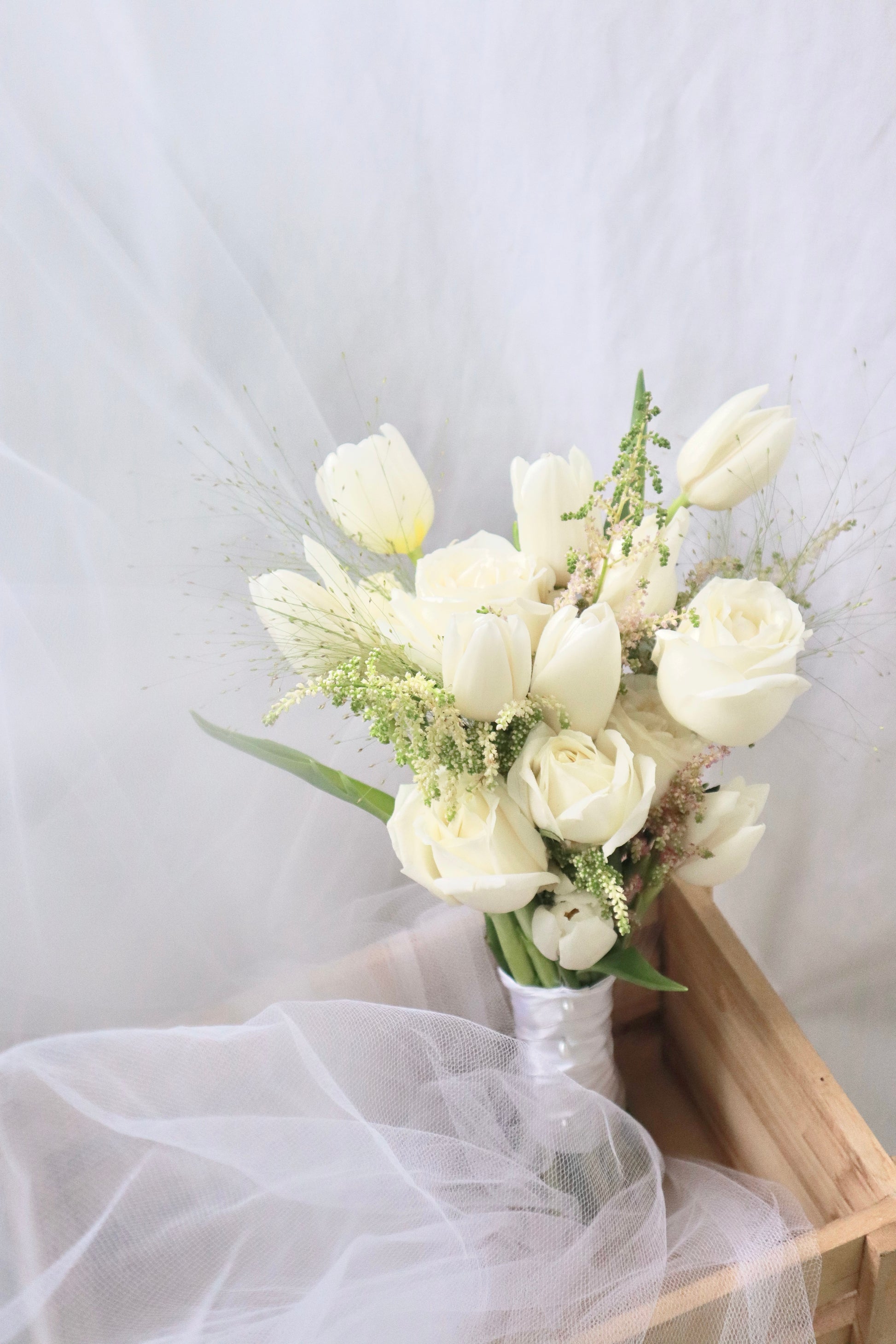 The Charlotte Korean Style Bridal Bouquet blends white roses, tulips, and delicate astilbe with airy fountain grass for a minimalist yet elegant look. Perfect for modern brides, this bouquet exudes purity and grace, making your special day unforgettable.