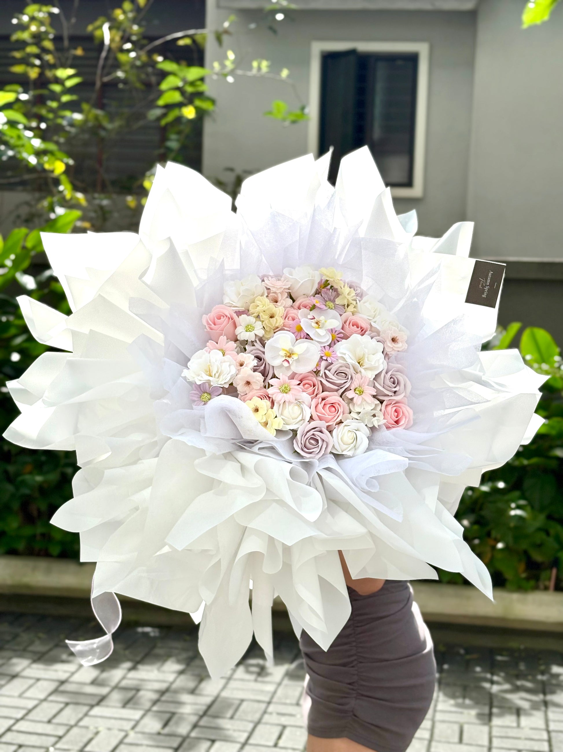 A fairytale-inspired arrangement of pastel soap flowers in blush pinks, creamy whites, and lilac purples — wrapped in layered white paper like petals unfolding. This bouquet brings a sweet, romantic charm that’s perfect for birthdays, anniversaries, graduations, or simply to make someone feel truly special.