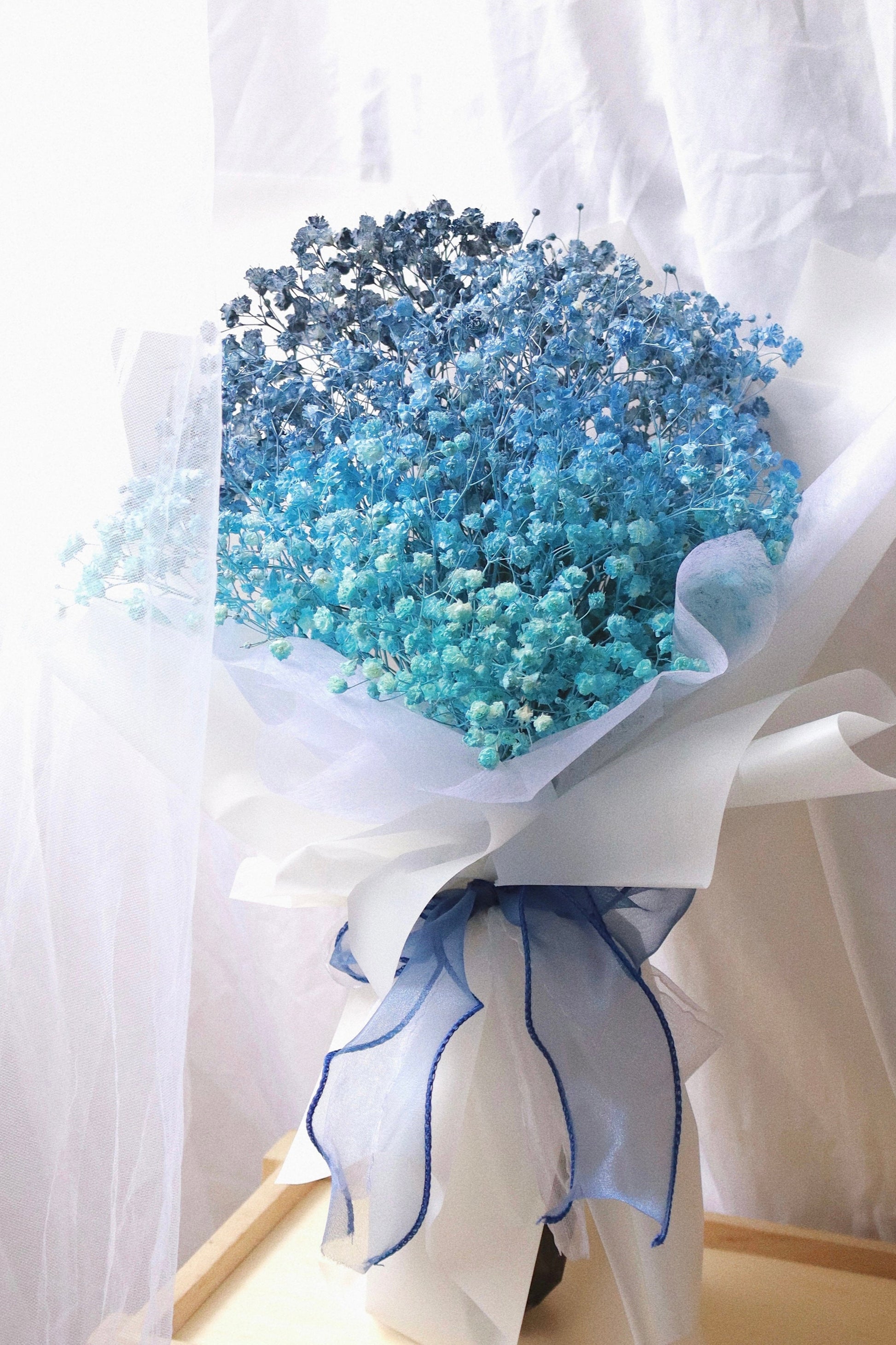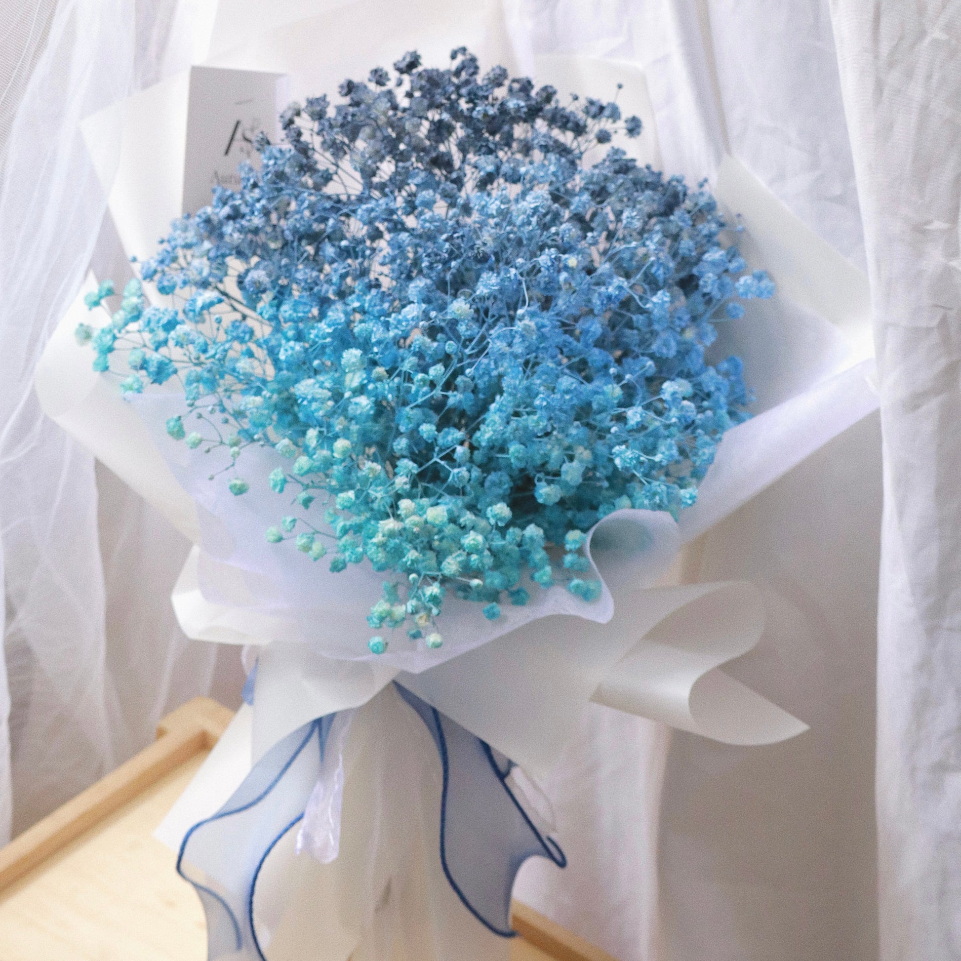 The Cyan Blue Baby's Breath Bouquet offers a dreamy touch with its delicate blue blooms. Soft and airy, this ethereal bouquet adds a serene and whimsical charm, making it a unique and enchanting choice for any special occasion.