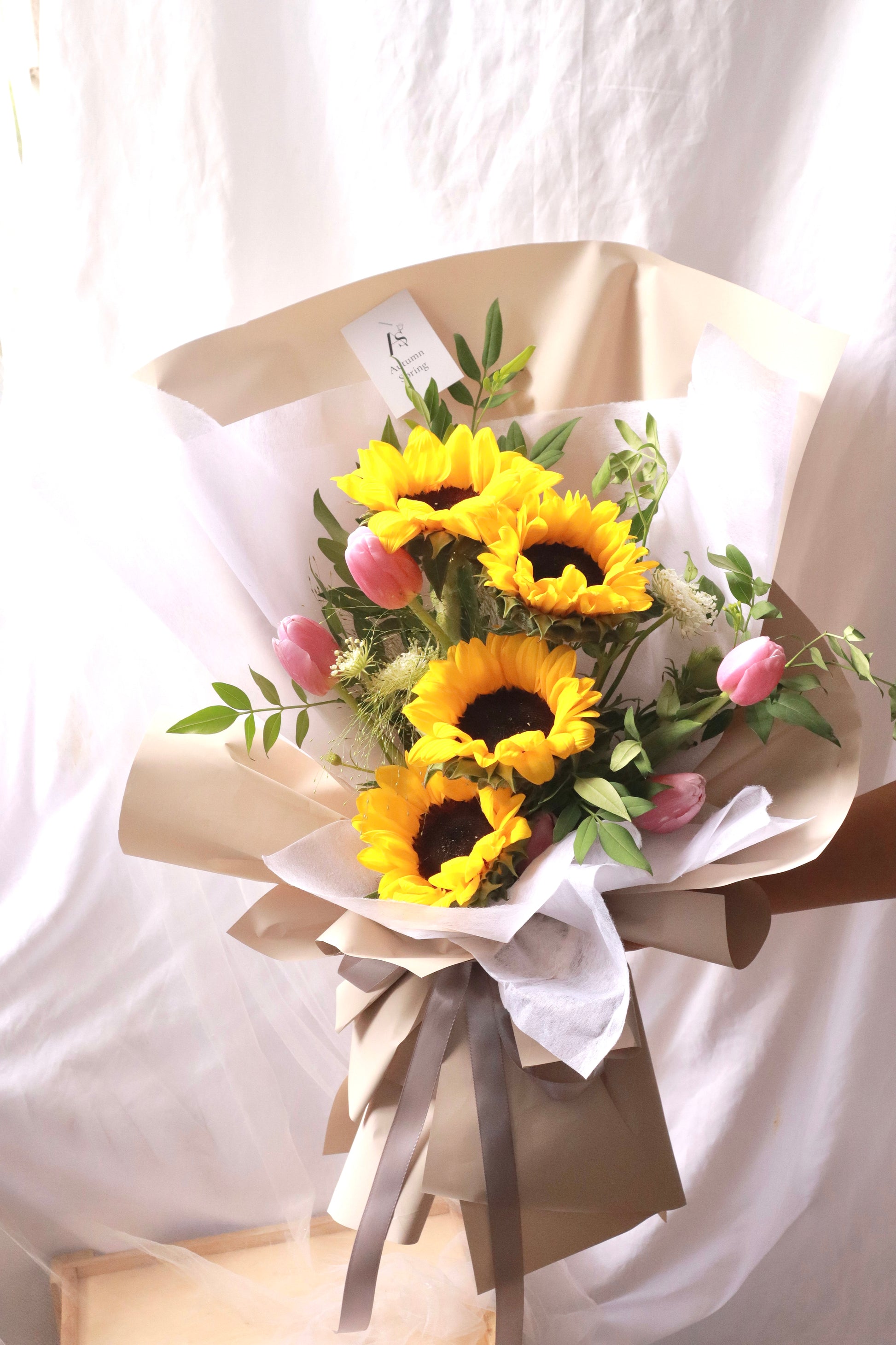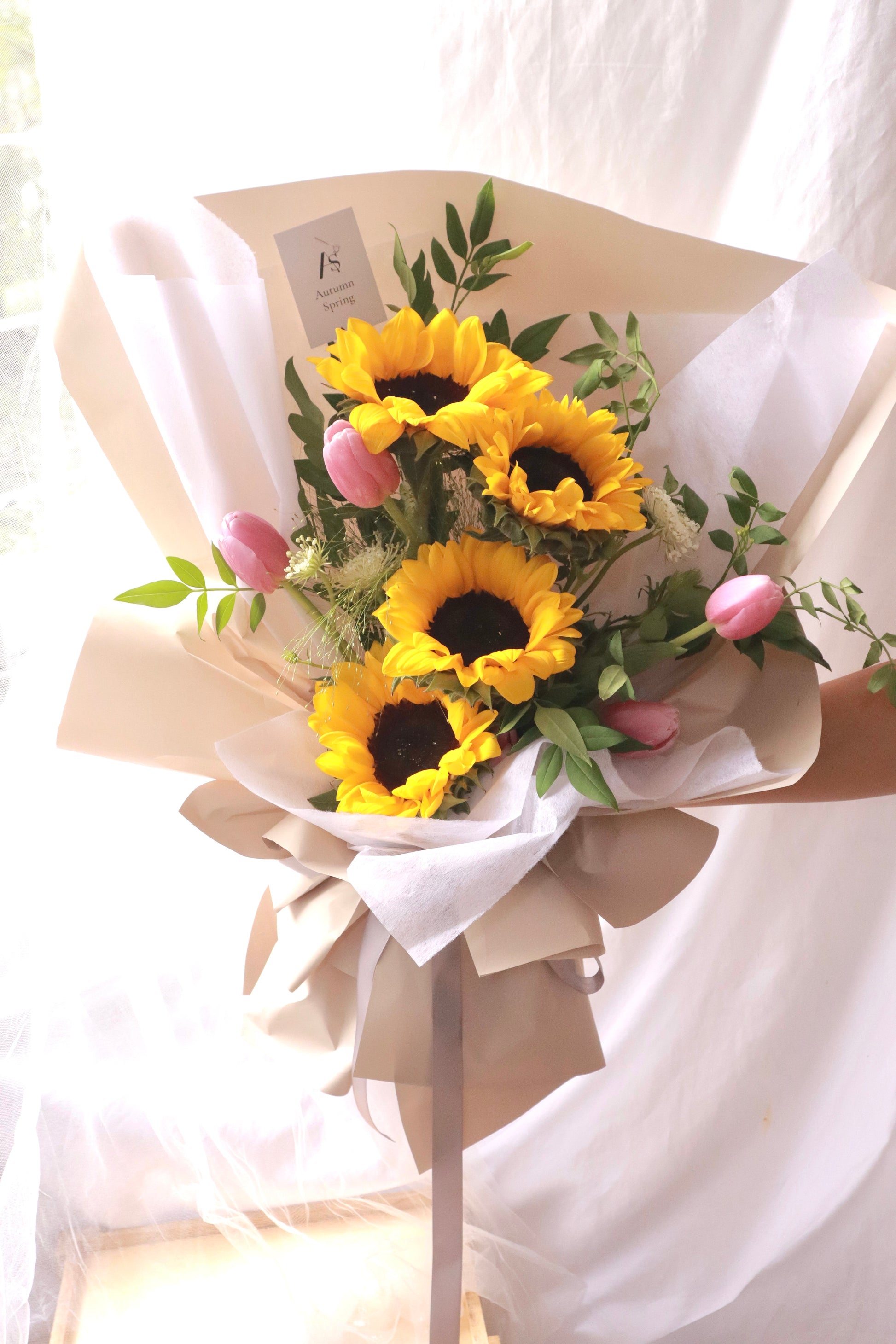 Presenting the Eirene Sunflower Bouquet, combining the bold presence of sunflowers with the soft elegance of pink tulips. This bouquet radiates joy and sophistication, ideal for celebrations with its striking color contrast and carefully curated floral composition.