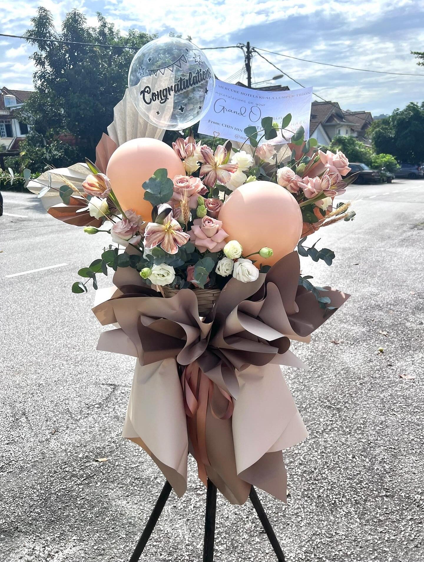 Introducing the Big Celebration Elegant Grand Opening Flower Stand, featuring stunning brown ombre flowers and vibrant latex balloons. Perfect for grand openings, this eye-catching arrangement exudes elegance and festivity, making a memorable statement for any special occasion.