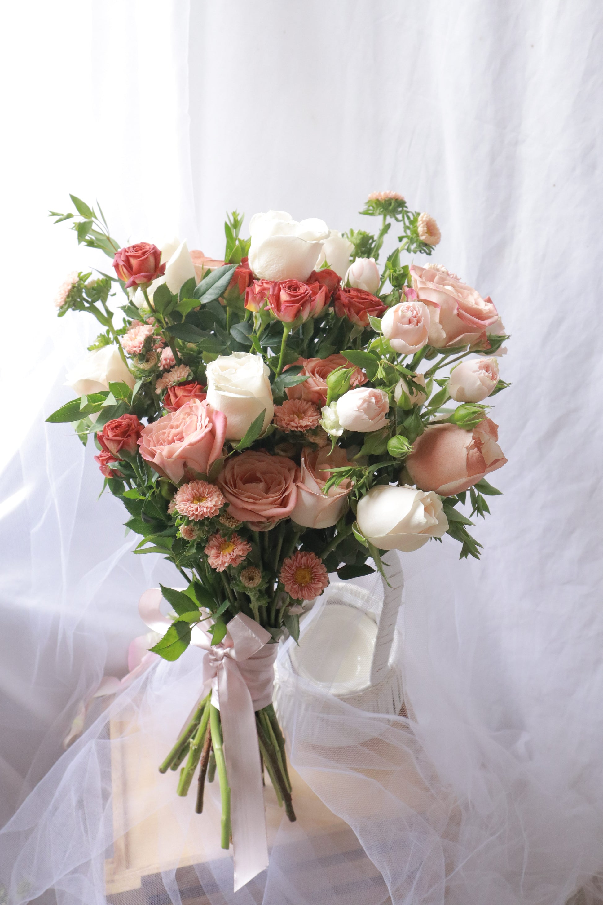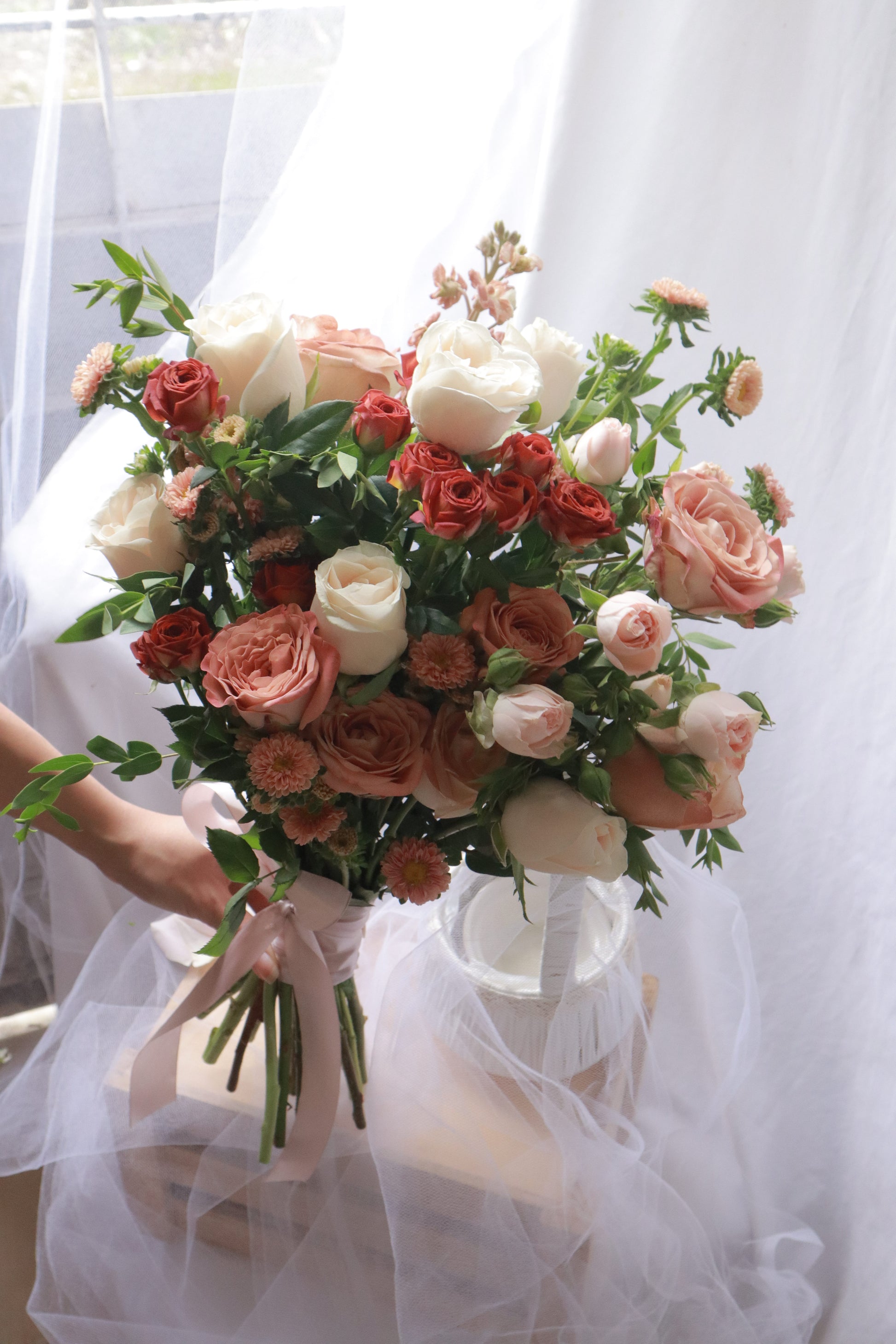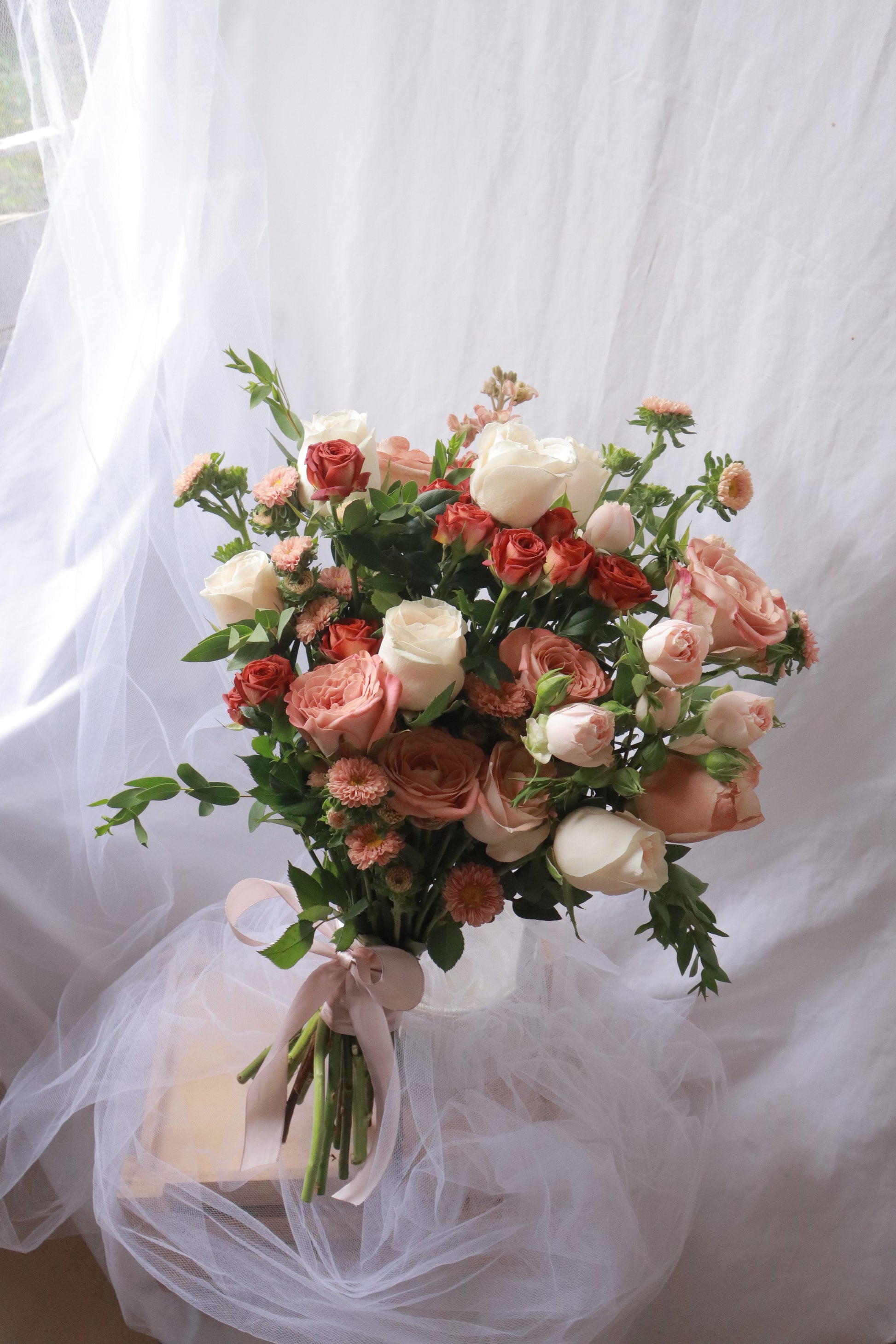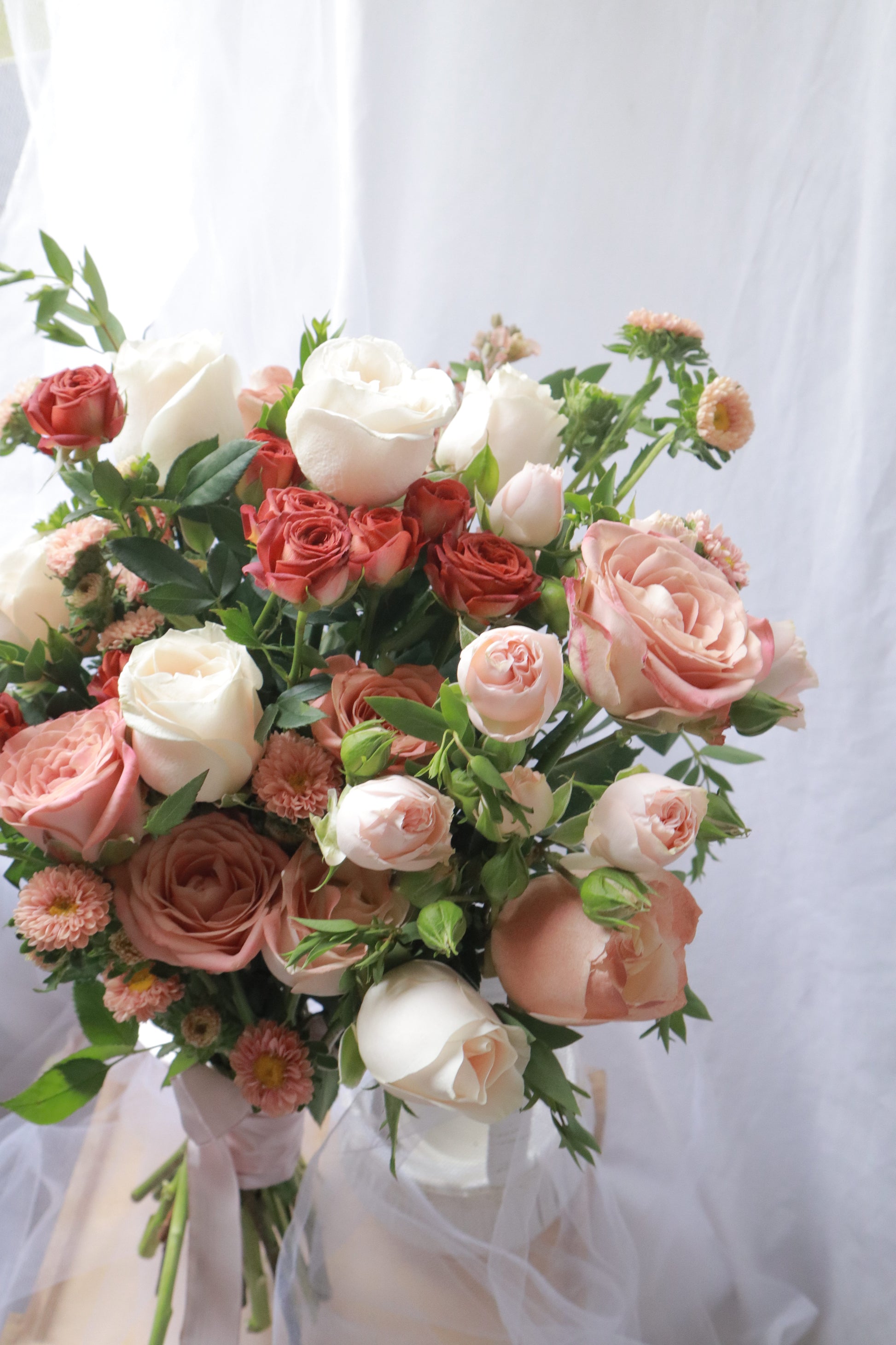 White Rose, Cappuccino Rose, Pink Rose spray, Salmon Pom Pom, Cappuccino Rose spray, Eucalyptus leaves