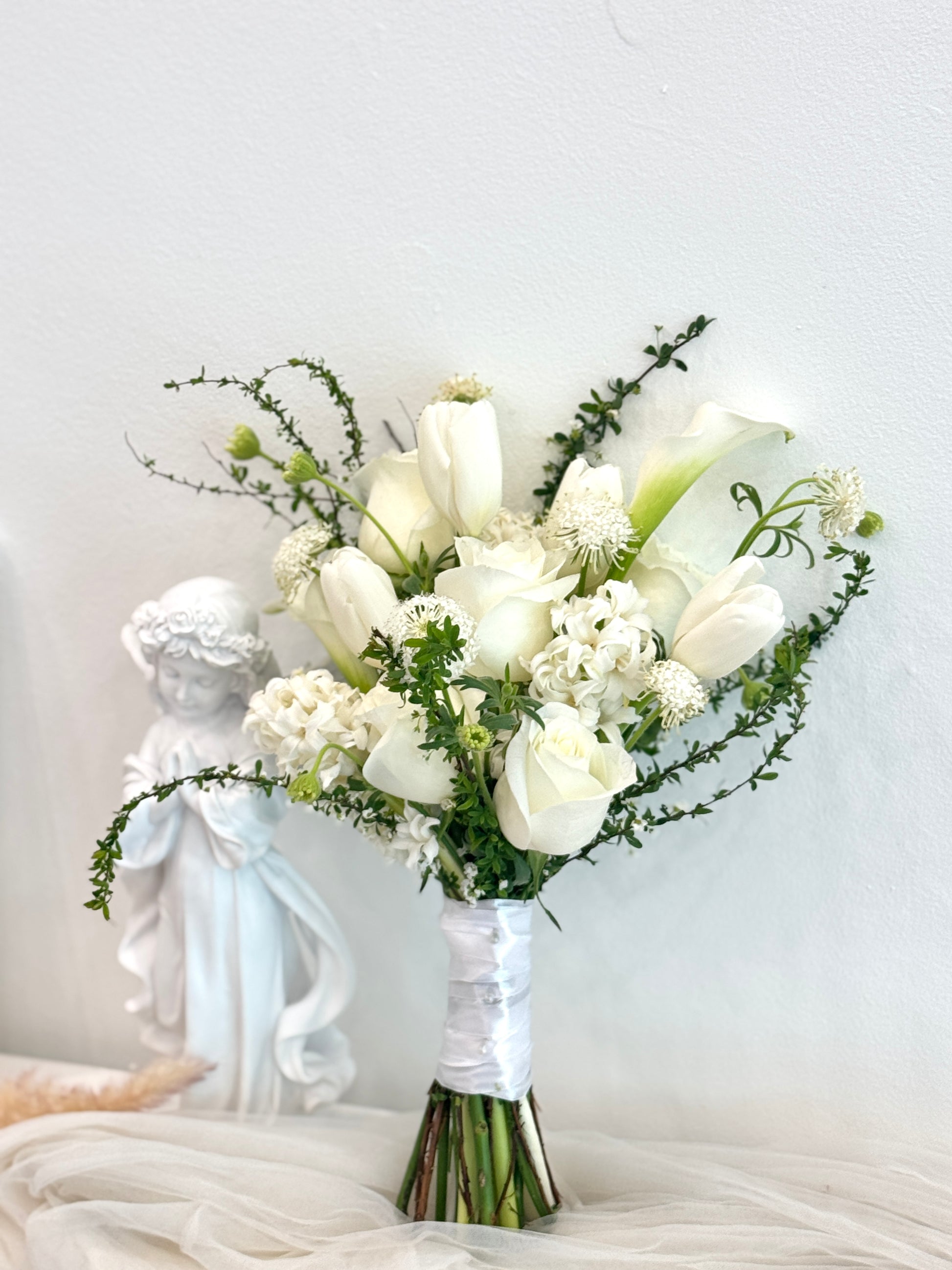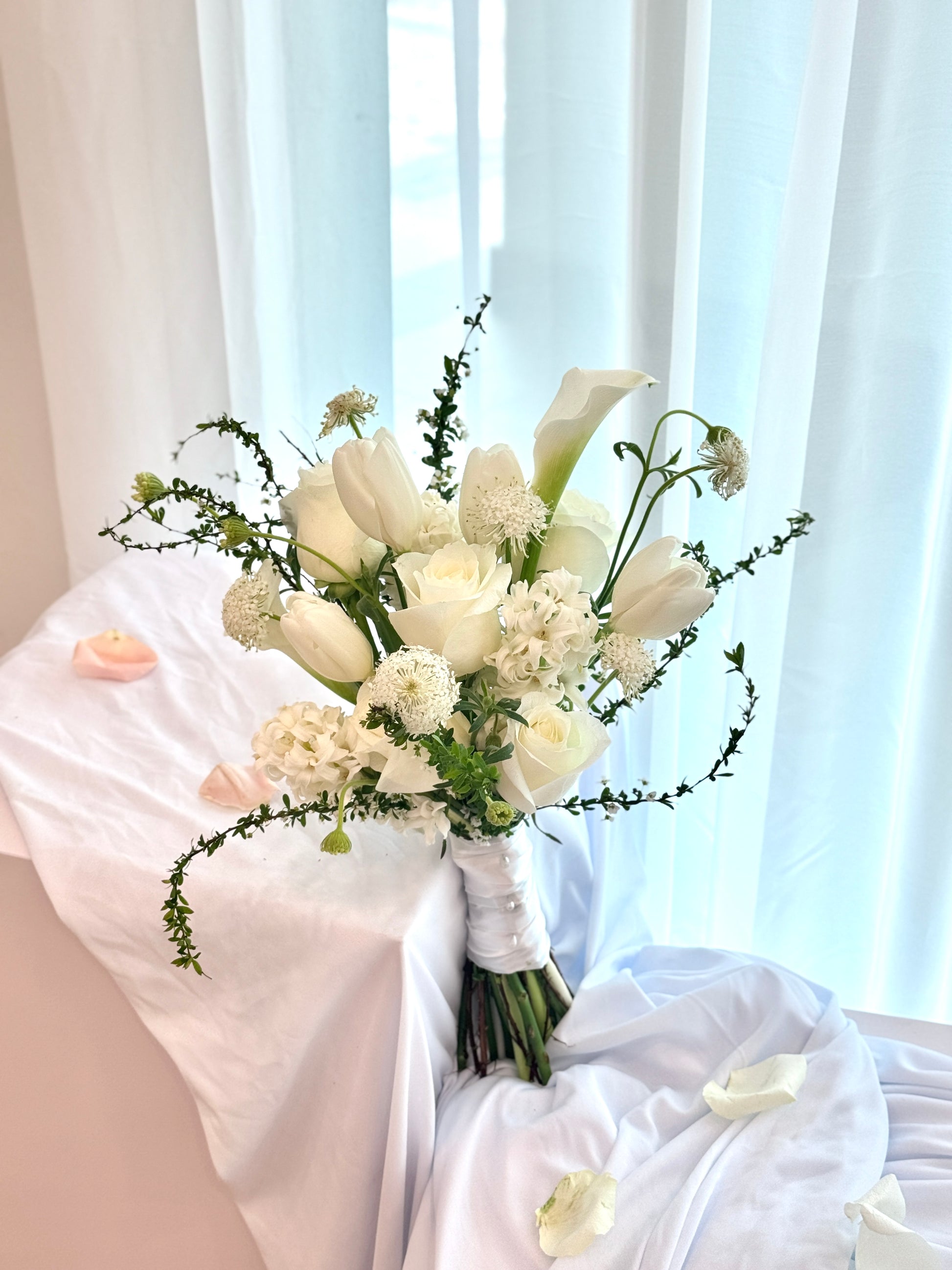 The loosely gathered, hand-tied style offers a romantic, airy feel — perfect for modern weddings with a minimalist or garden theme.