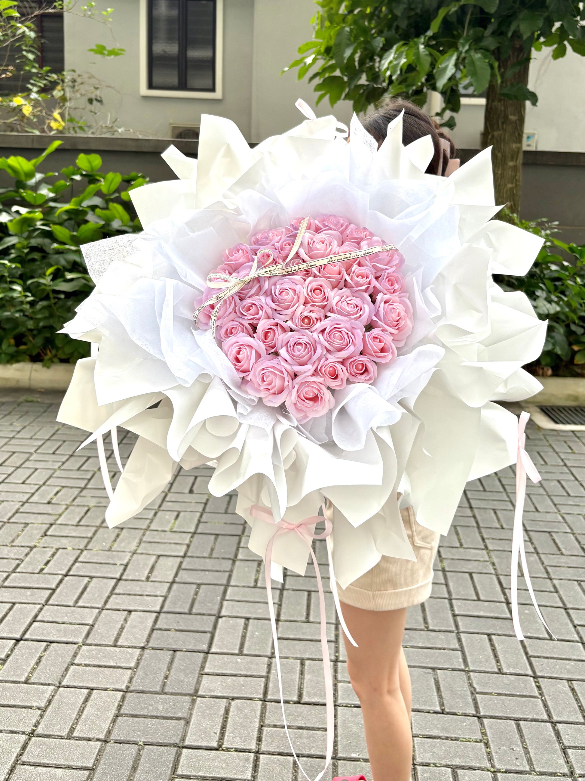 A bouquet of 33 beautifully crafted pink soap roses, symbolizing affection and appreciation. Wrapped elegantly in a crisp white wrapper for a soft, clean finish — perfect for anniversaries, birthdays, or simply to say “you’re cherished.”