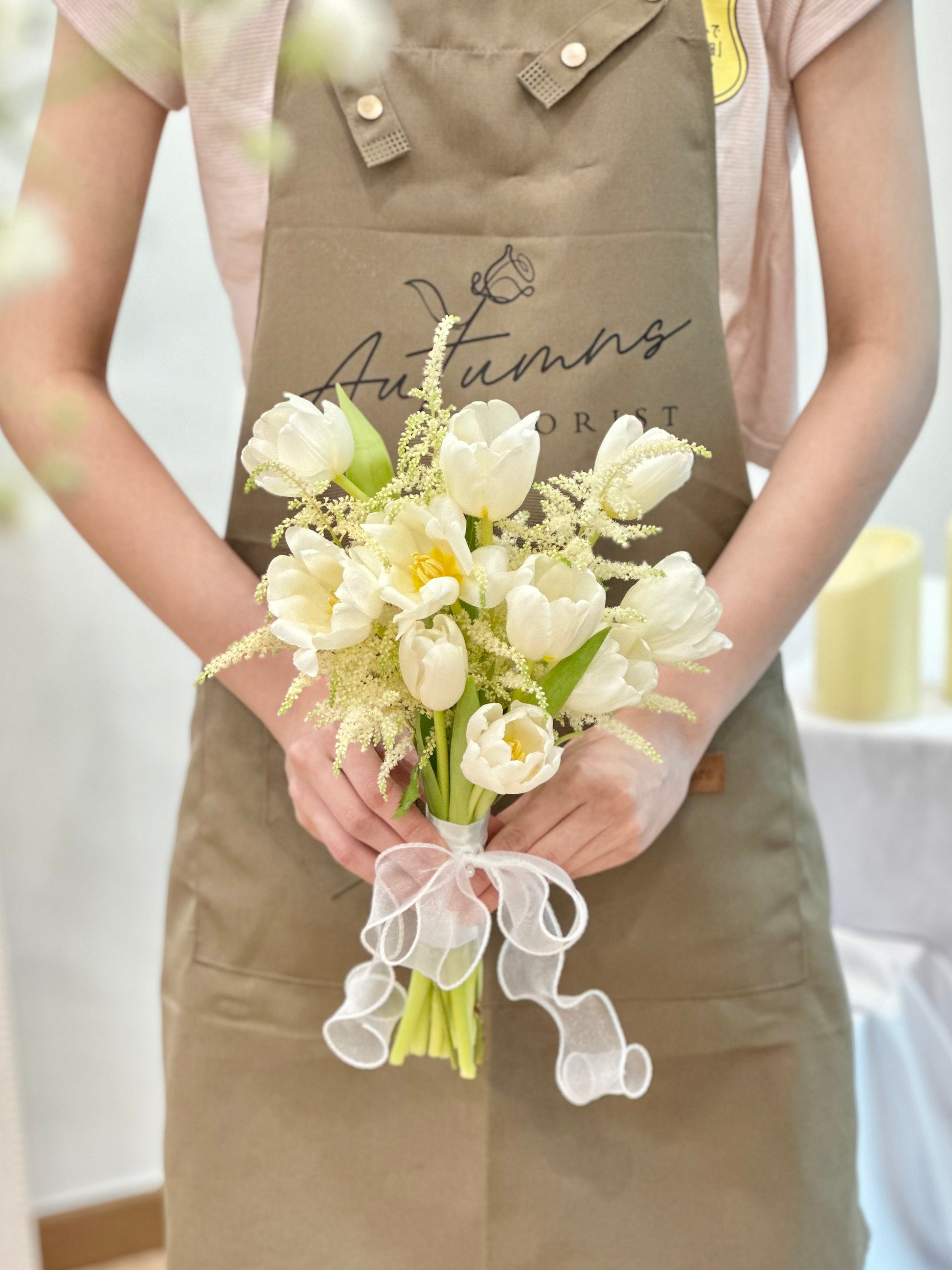Elegant and pure, this bouquet of white tulips symbolizes new beginnings, sincere love, and timeless grace. With its minimalist charm and soft beauty, it’s the perfect match for a modern or classic bride. Simple yet meaningful — a quiet promise held in every bloom.