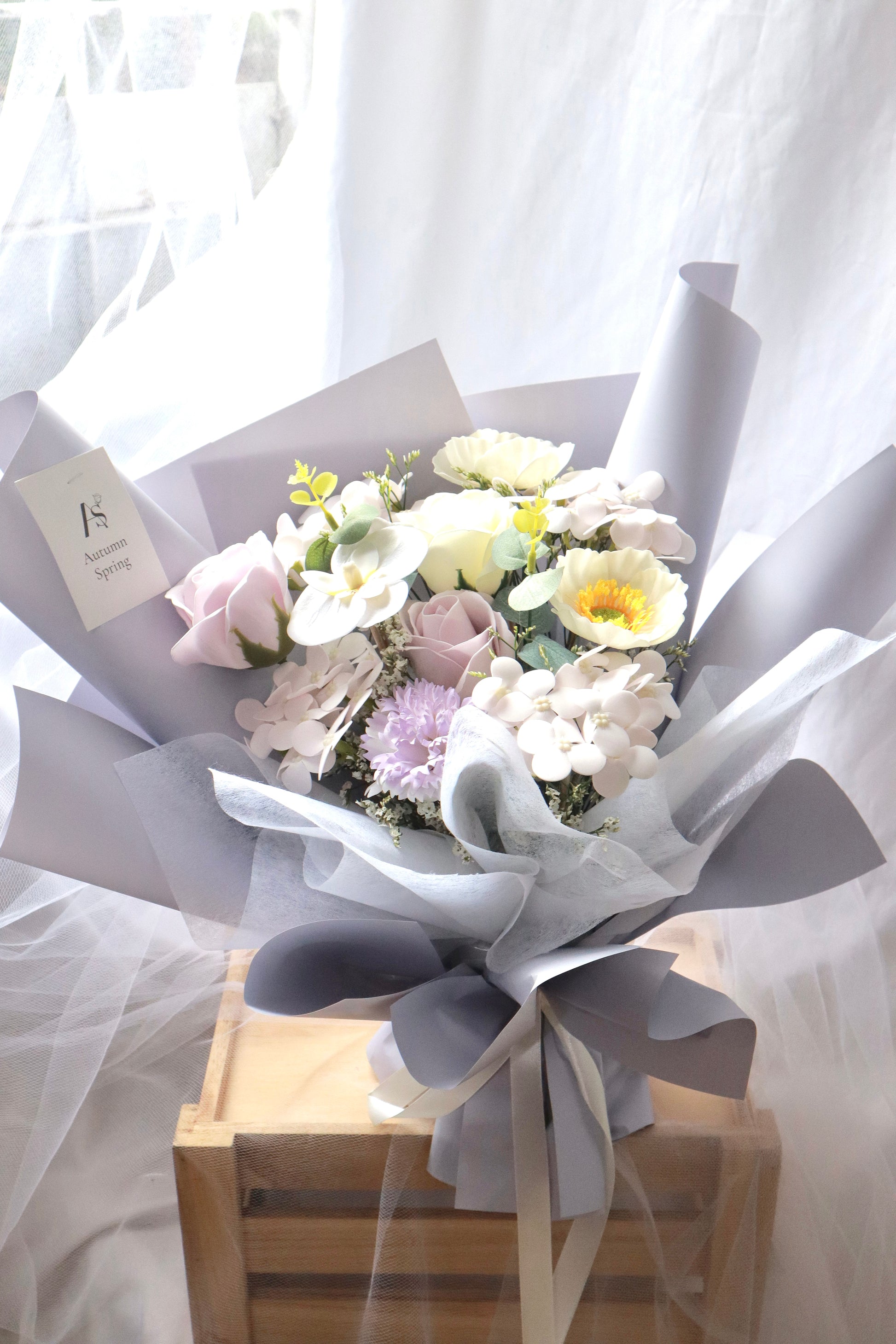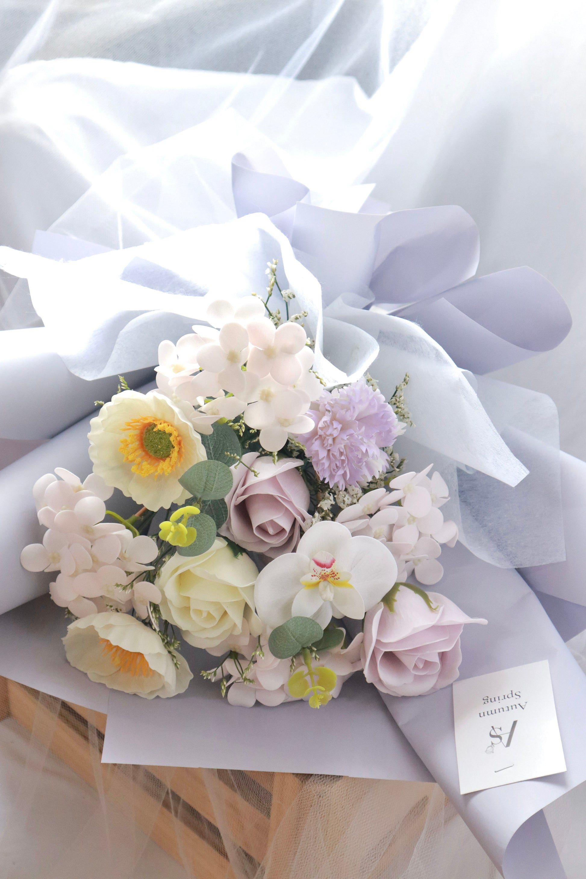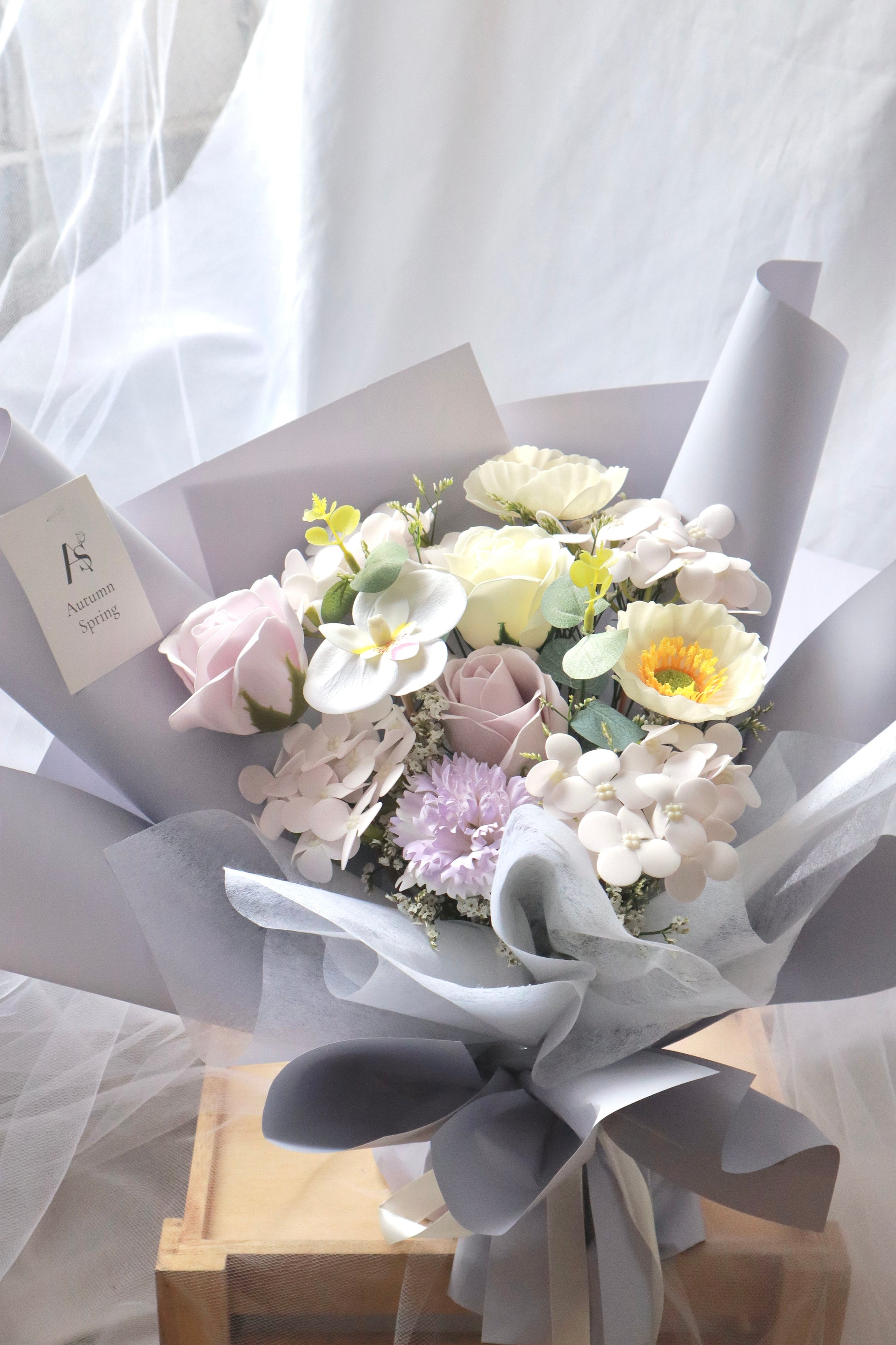 The Francesca Purple Soap Flower Bouquet is a luxurious arrangement of soft purples hue, exuding elegance and charm. This beautifully crafted bouquet, with its rich hues and delicate design, adds a touch of sophistication to any special occasion.