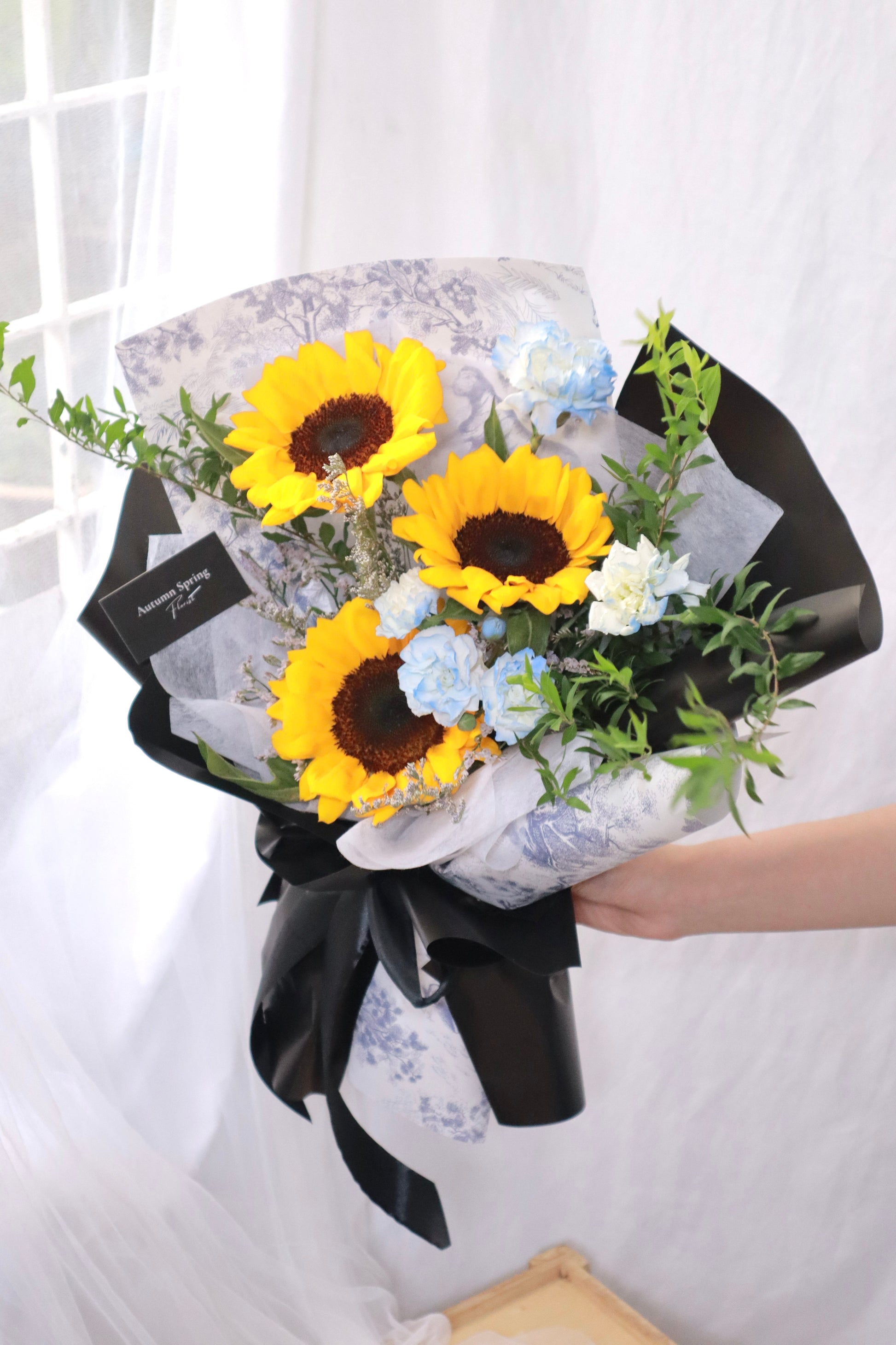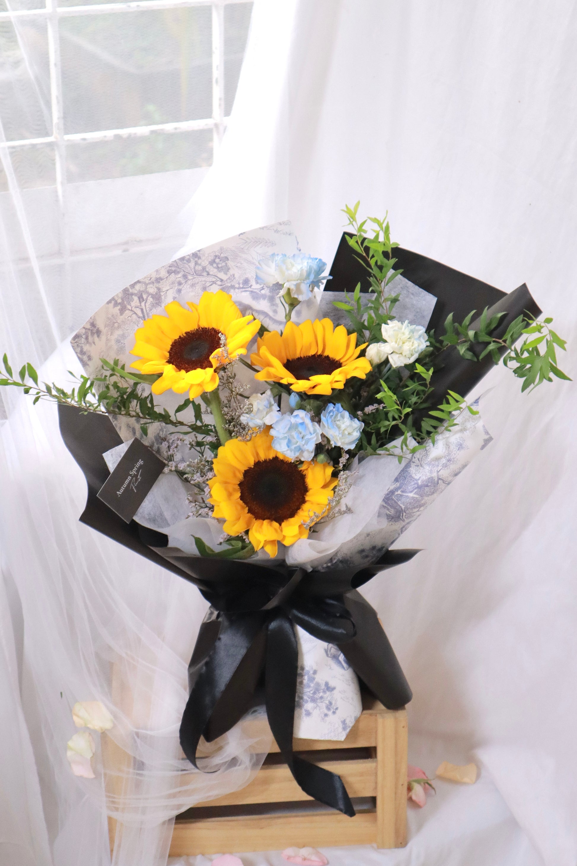 Brighten any space with the Francesca Sunflower Bouquet. This eye-catching arrangement blends vibrant yellows with pops of deep blue and soft purple, creating a cheerful and uplifting display. Perfect for adding warmth and color to any occasion.