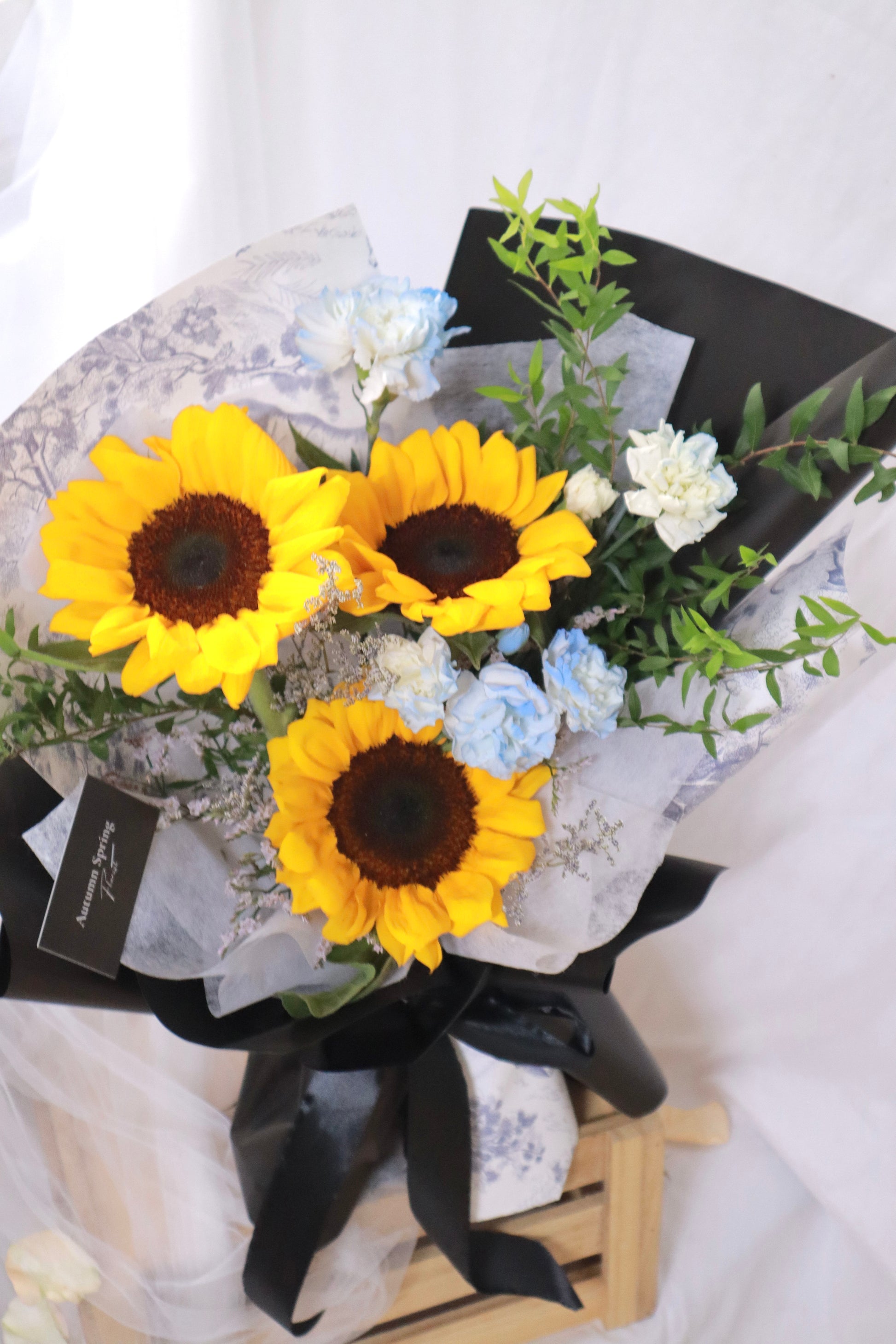 Sunflower, Casphia Purple, Blue Dyed Carnation Spray