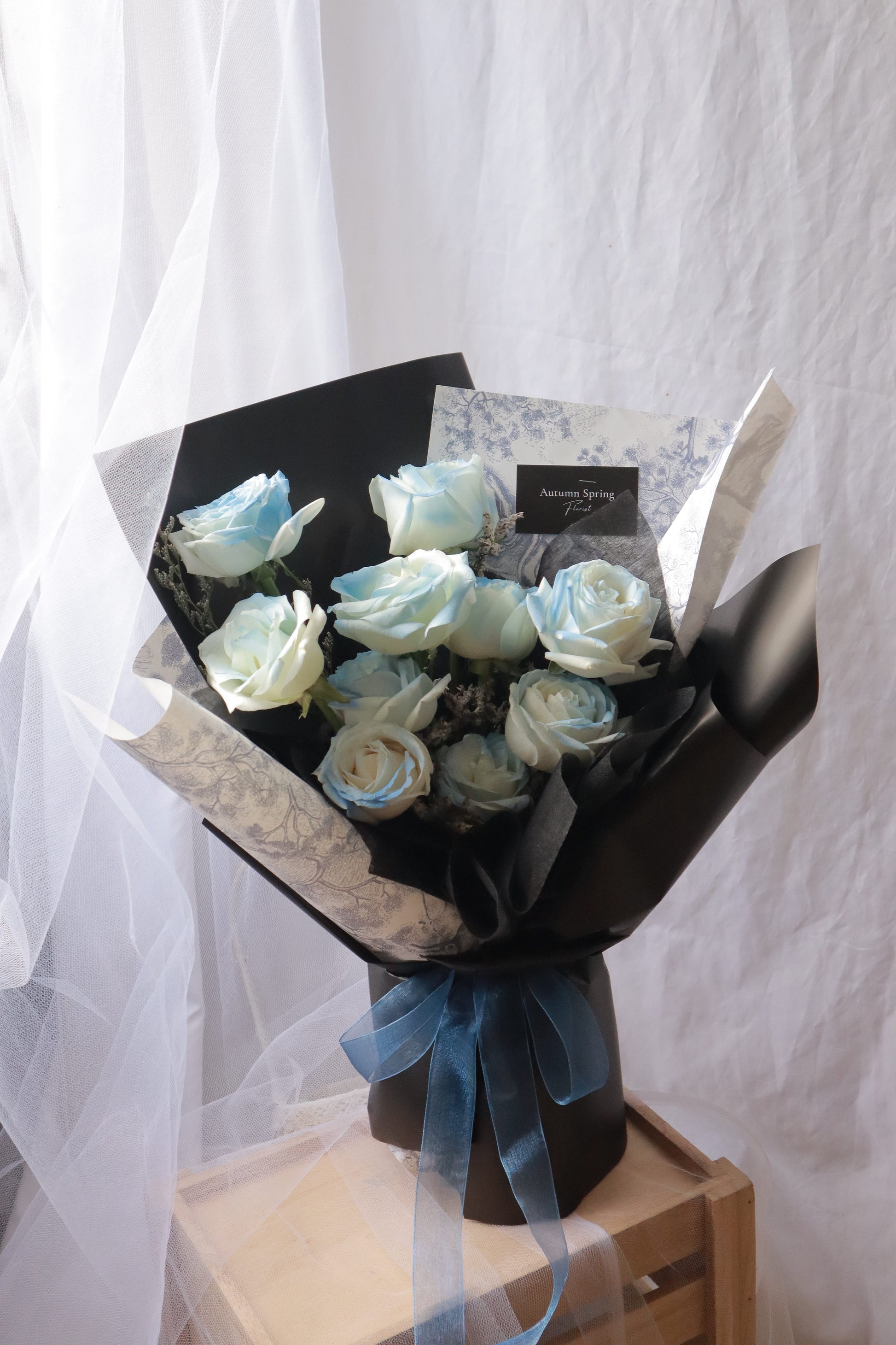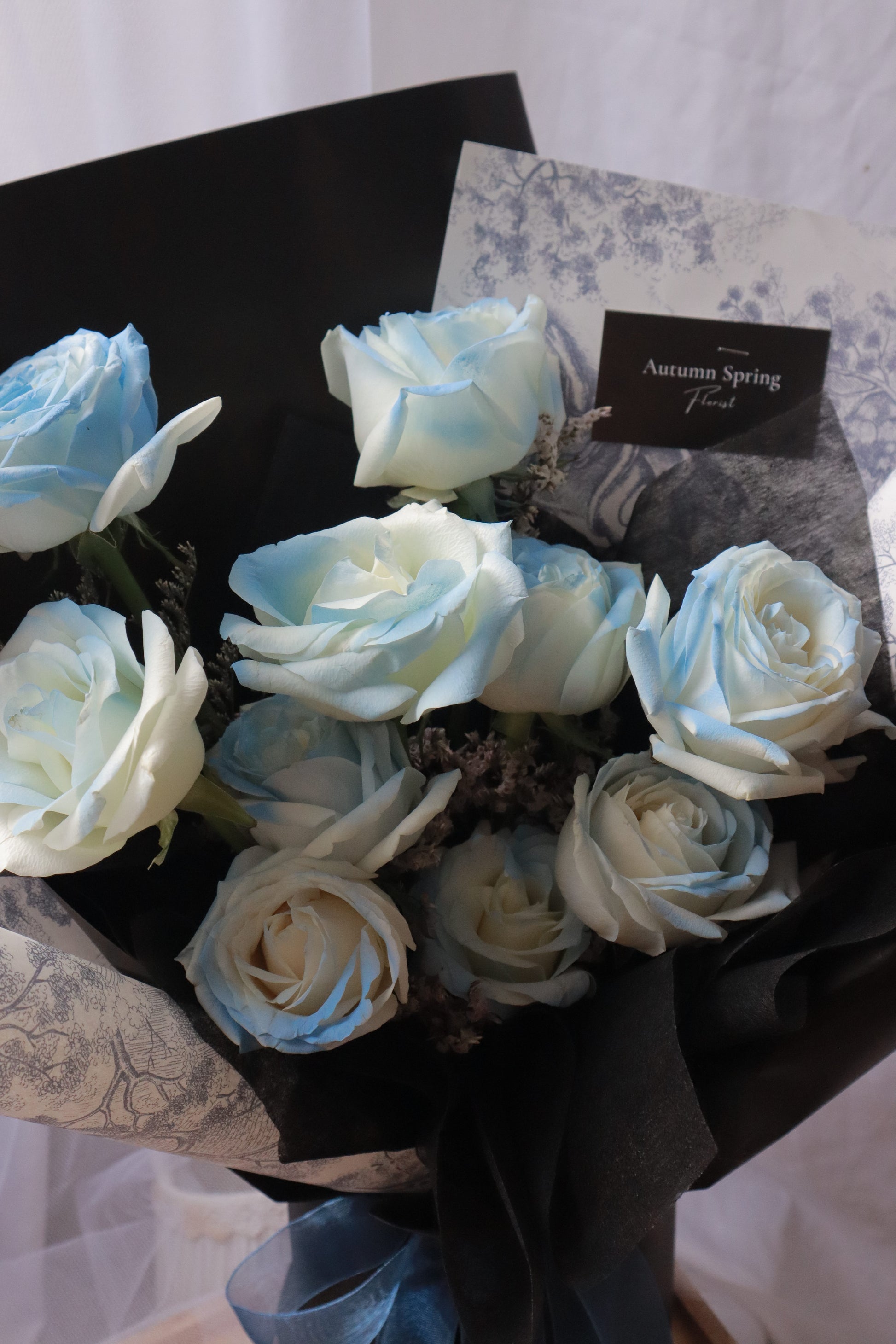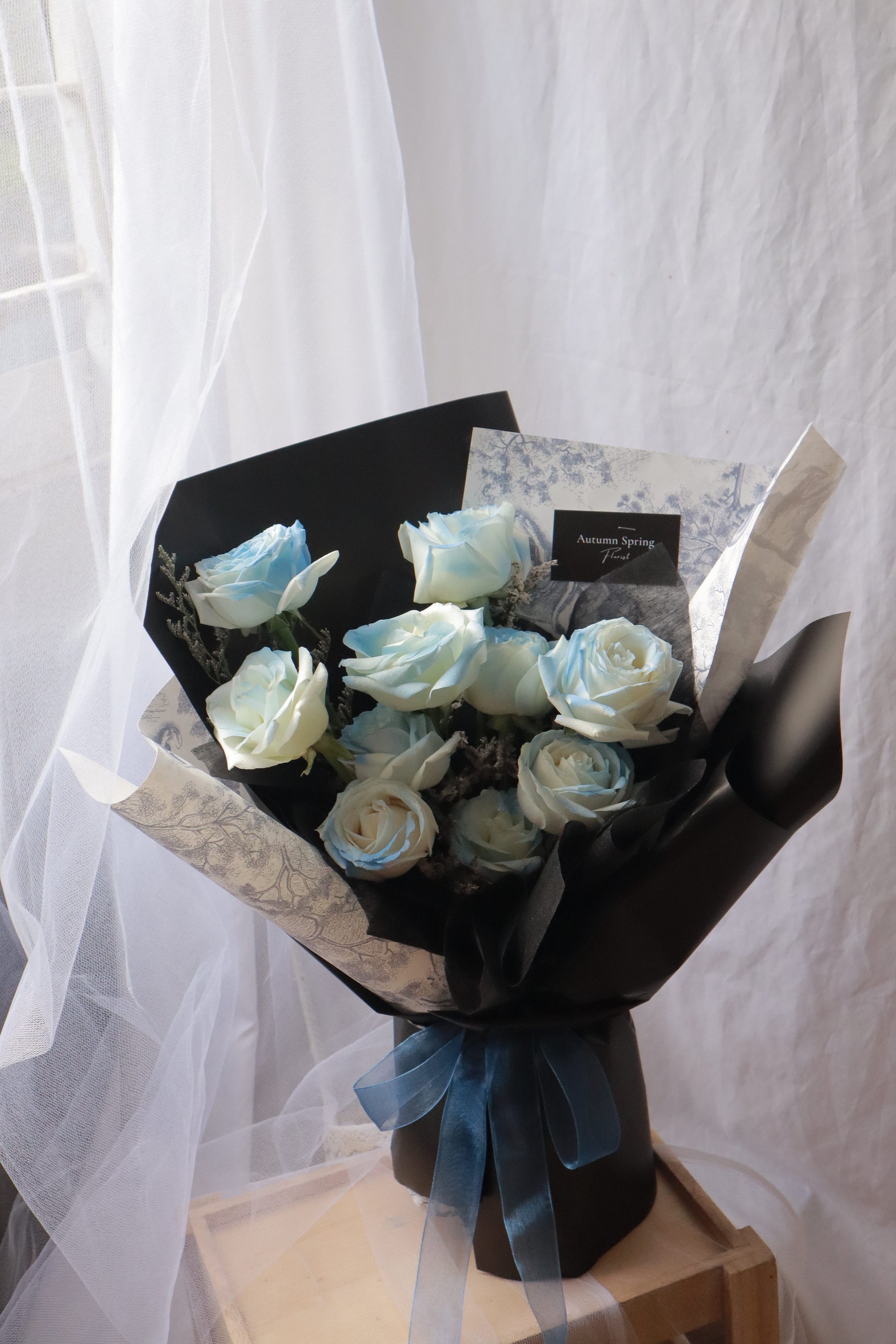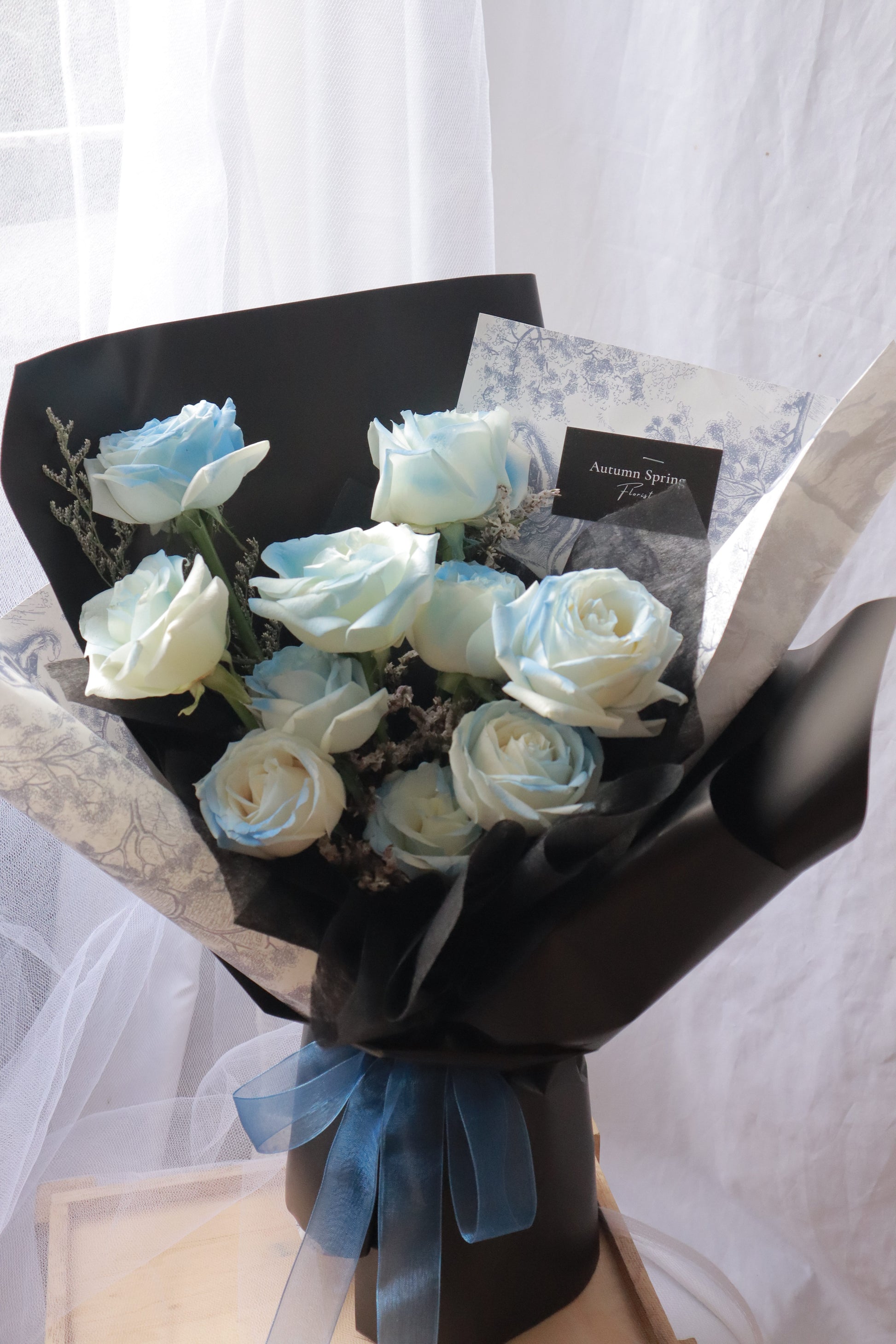 The Friedrich Blue Sprayed Rose Bouquet features a striking combination of deep blue hues. This captivating arrangement offers a bold, modern aesthetic, perfect for making a statement in any occasions or as a unique memorable gift for him.