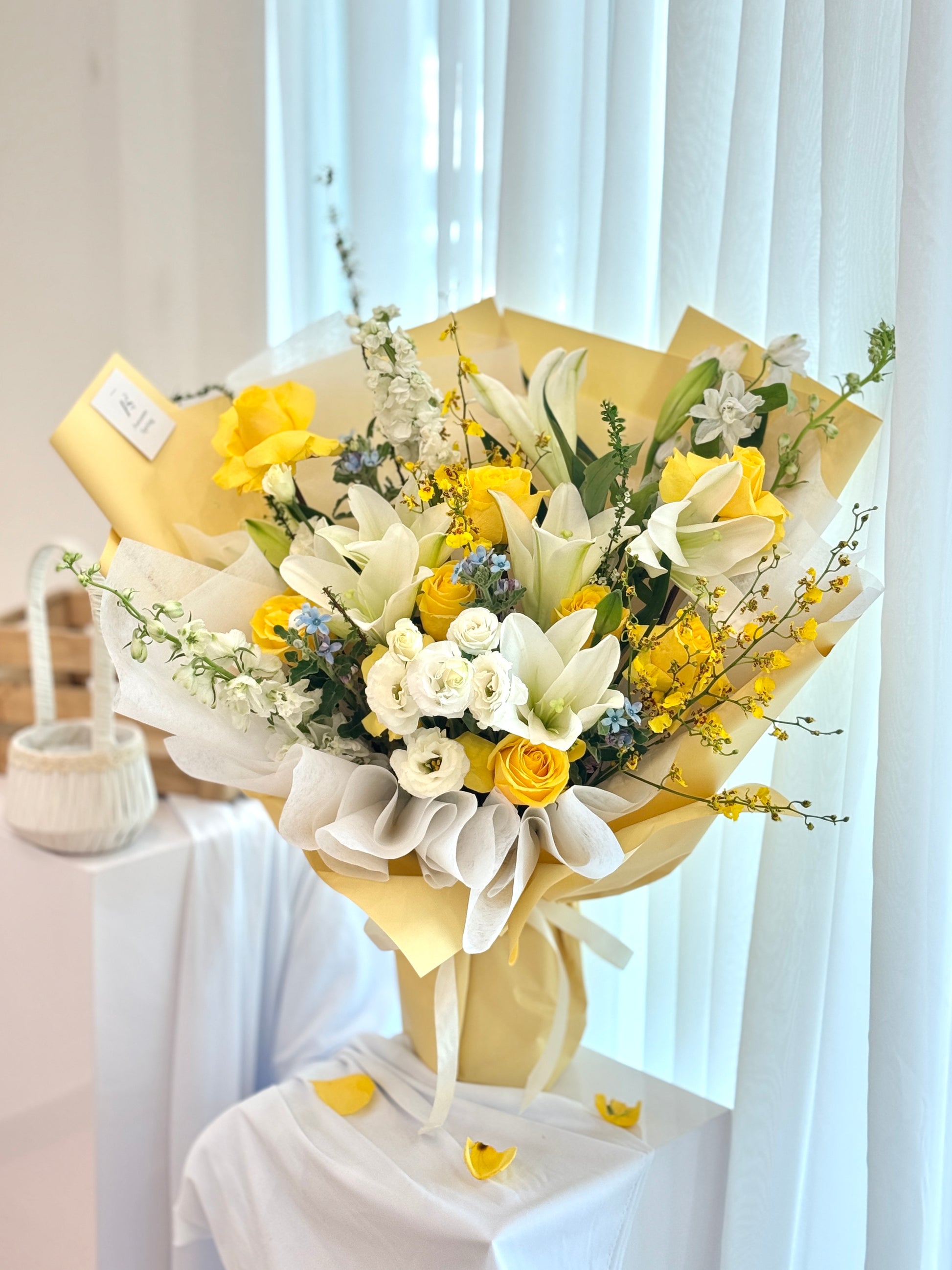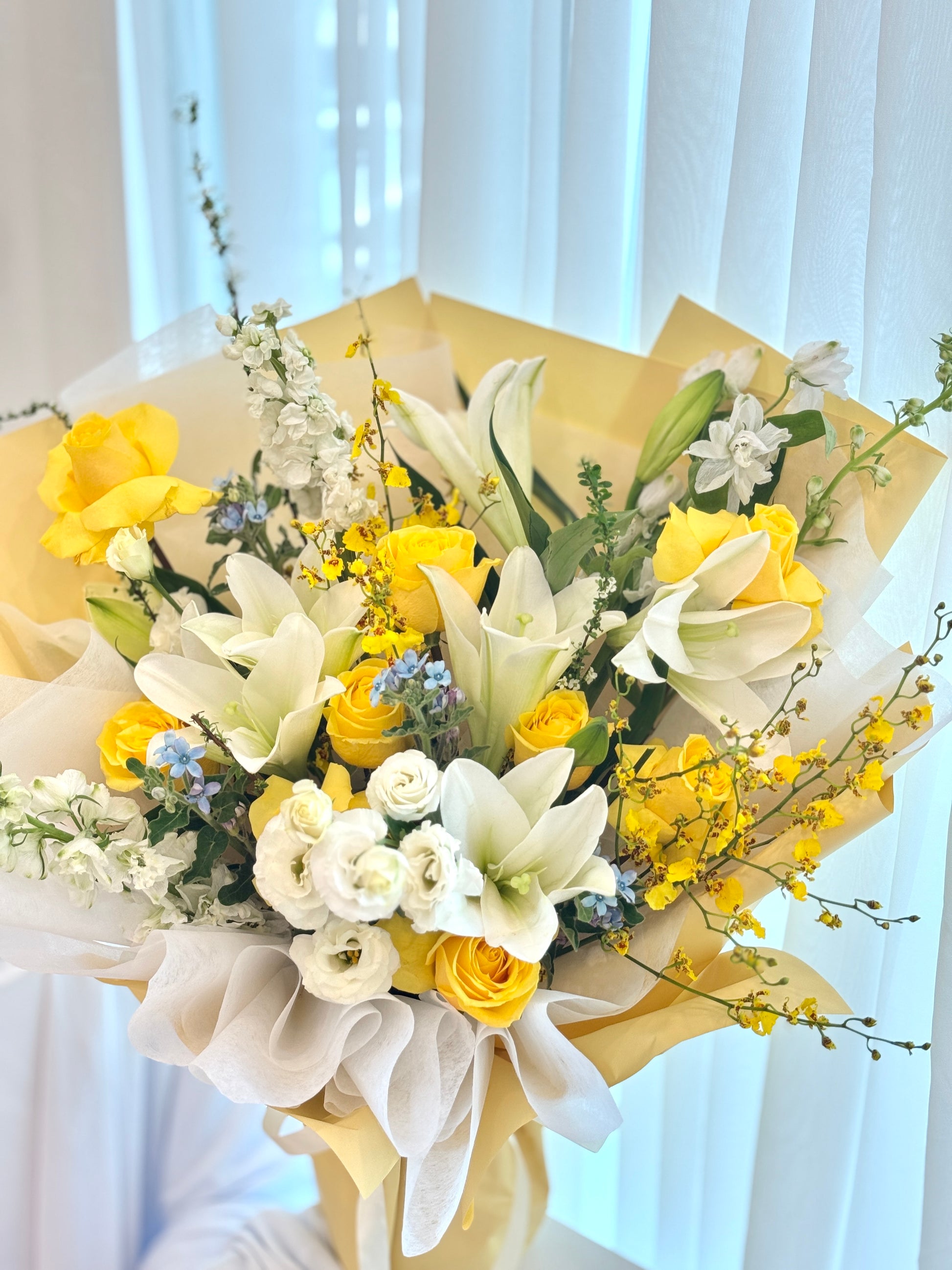 A radiant blend of yellow roses, pure white eustoma, elegant lilies, and lively dancing lady orchids — all wrapped in vibrant yellow paper. This bouquet symbolizes warmth, vitality, and heartfelt blessings. Perfect for celebrations, grand openings, or to brighten someone's day with a touch of sunshine