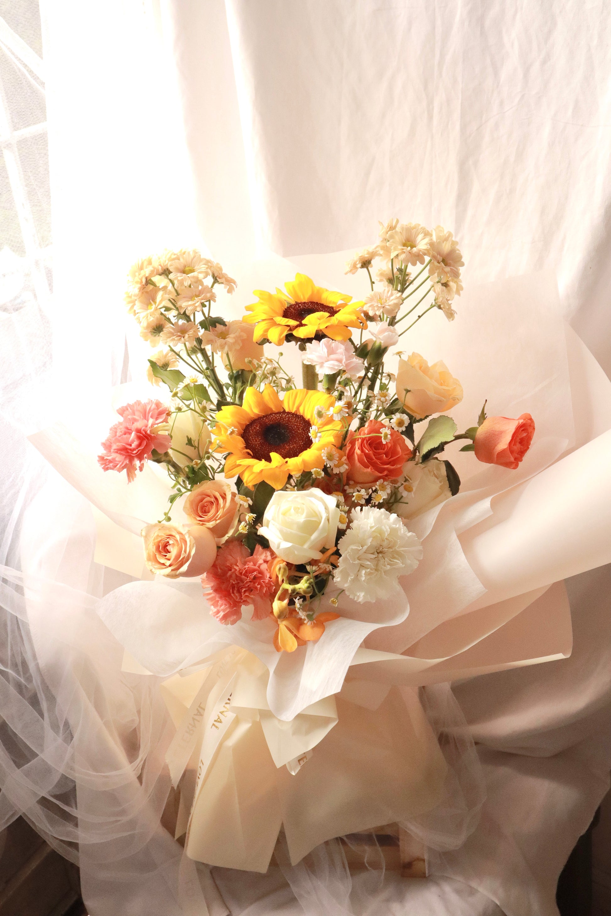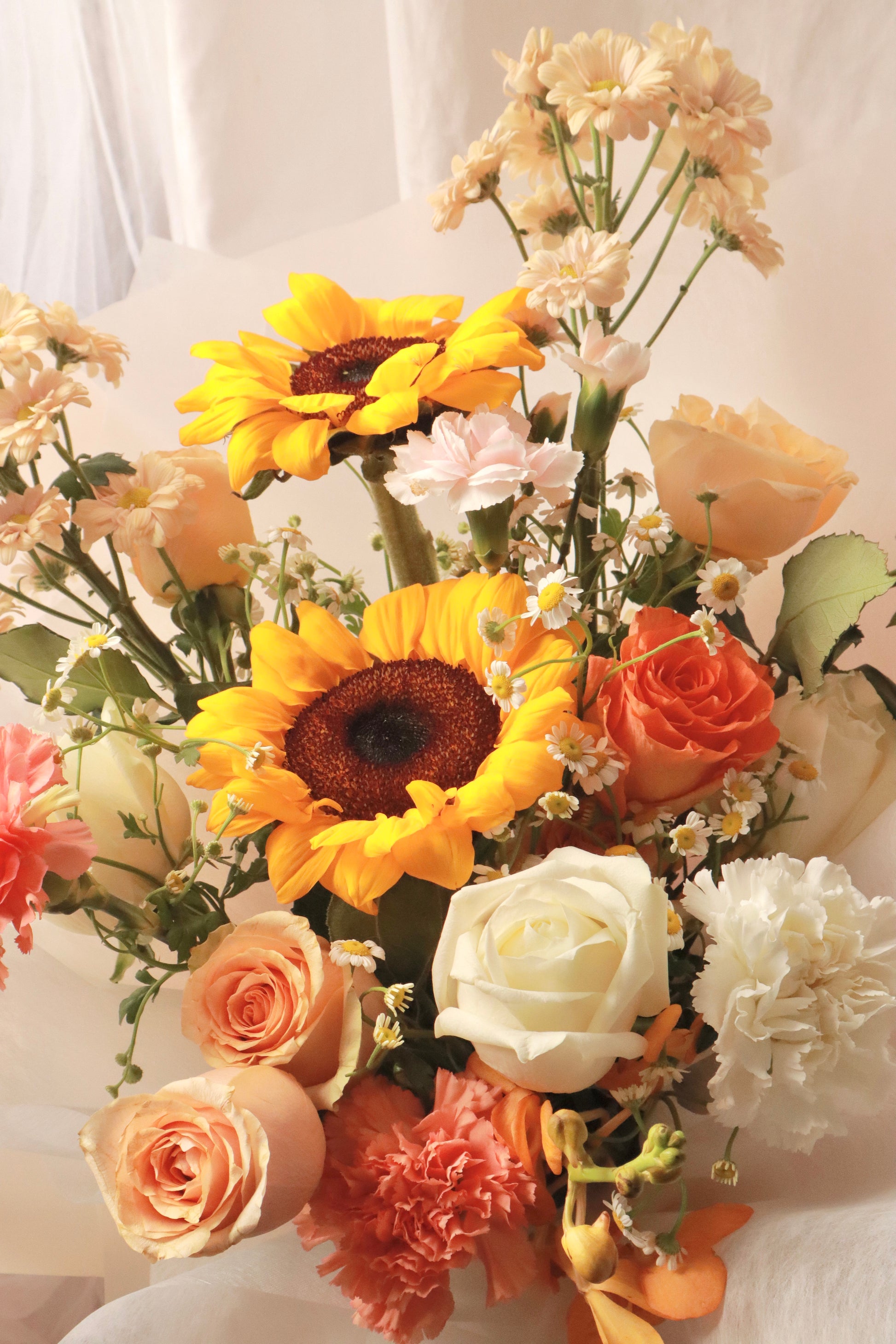 Sunflower, Champagne Rose, White Rose, Chamomile, Pink Carnation, White Carnation Spray, Rossi Salmon Pom Pom