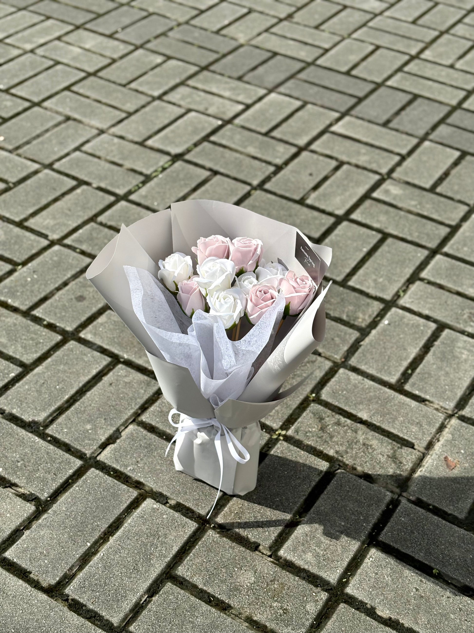 This elegant bouquet of purple and white soap flowers, wrapped in a soft grey wrapper, captures the perfect balance of beauty and calm. Crafted from scented soap, these flowers are a lasting symbol of grace, making it an ideal gift for any occasion.