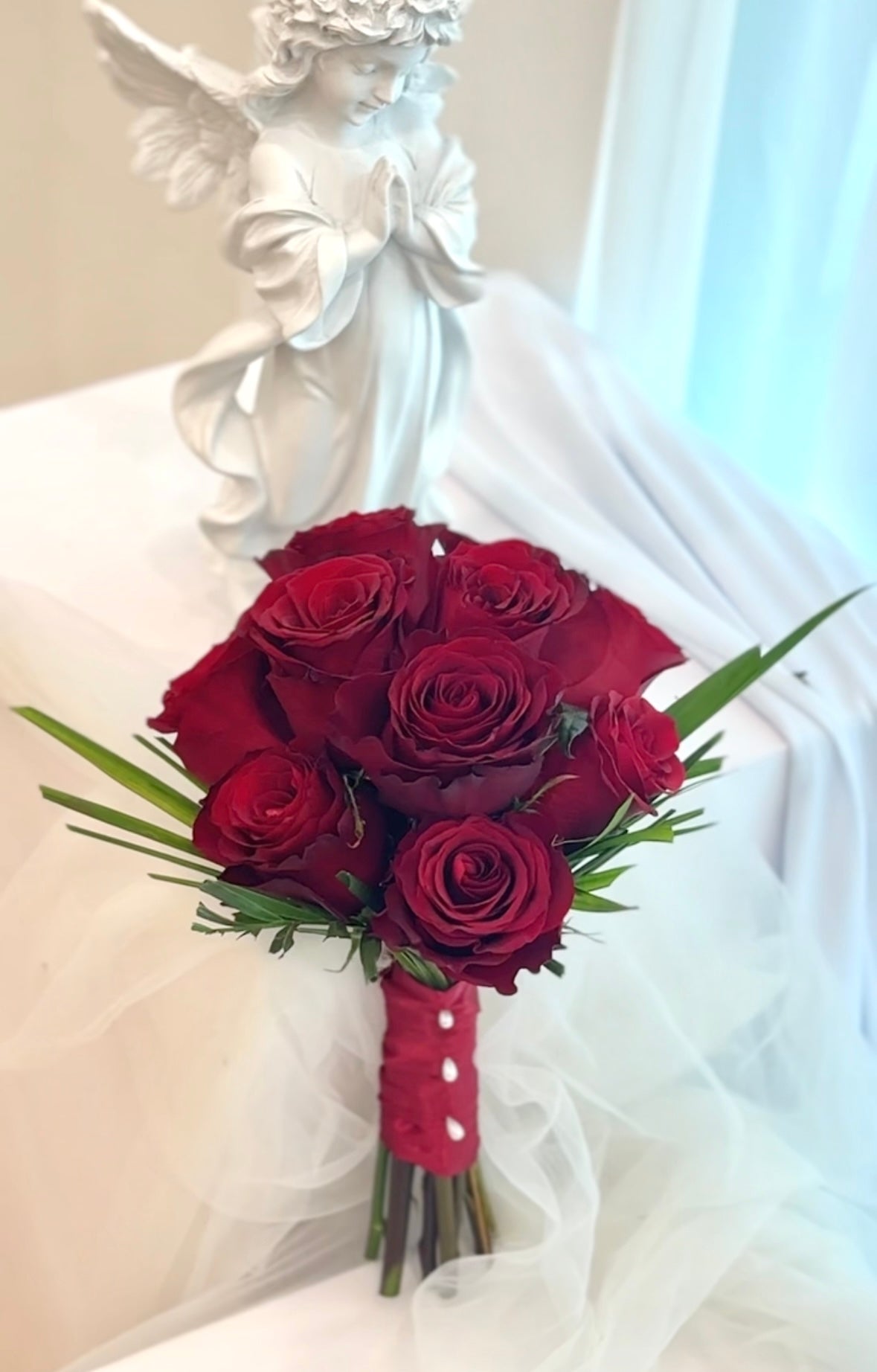 A romantic bridal bouquet of deep red roses, wrapped in satin with pearl details. Elegant, timeless, and perfect for a bride who wants to carry a touch of love and grace down the aisle.