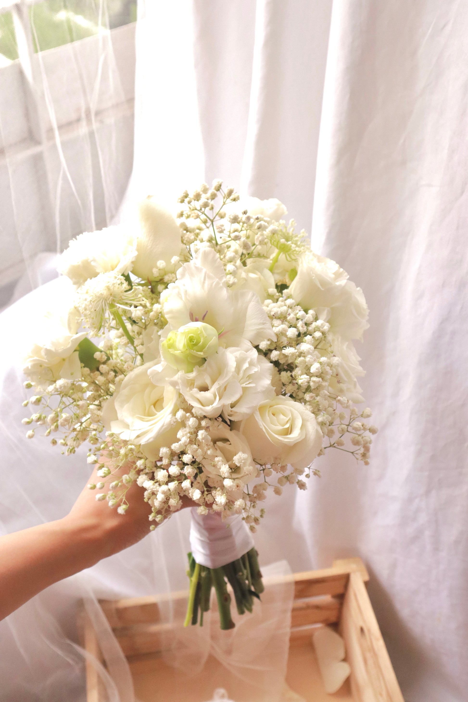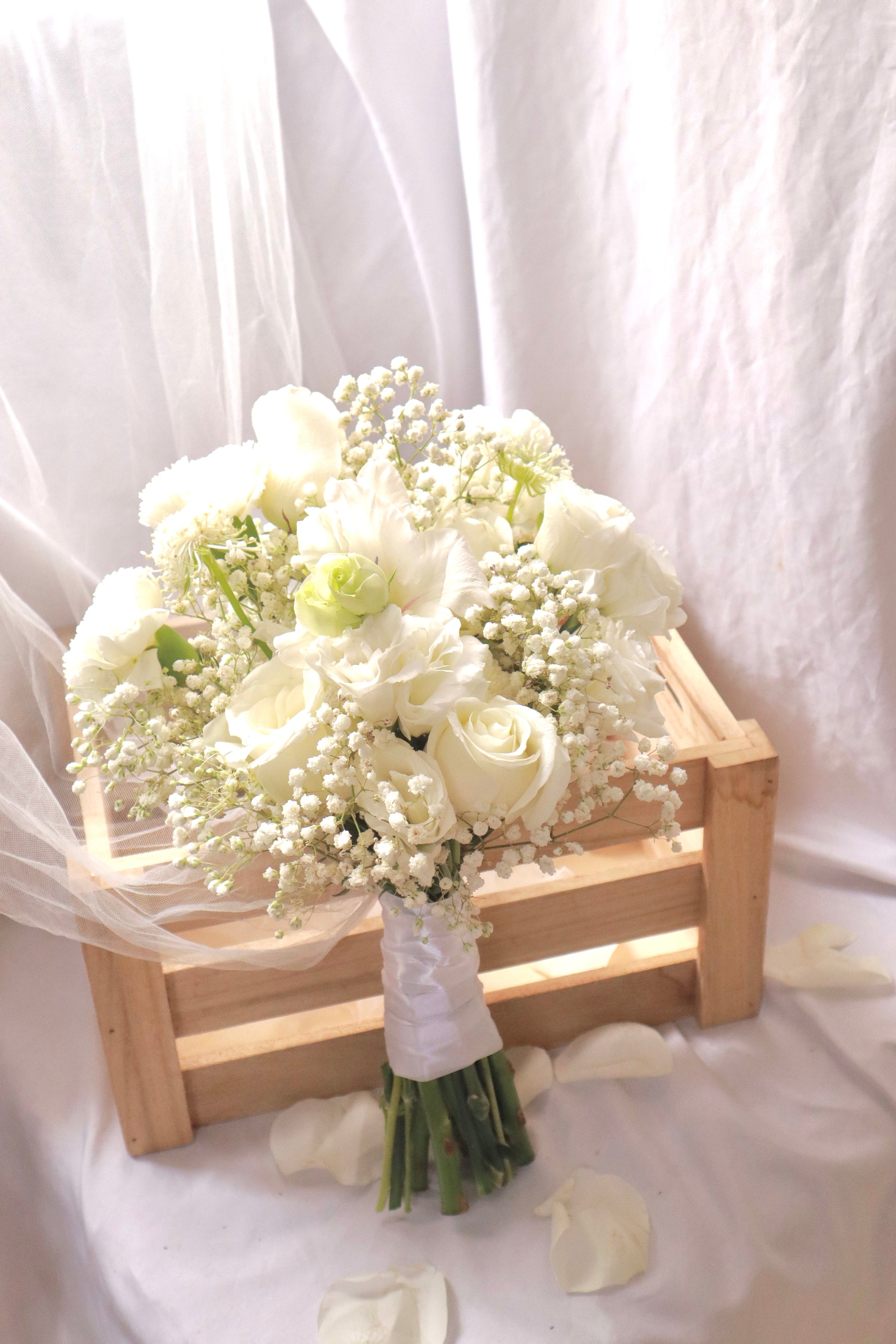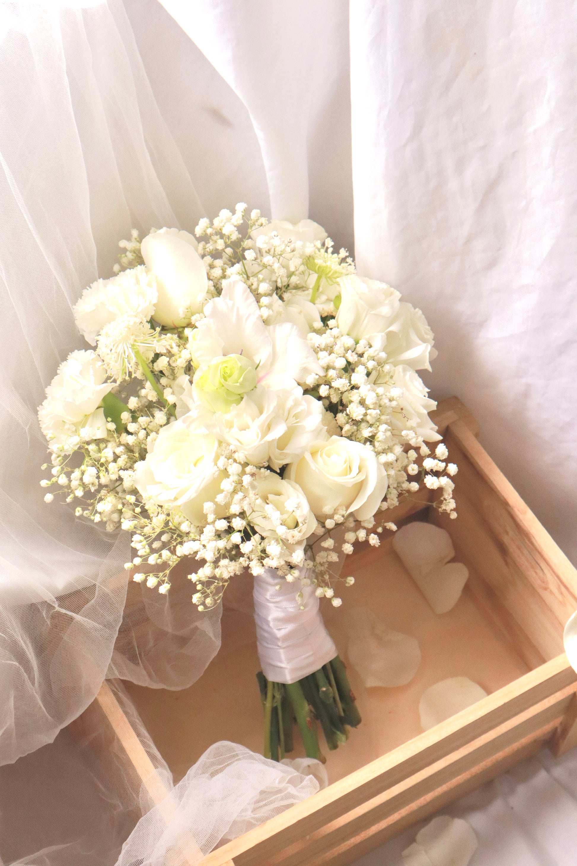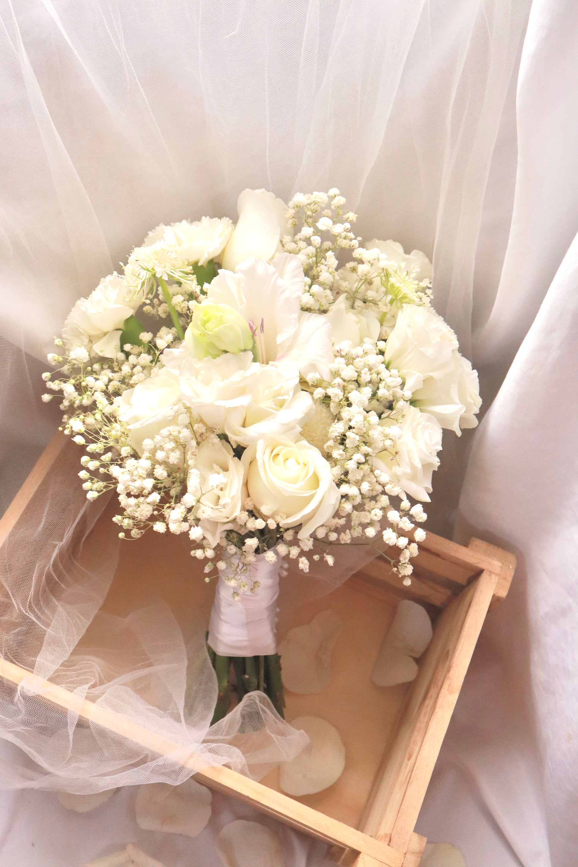 The Hera White Bridal Bouquet showcases the enchanting beauty of all-white flower combination, exuding classic and allure. This striking arrangement adds an air of elegance and sophistication to your wedding, making it perfect for brides.