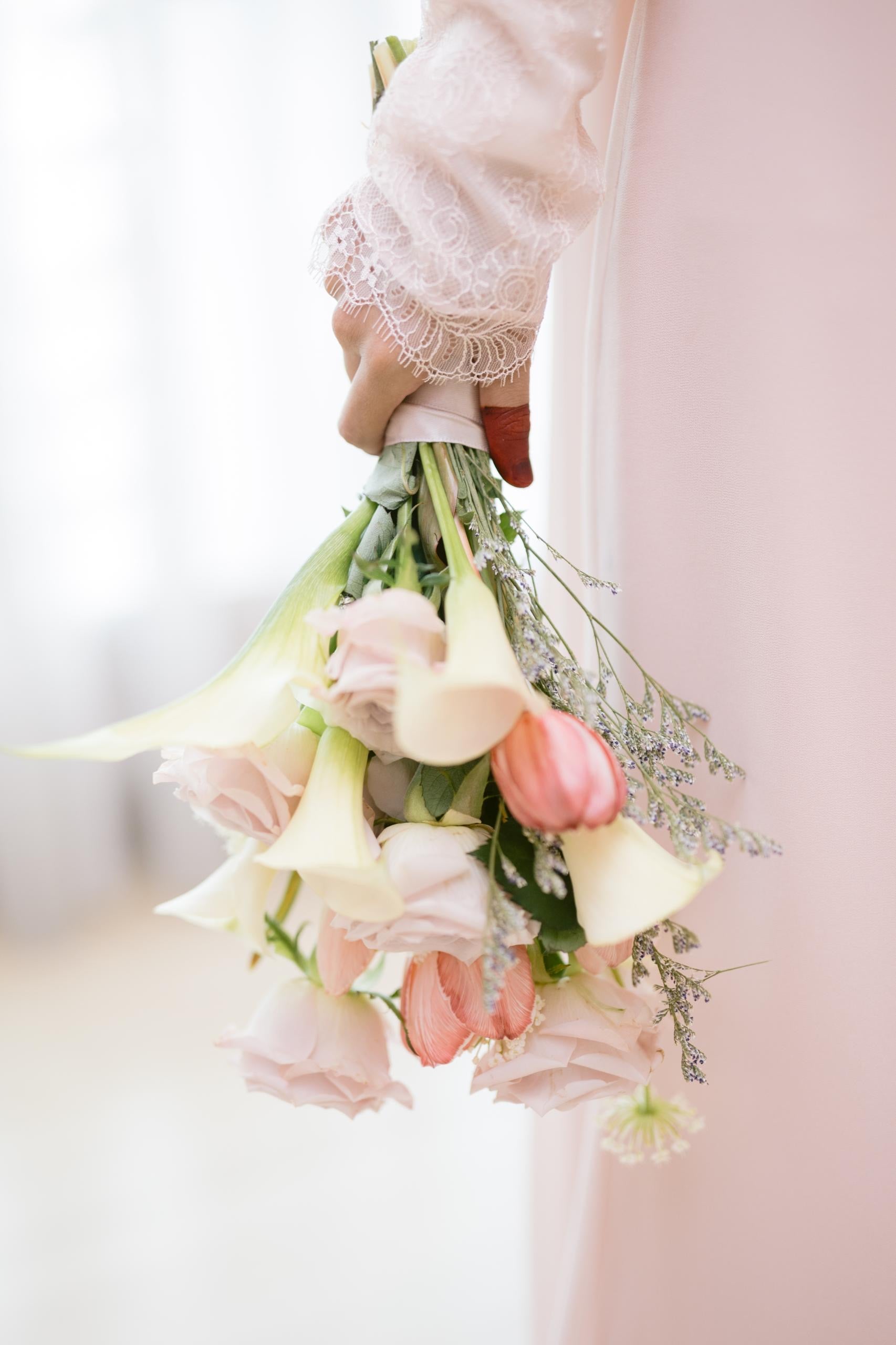 White Calla lily, Pink Rose, Peach Dyed Tulip, Casphia Purple