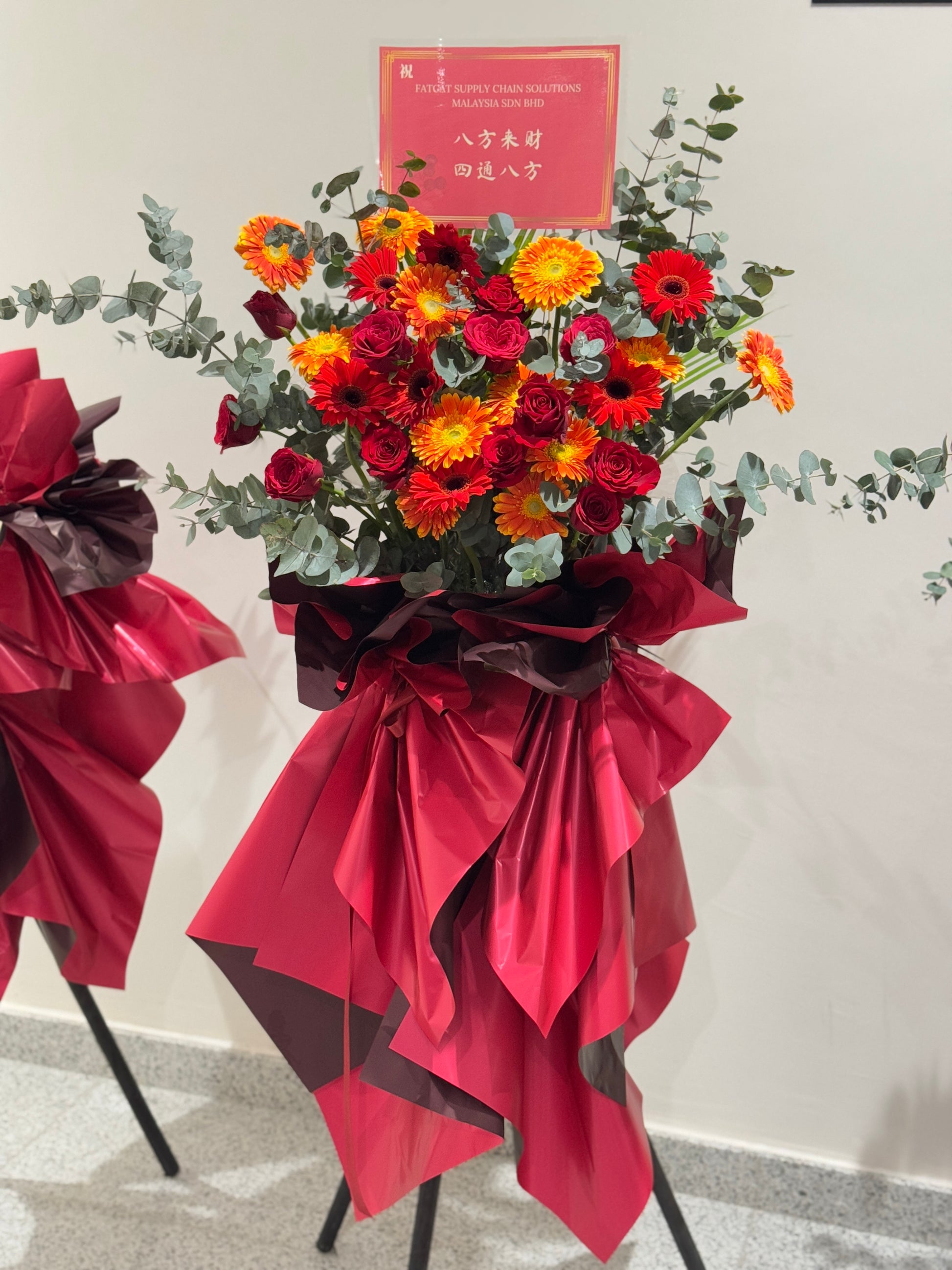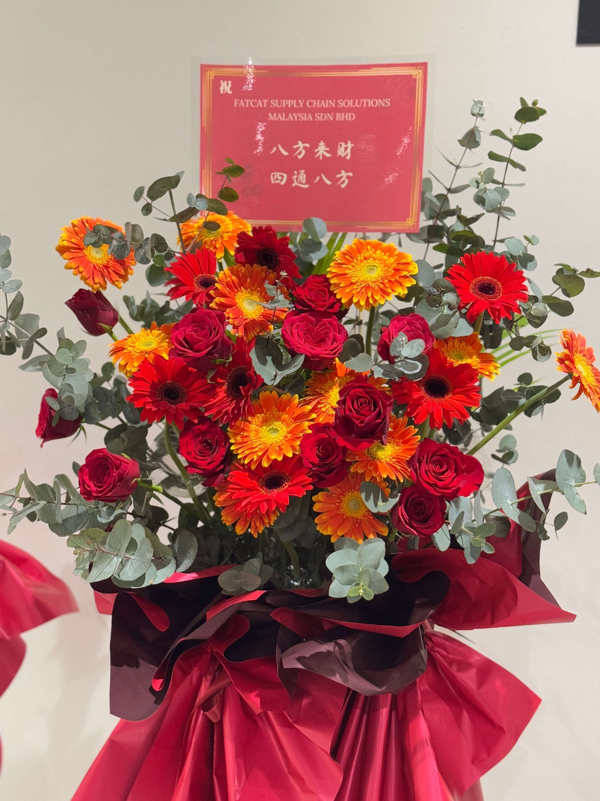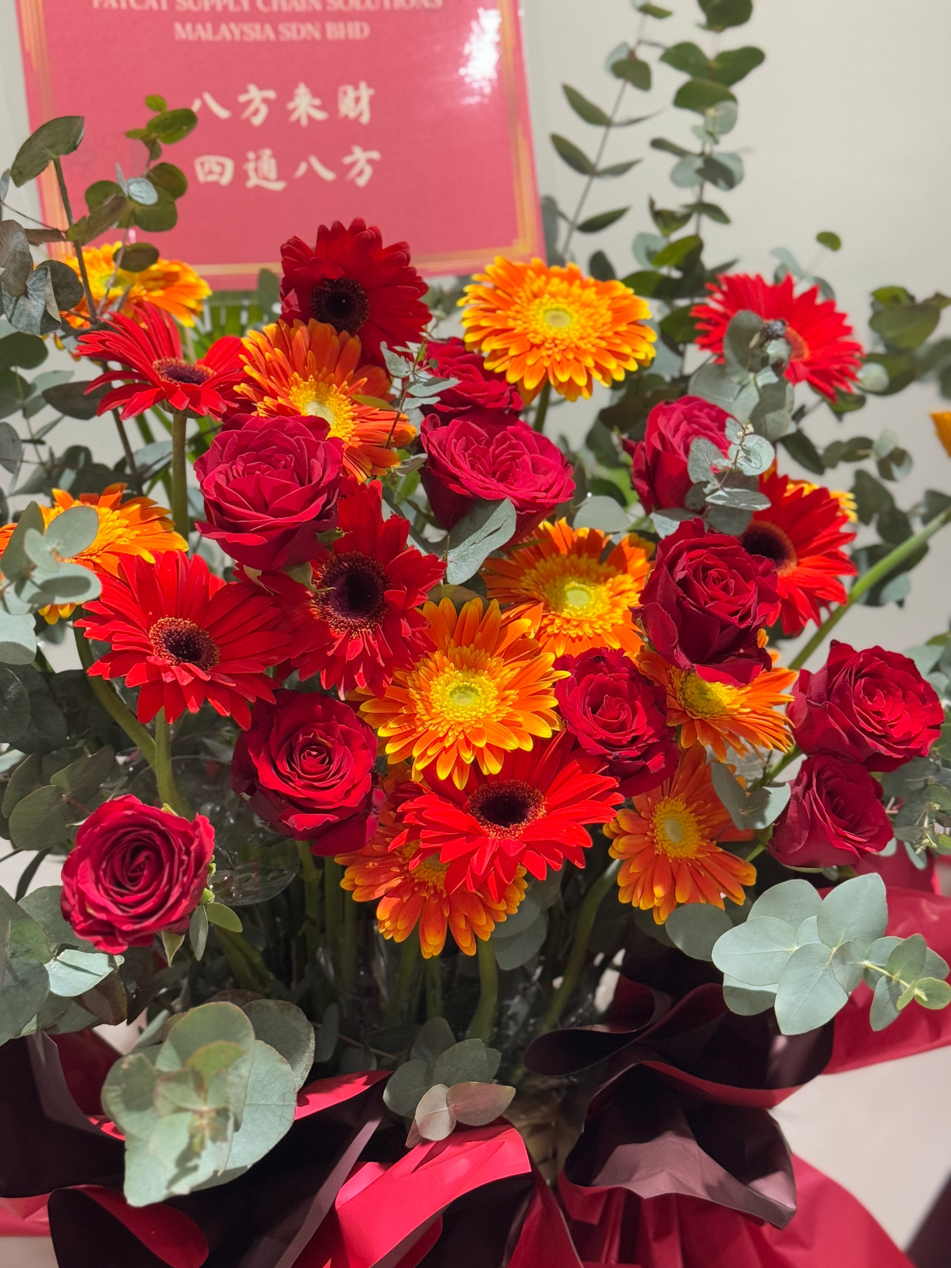 Igniting the spirit of success, this striking arrangement bursts with bold reds and fiery oranges—symbols of prosperity, passion, and new beginnings. Designed to command attention and convey heartfelt congratulations, each bloom stands tall with confidence and pride. Perfect for grand openings, business milestones, or celebratory moments, this flower stand radiates energy, ambition, and unstoppable momentum.