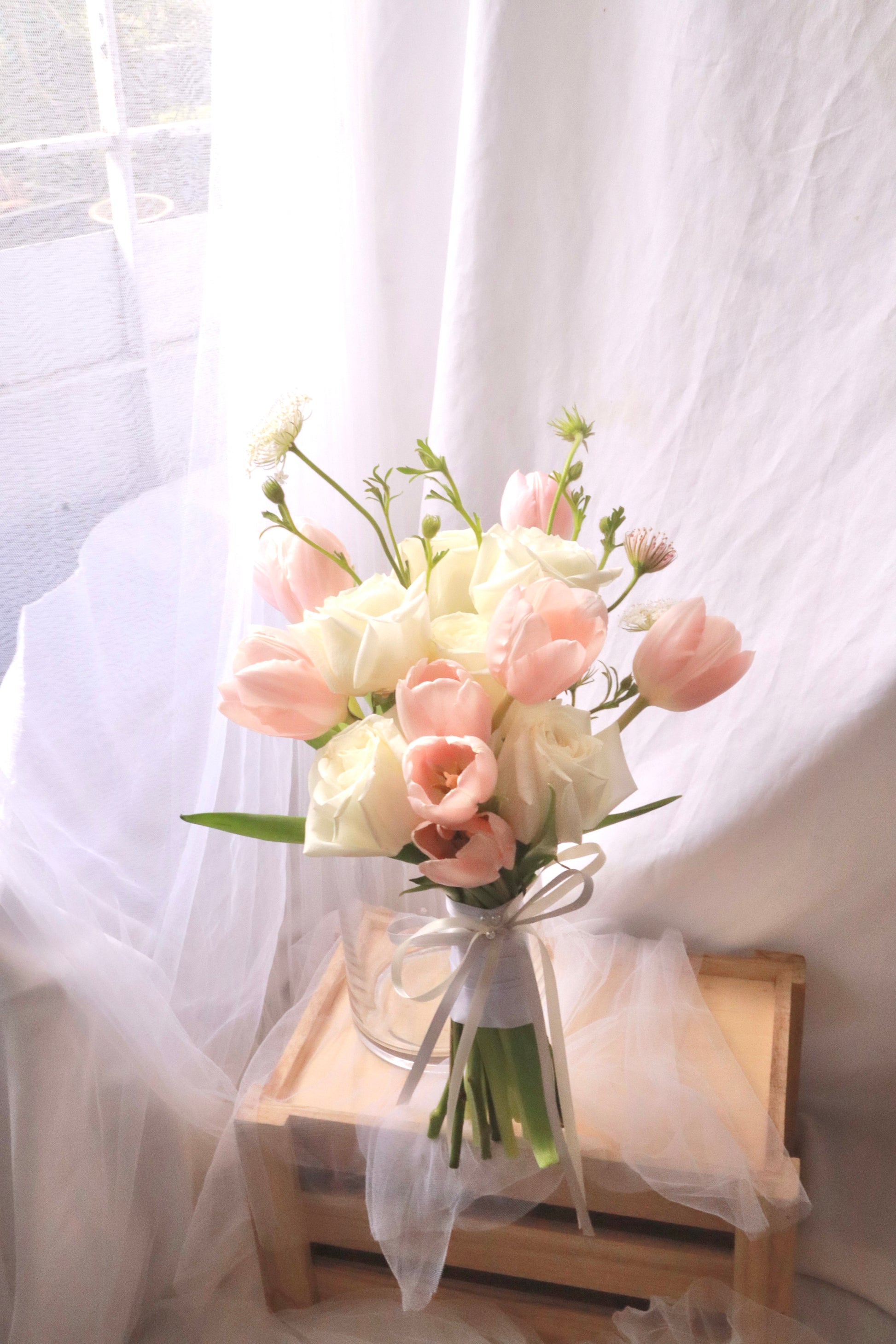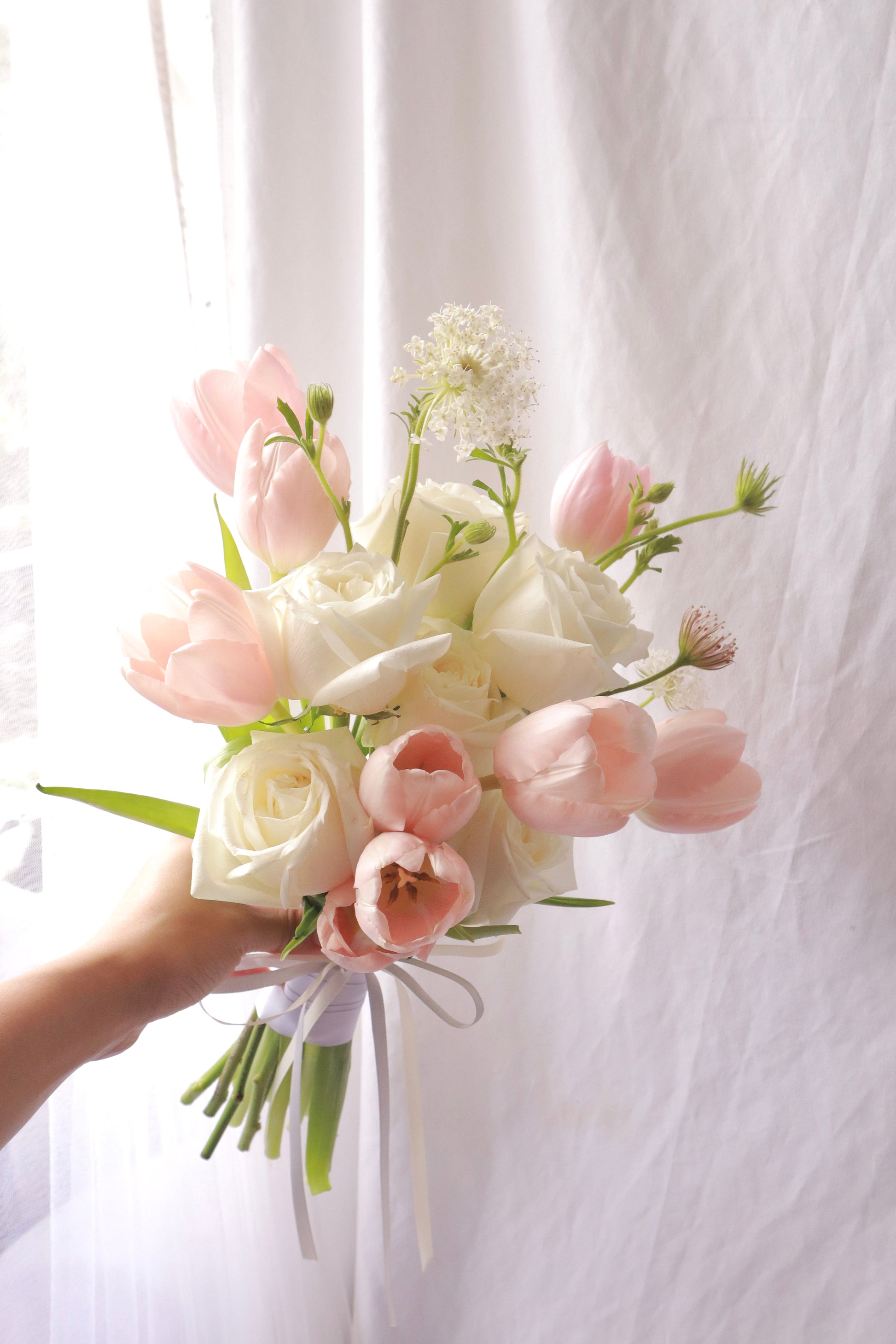 Introducing L'armoire Tulip and Rose Bridal Bouquet: a delicate blend of soft blushes and pure whites, perfectly capturing elegance and romance. The gentle contrast of textures creates an ethereal beauty, making this bouquet an exquisite choice for timeless bridal style.