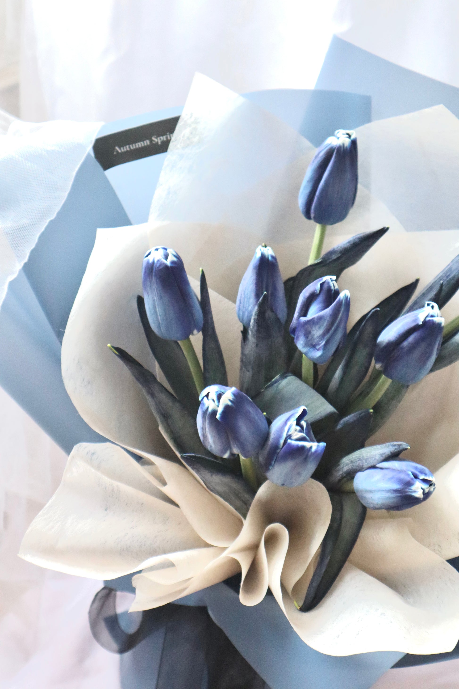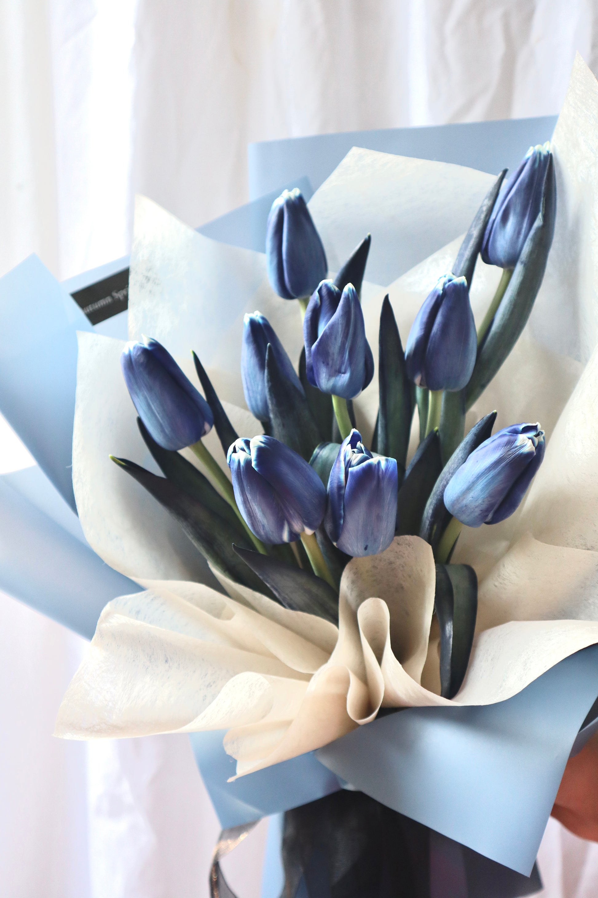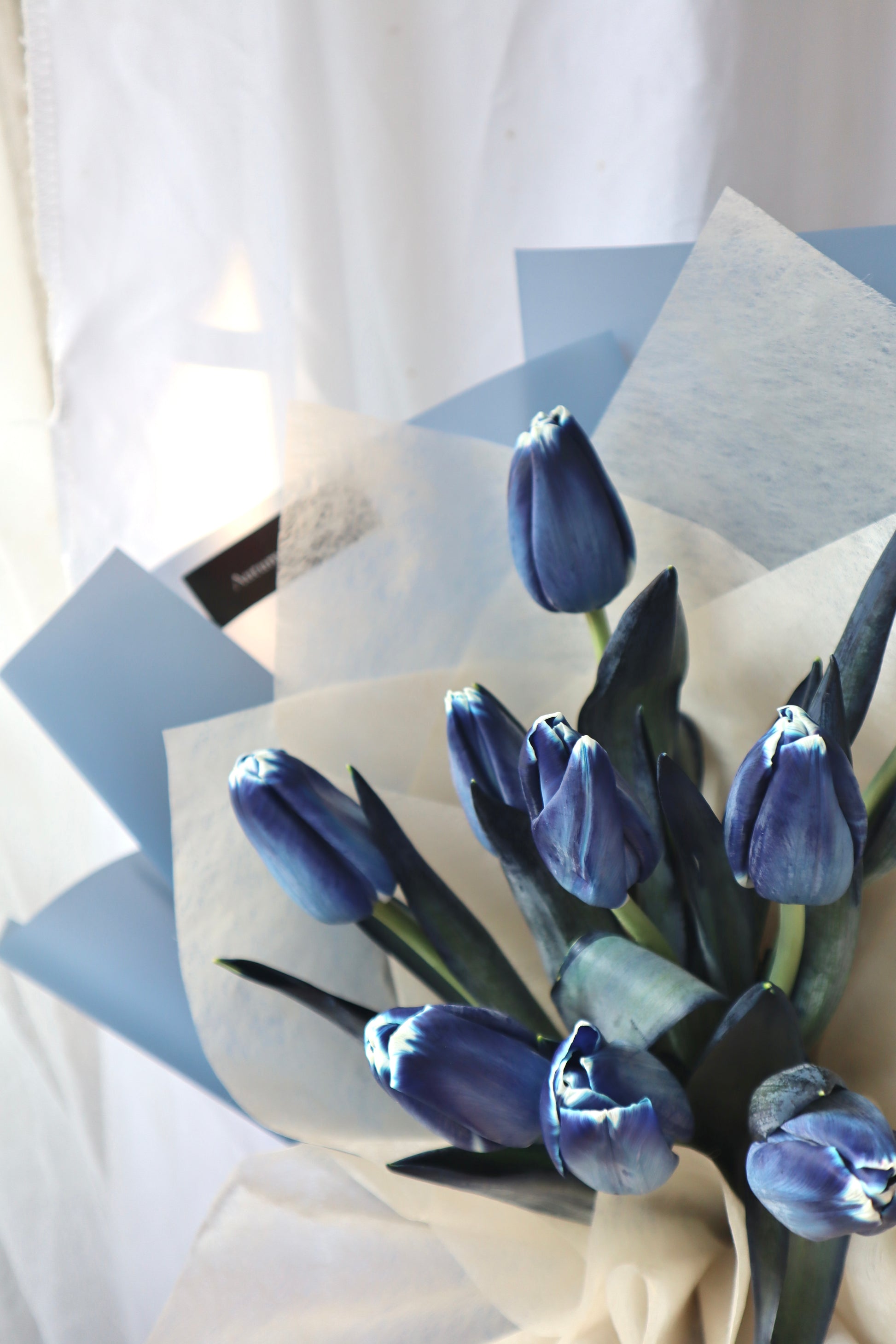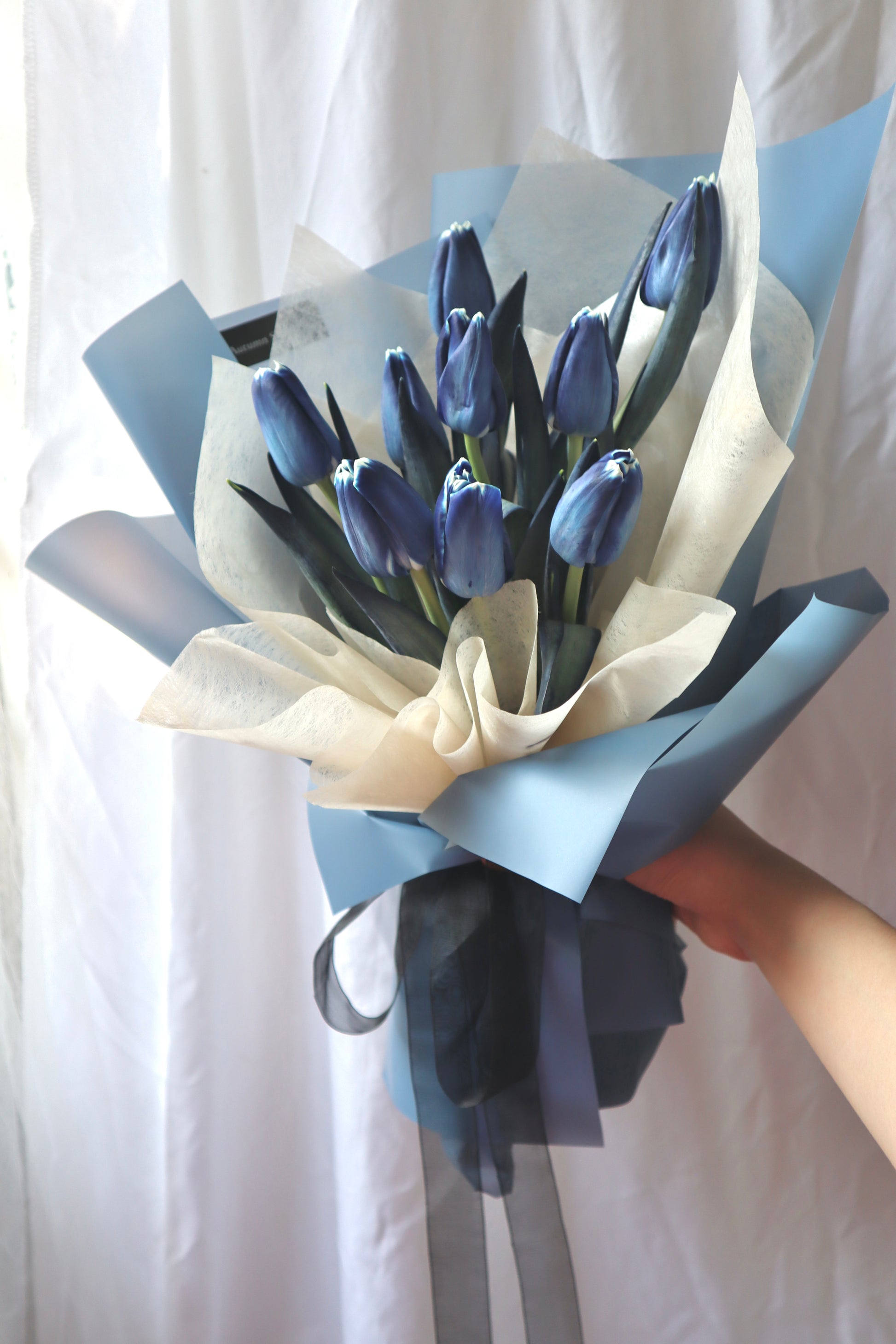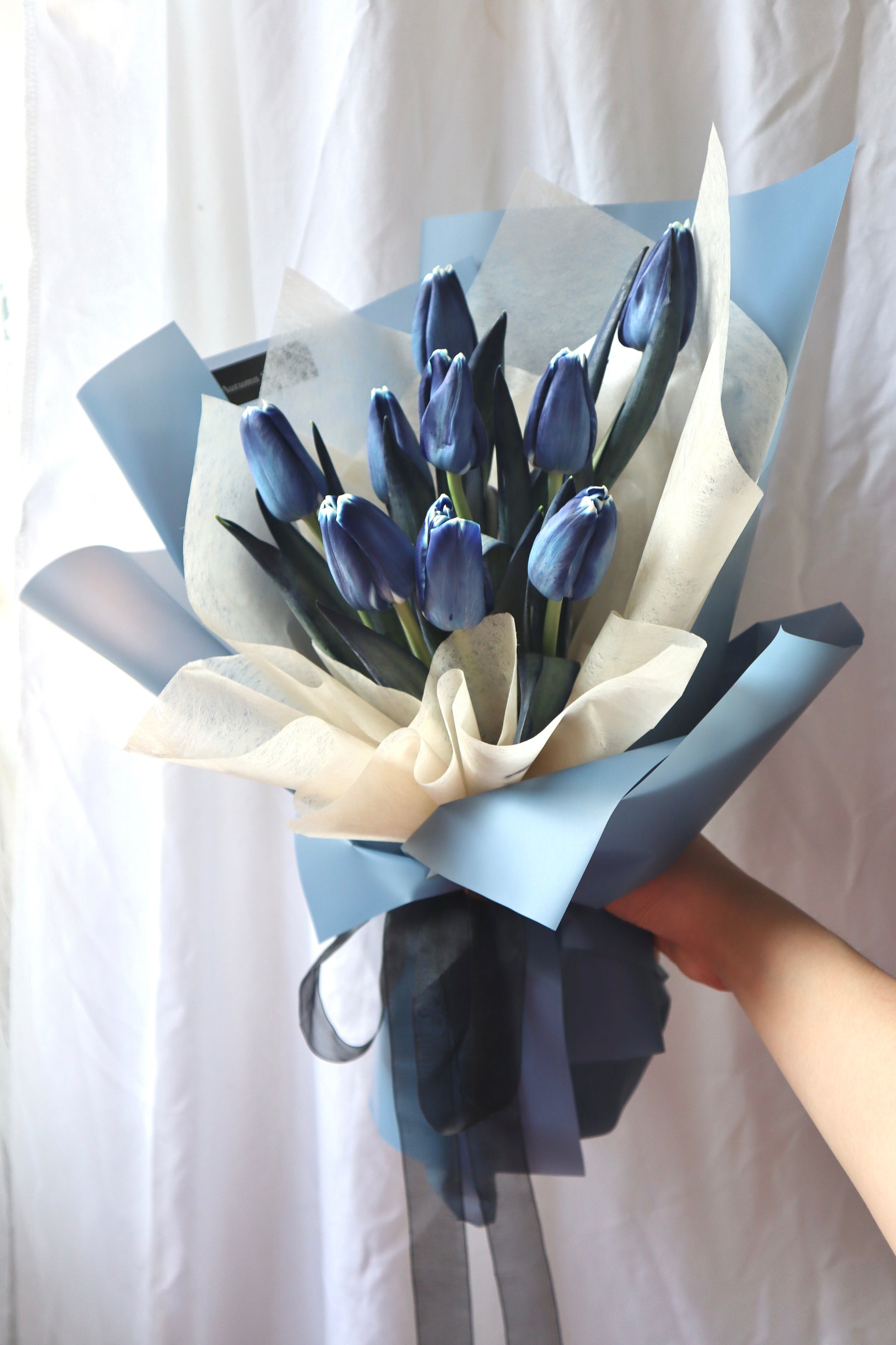 The Ma Chérie Blue Dyed Tulip Bouquet features a stunning arrangement of vibrant blue tulips. Meticulously dyed using premium floral dyes, these tulips create a rich, enchanting display that is sure to captivate. The bouquet's simple yet elegant design highlights the beauty of the blue tulips as the focal point.