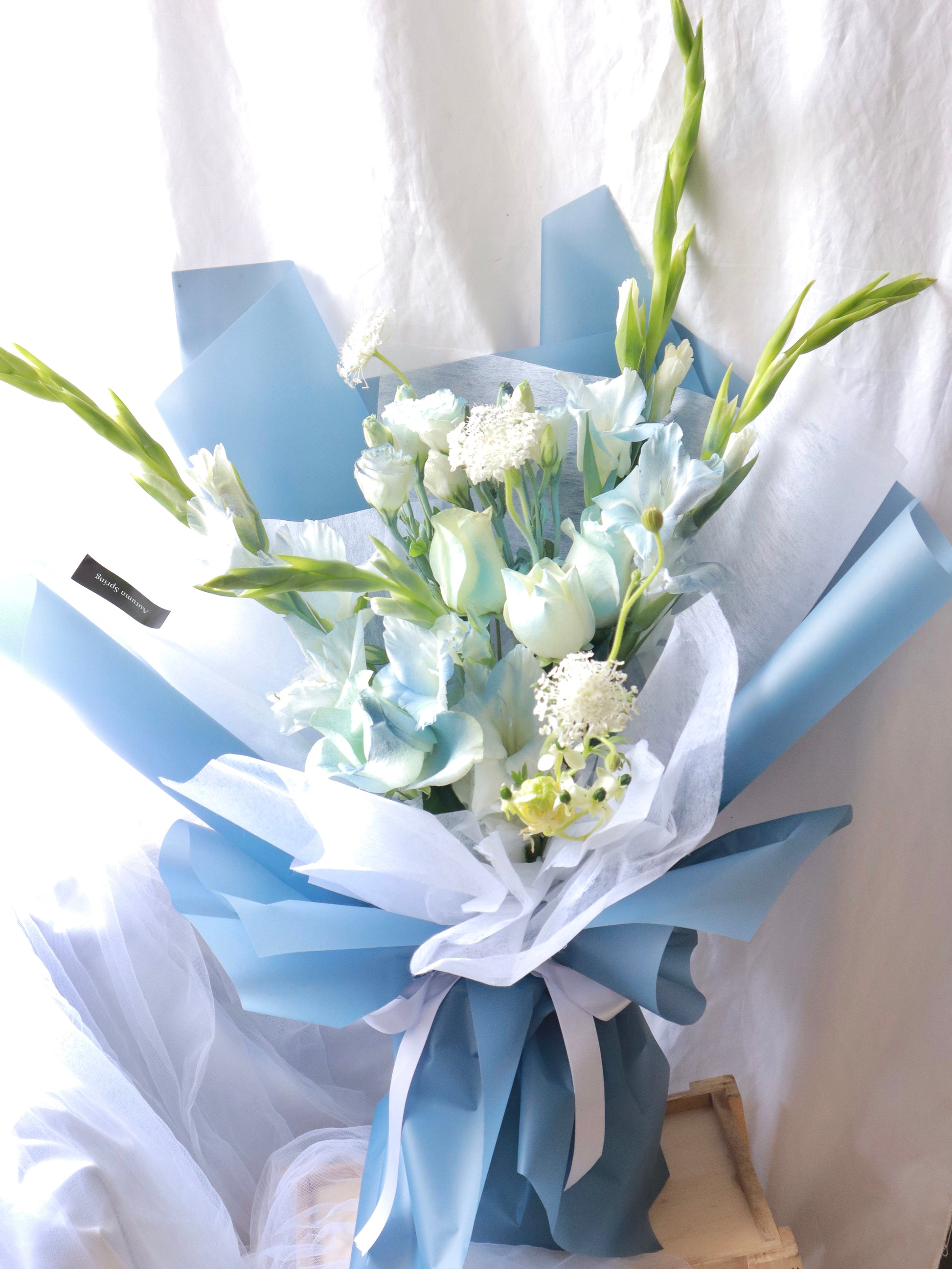 Immerse in the ethereal beauty of our Azure Dream Bouquet. Featuring Gladiolus, Roses, Lace Flowers, and Eustoma in hues of white and blue, this captivating arrangement evokes serenity and elegance. Perfect for enchanting any space with its tranquil charm.