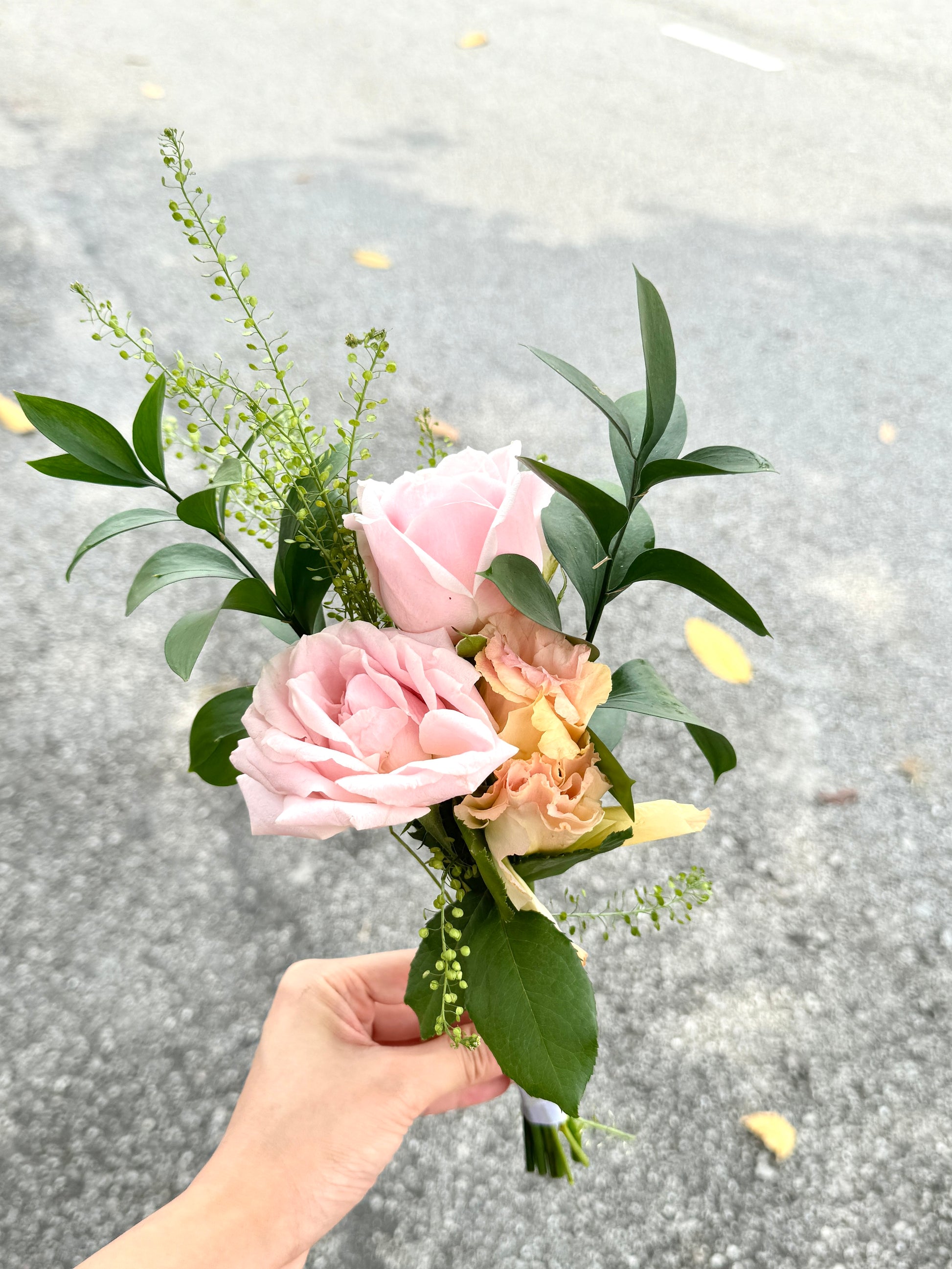The Melanie Bridesmaid Bouquet is a delicate blend of soft pink and champagne hues. Featuring elegant pink roses, champagne Eustoma, lush green thlaspi green bell, it’s a timeless design that exudes romantic charm.