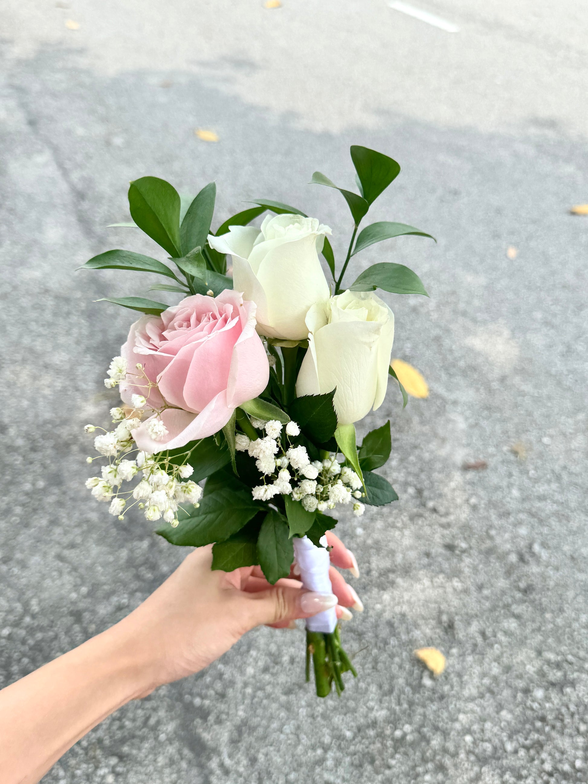 Ruscus, Pink Rose, White Rose, White Baby breath