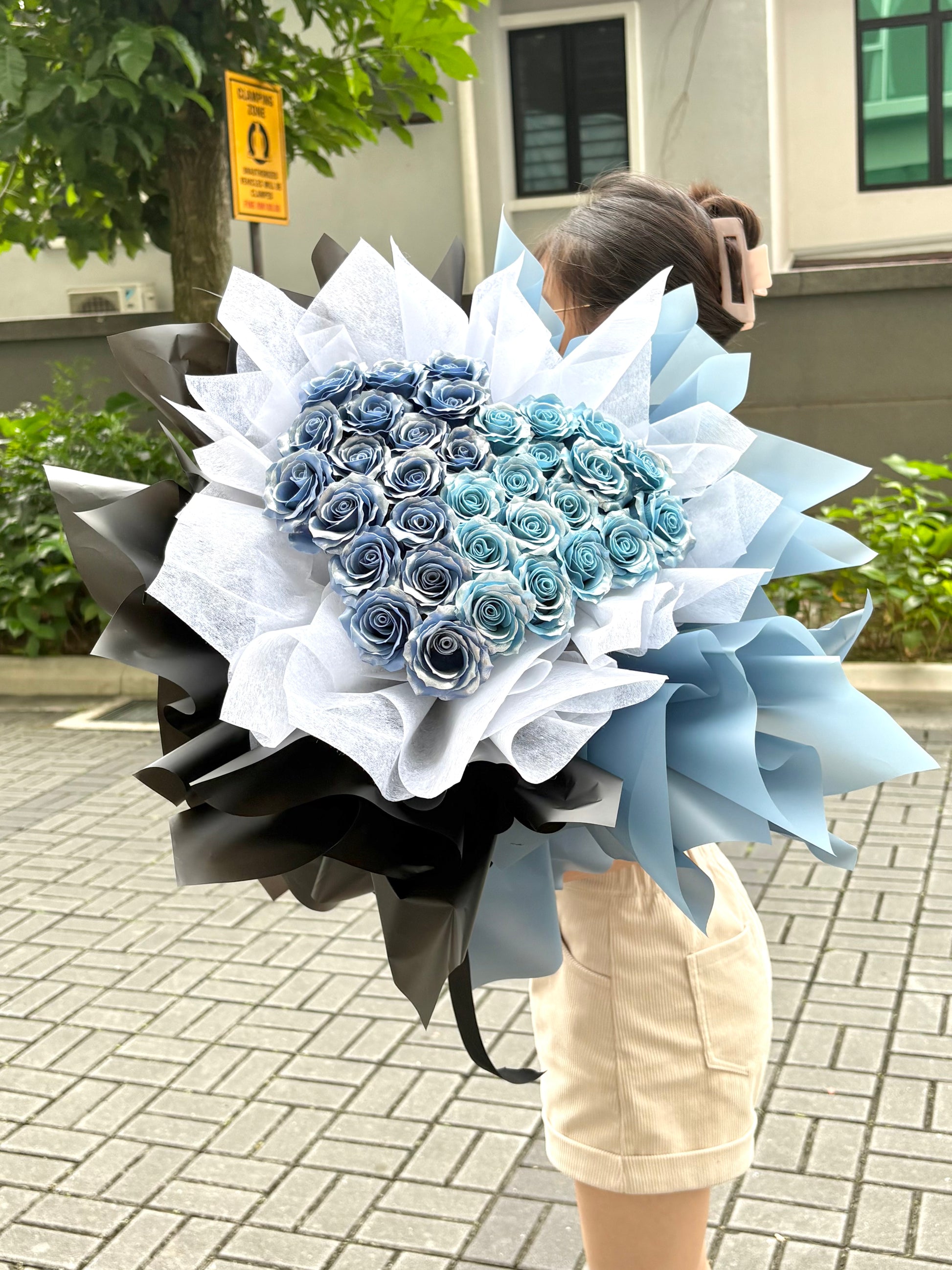 A breathtaking bouquet of blue-black soap roses, symbolizing mystery, depth, and the beauty of the unknown. These elegant blooms evoke the calm and quiet of a starlit night, with their deep, dark petals bringing a sense of sophistication and timeless allure. Wrapped with care, this bouquet makes a bold yet graceful statement for any occasion.