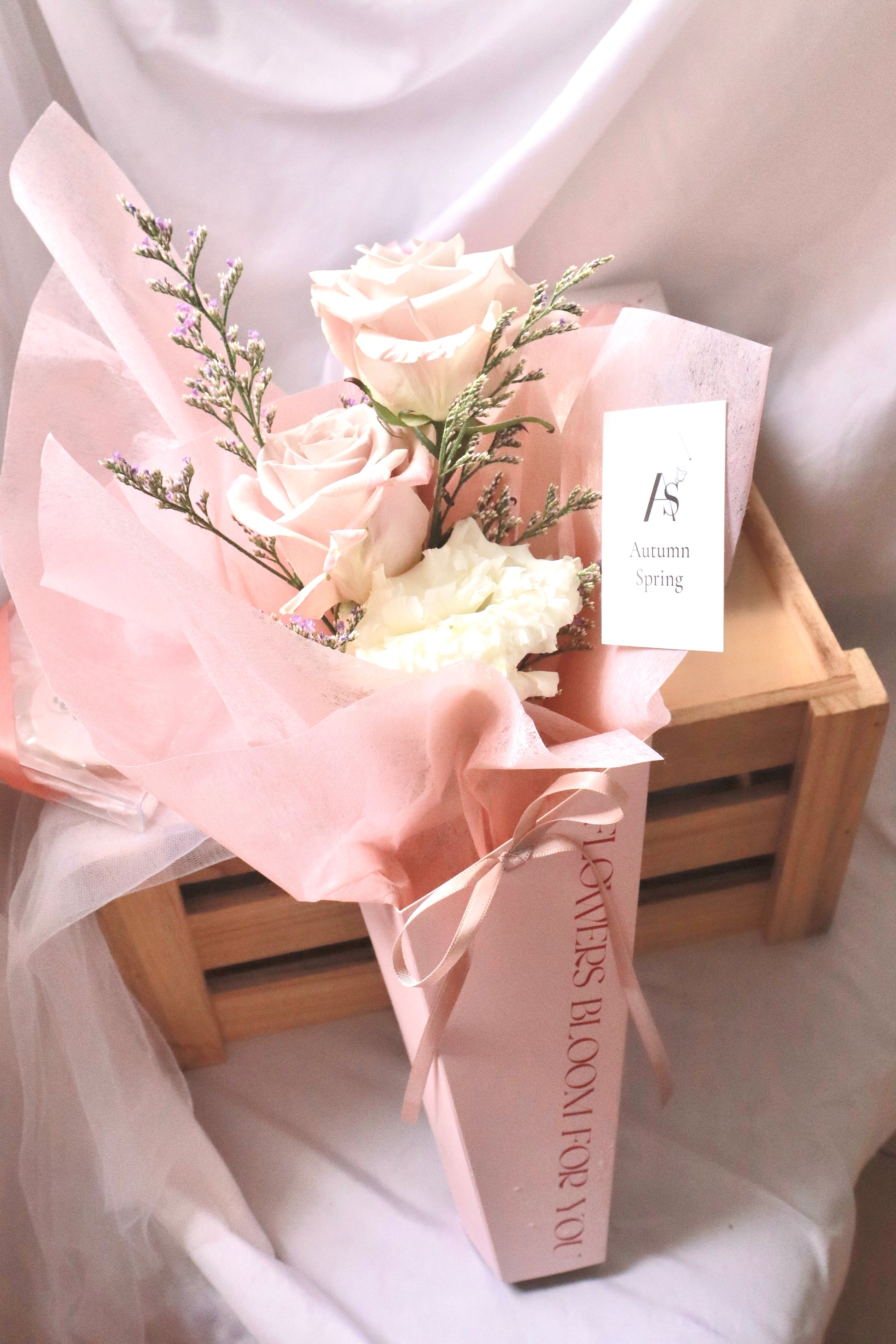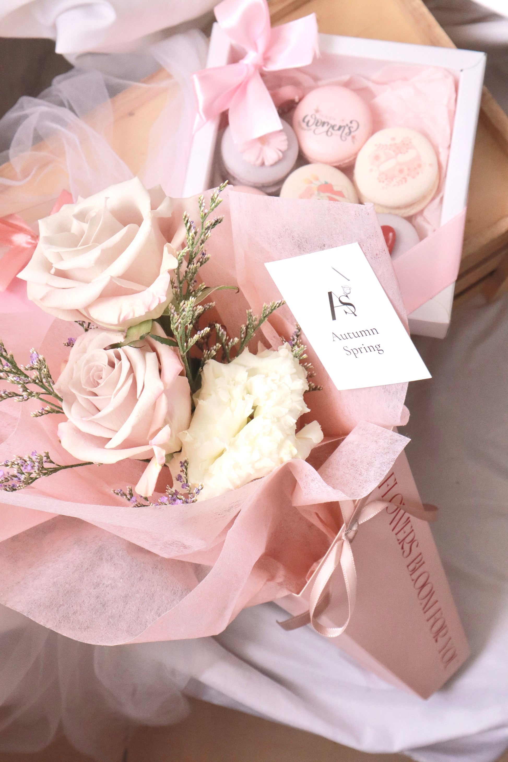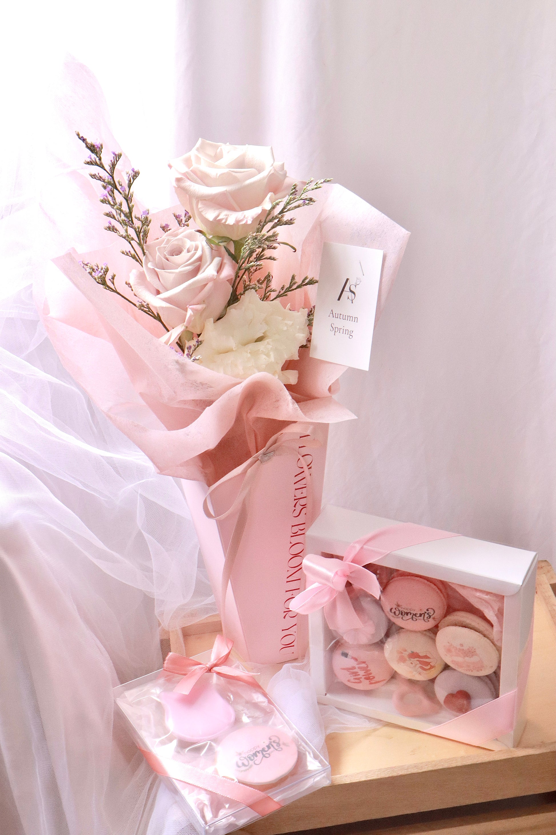 The Miss Lady Flower Box features a charming mix of Manta Roses and White Eustoma, complemented by elegant fillers. This delightful arrangement exudes a classic sophistication, perfect for expressing warmth and affection with its inviting pink and white palette. Ideal for any special occasion.*macaroon and cookies not available*