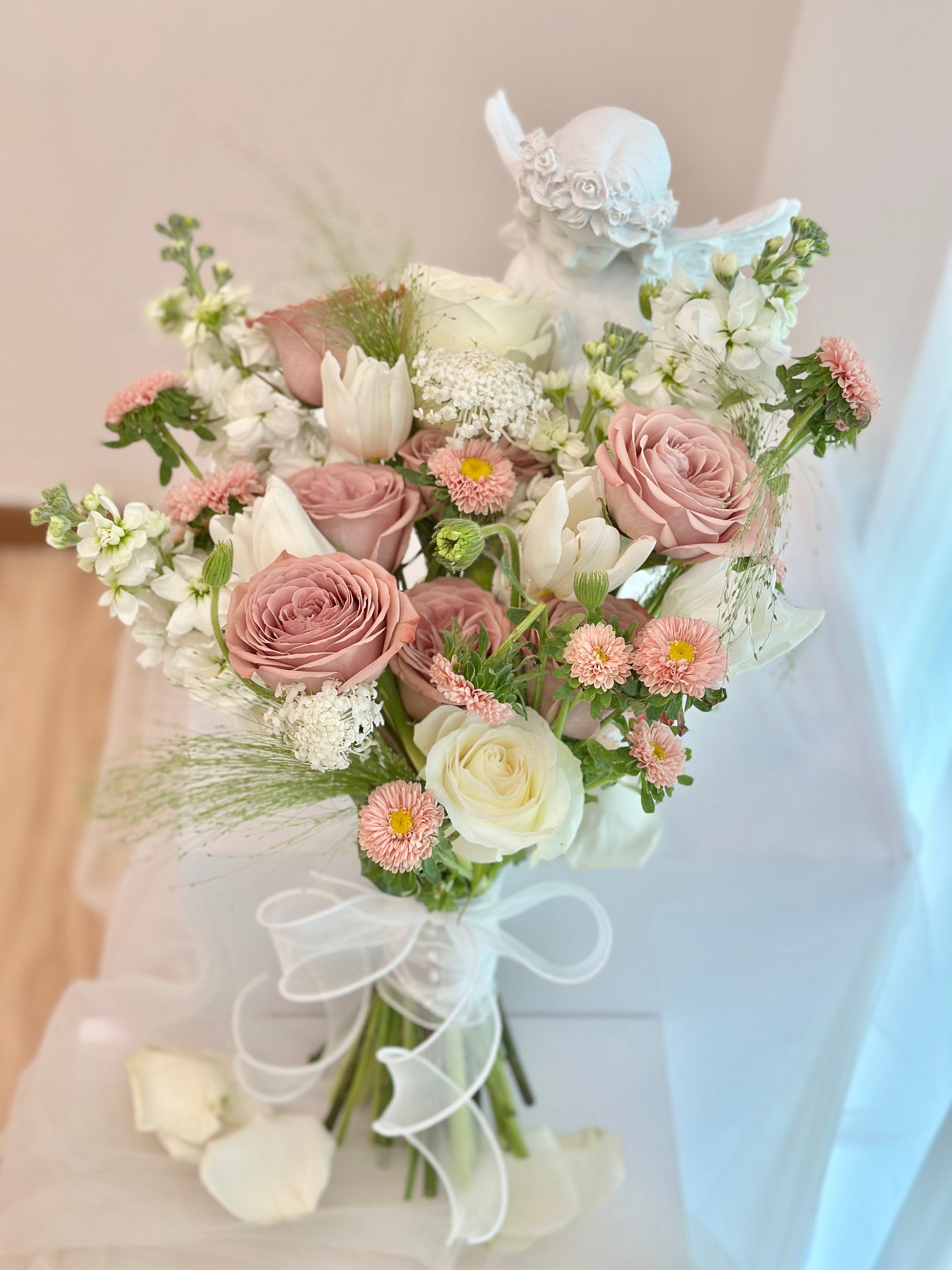 Moonlight Grace is a tender bouquet of soft pinks, creamy whites, and airy greens — a poetic expression of elegance and serenity. Wrapped in translucent white ribbon like a bridal veil, it captures the feeling of walking beneath moonlight on your wedding day: calm, radiant, and unforgettable.Perfect for brides who love romance with a gentle touch and a hint of classic charm.