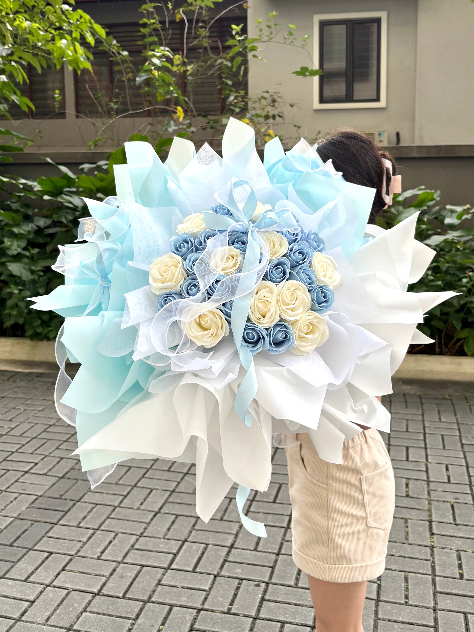 Ocean Serenity is a graceful bouquet of blue and white soap flowers, blending the calming charm of ocean blue with the purity of soft white. This bouquet evokes peace, sincerity, and quiet romance—like a gentle breeze by the sea.