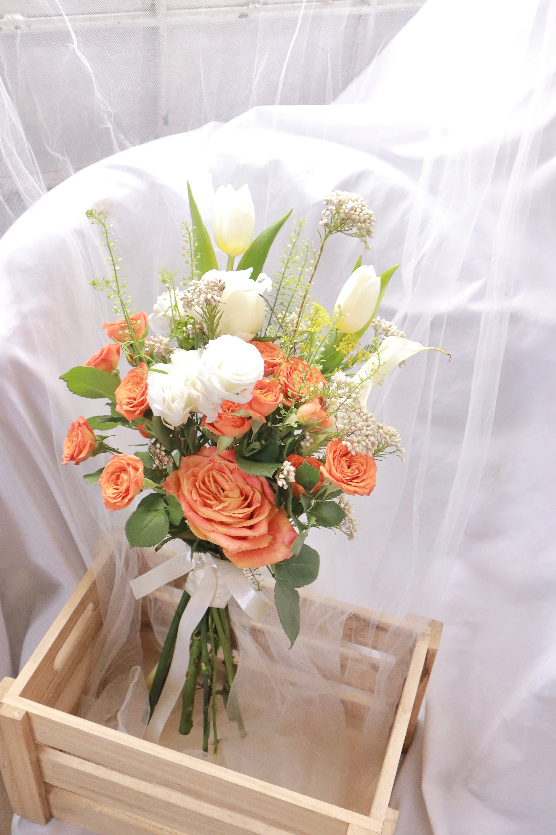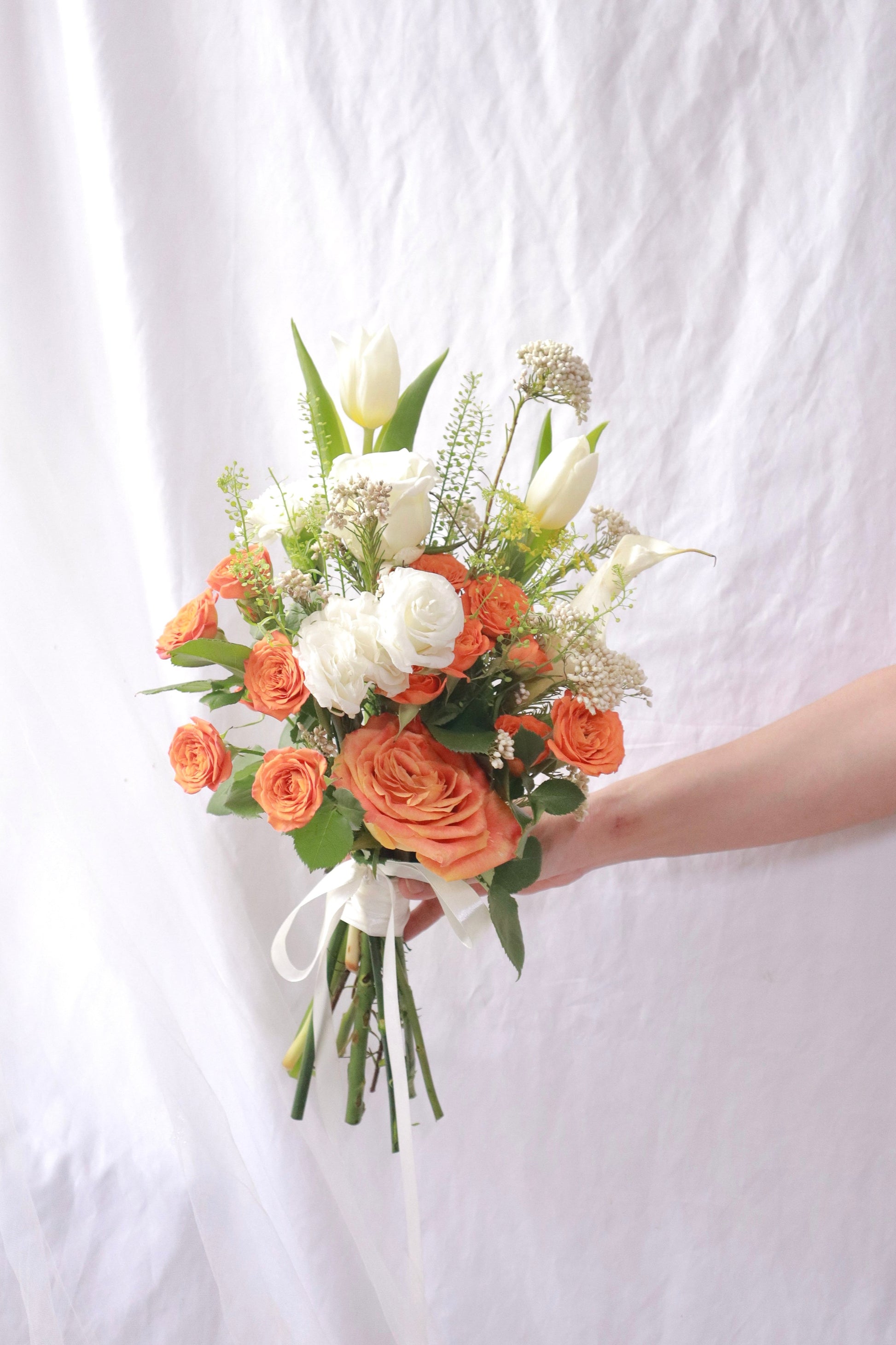 Rice Flower, White Tulip, White Carnation, White Eustoma, Orange Rose, Orange Rose Spray, Thlaspi Green Bell, White Calla Lily