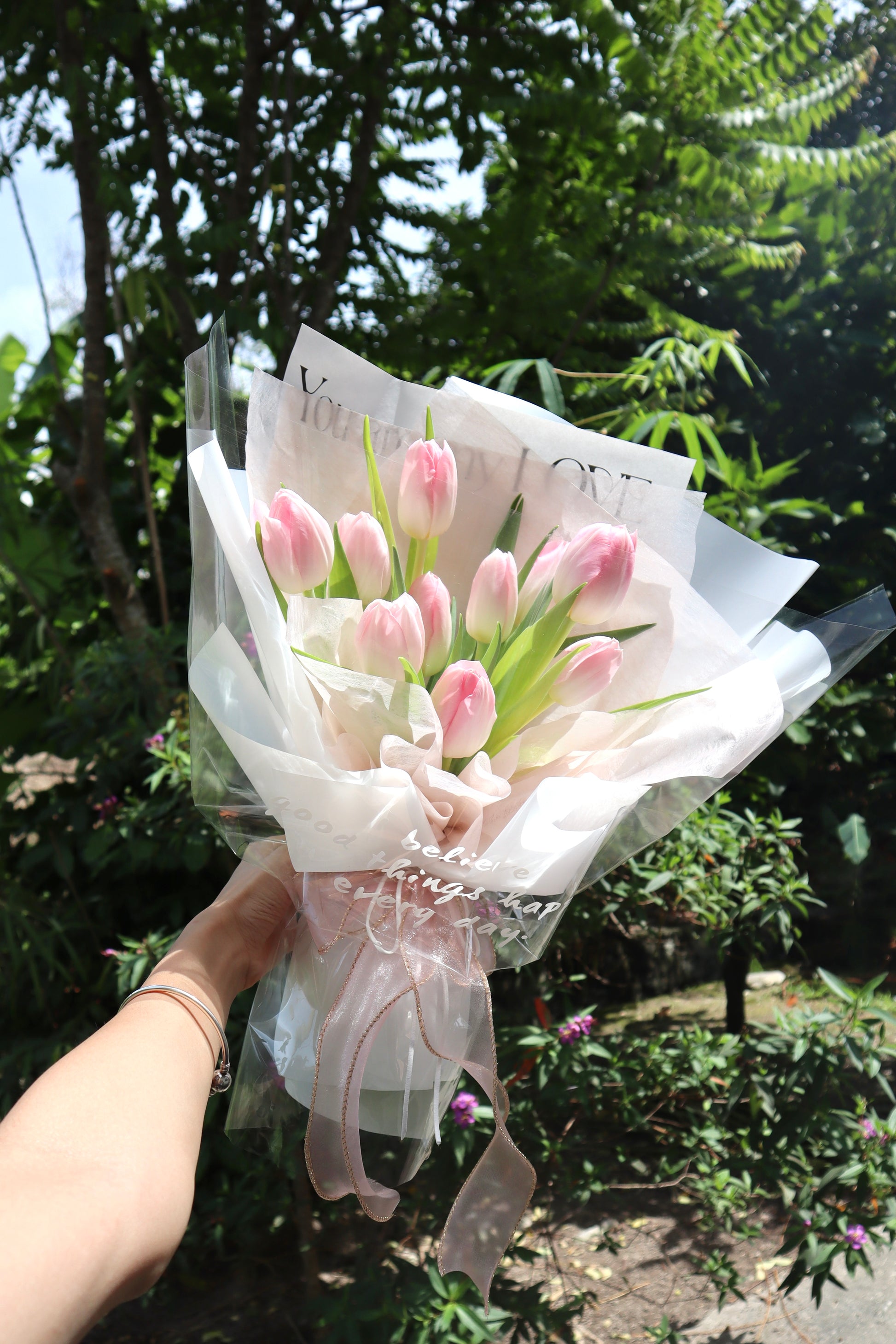 The Paradise Pink Tulip Bouquet is a stunning array of vibrant pink tulips, radiating beauty and joy. This enchanting arrangement embodies romance and elegance, perfect for brightening any space or expressing love and admiration on special occasions.