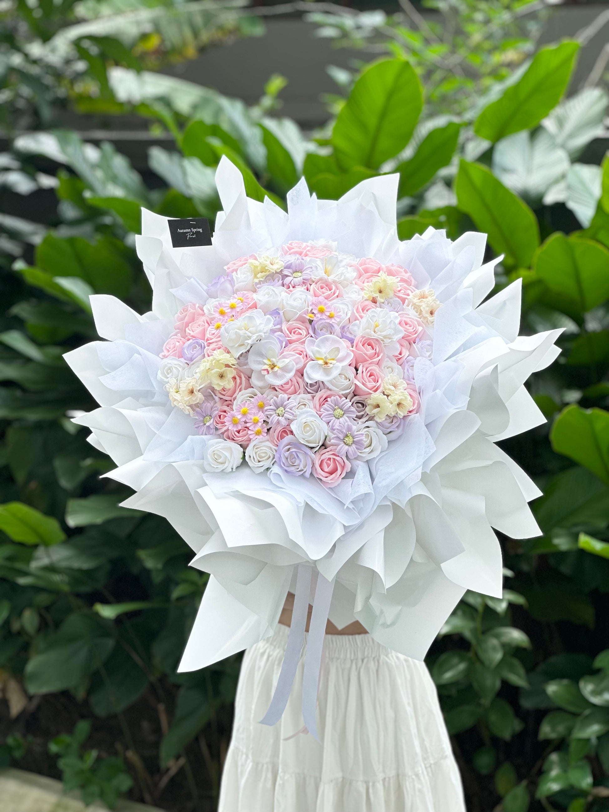Delicate as a dream and soft as a whisper, this pastel-hued soap flower bouquet captures the essence of elegance and serenity. A blend of gentle pinks, creamy whites, powder blues, and soft lavenders come together like a quiet conversation in bloom.