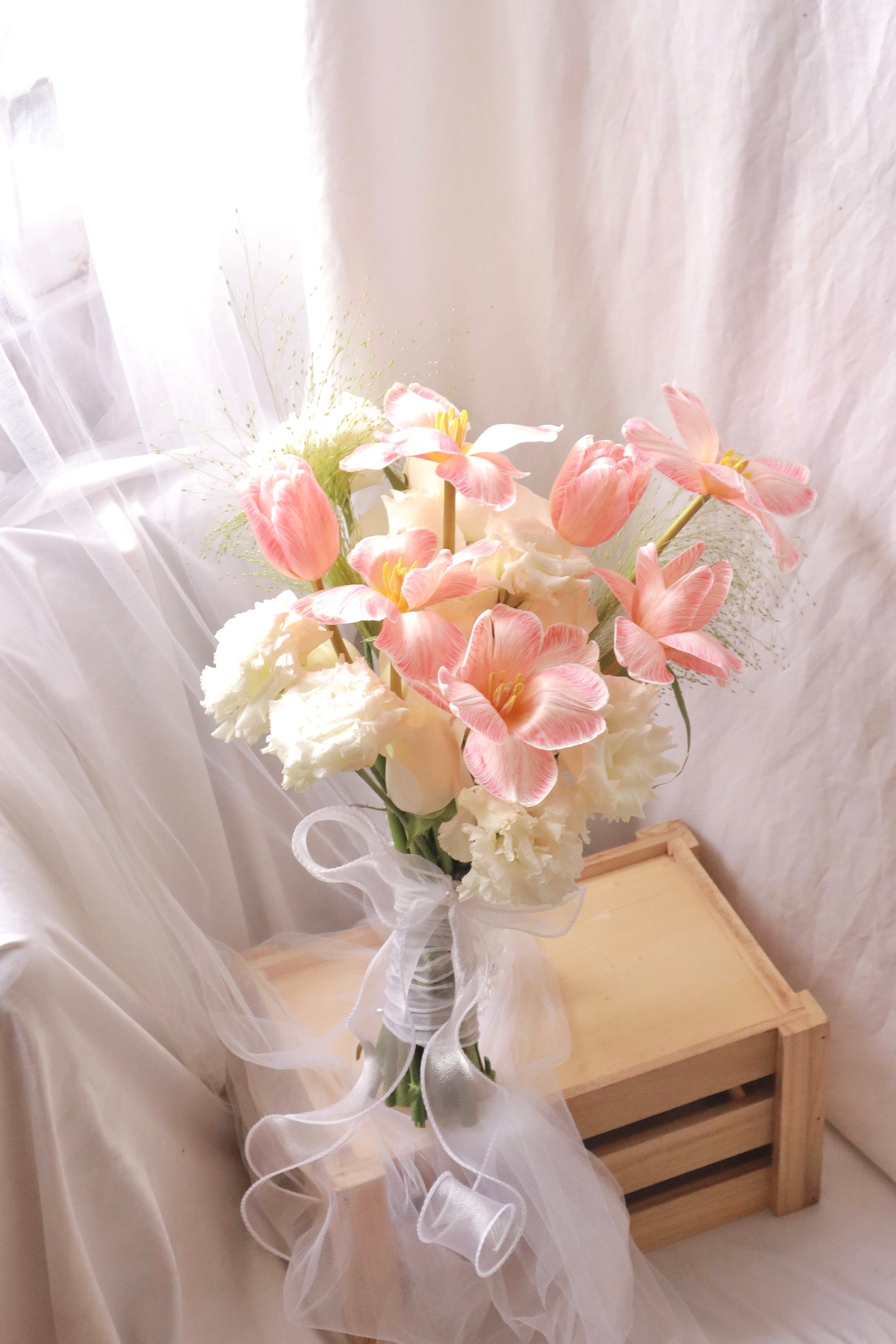 Dyed peach Tulip, White Eustoma, Fountain Grass, White Rose