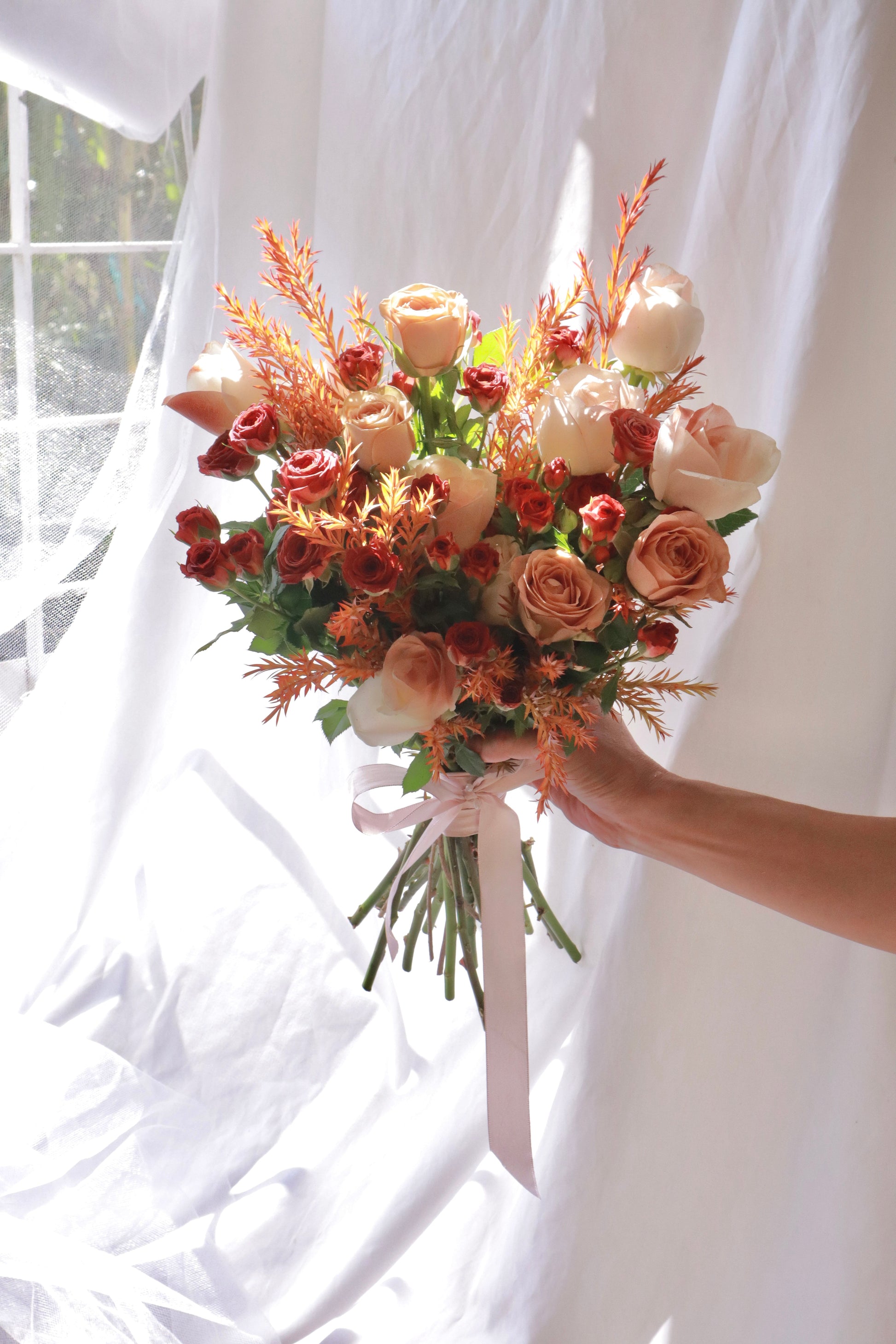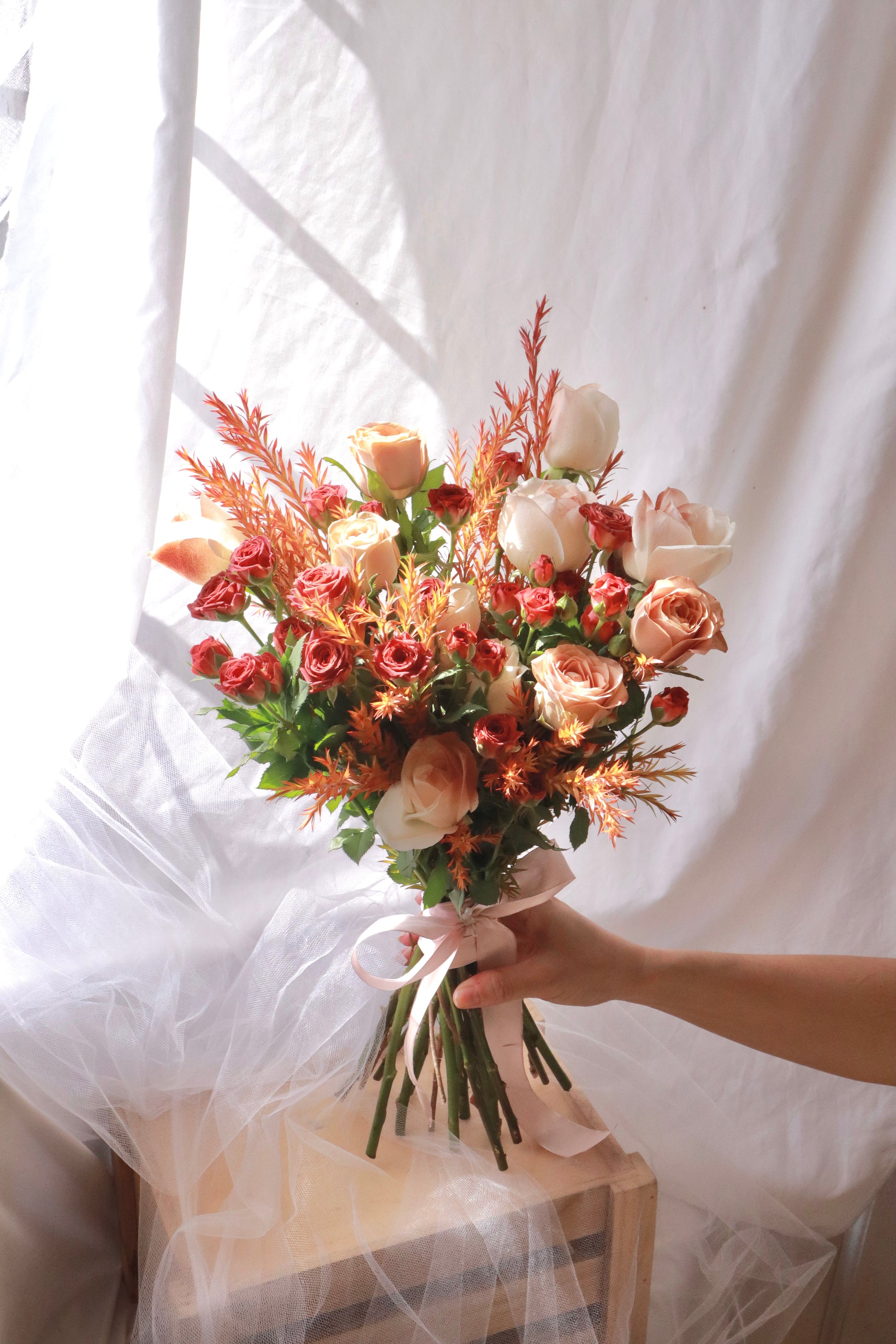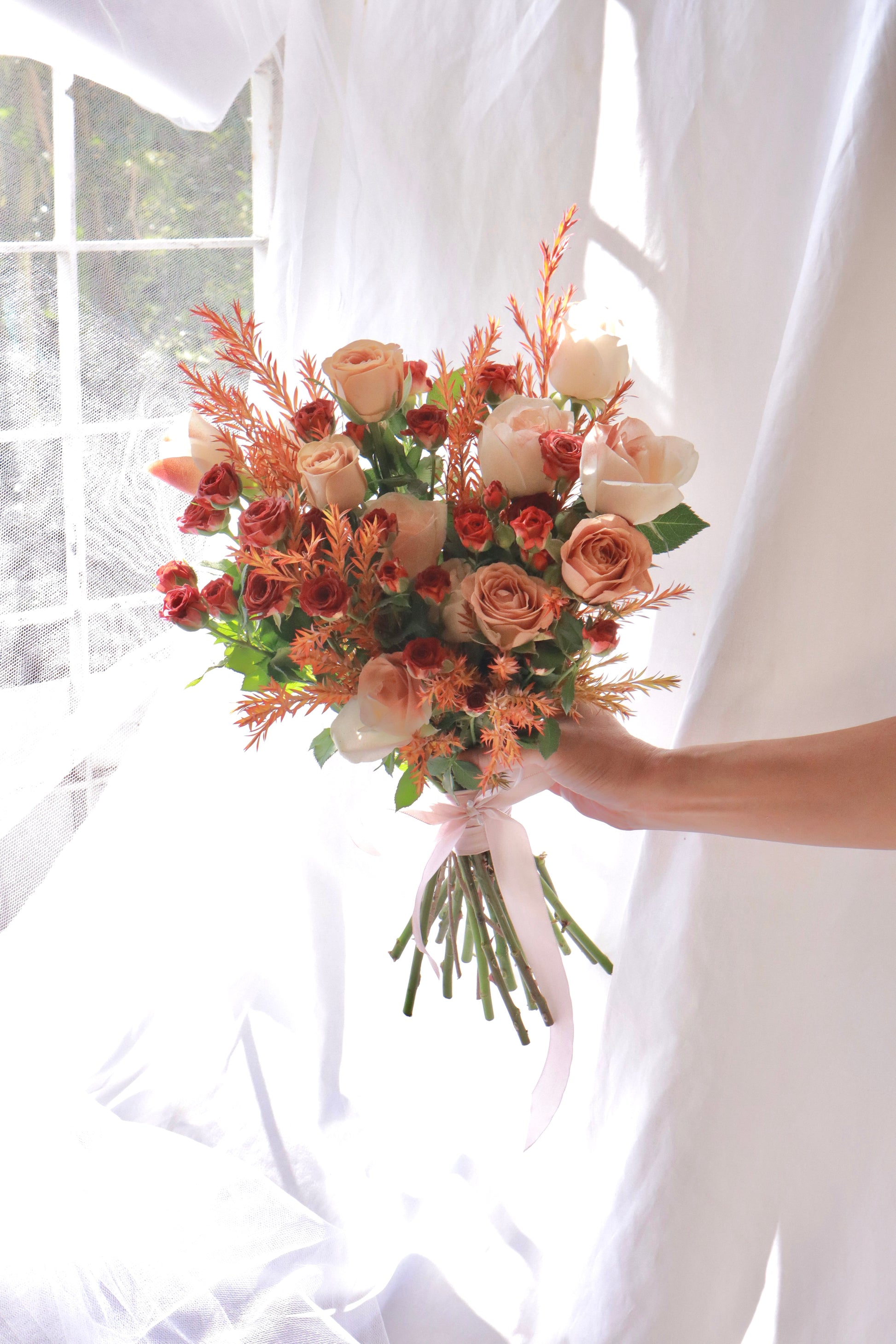 A stunning blend of warm cappuccino hues, soft whites, and vibrant orange tones captures the essence of fall. This bouquet offers a rich, earthy elegance with a golden touch, perfect for brides seeking a natural yet sophisticated autumn vibe.