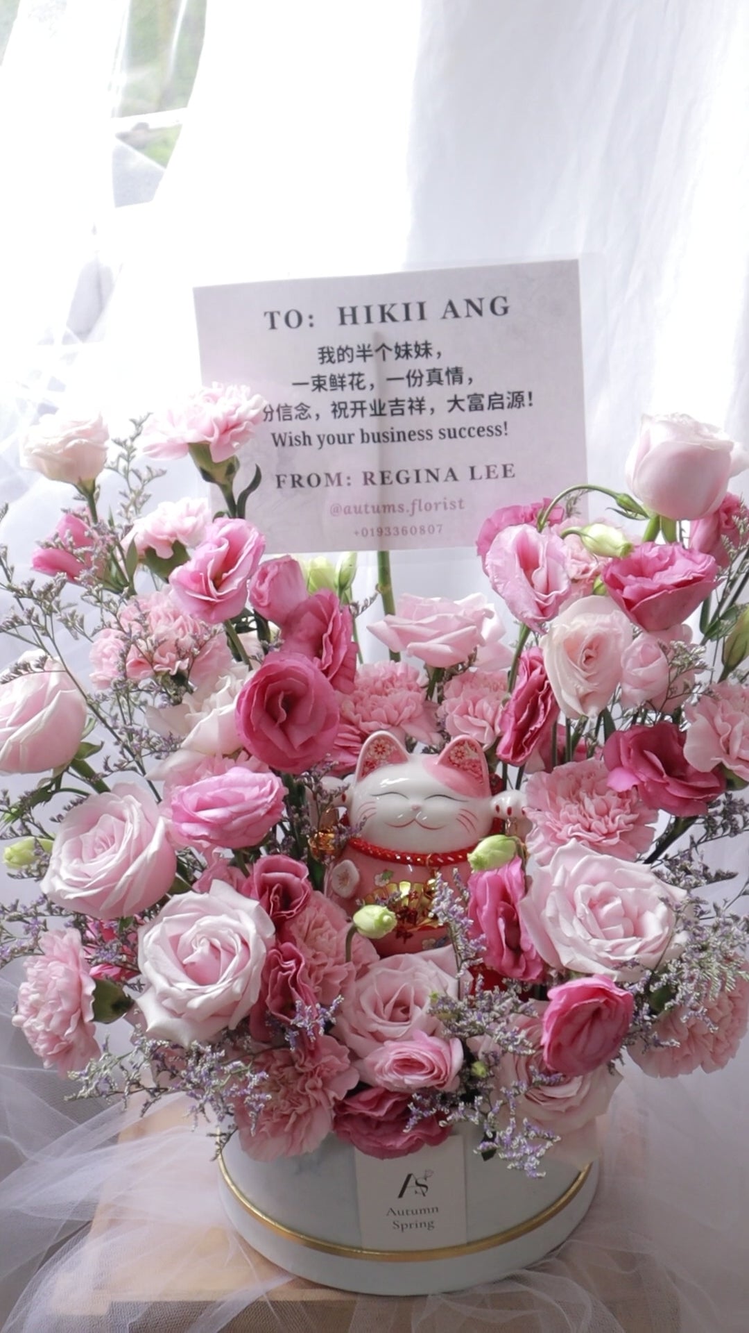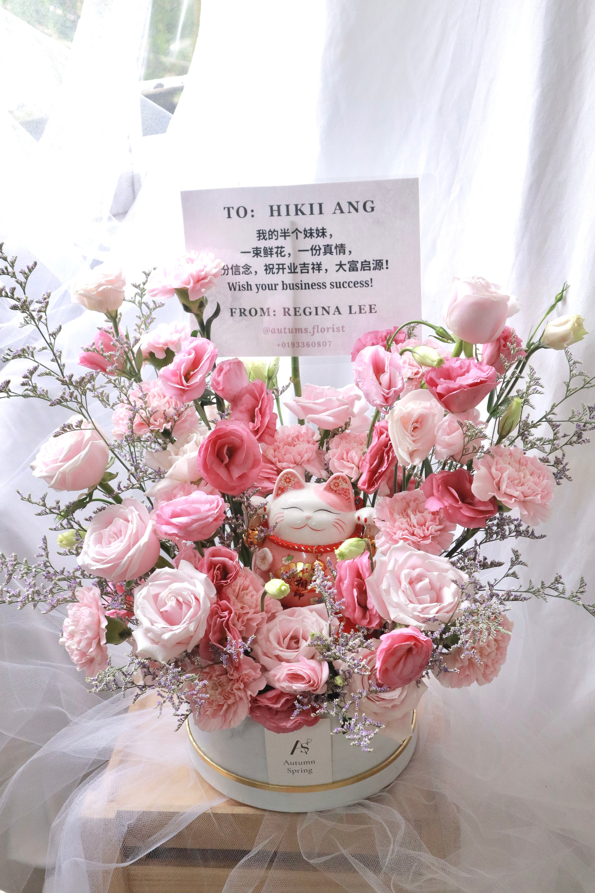 The Pink Shower Grand Opening Flower Box features a stunning blend of soft pink blooms and lush accents, creating an elegant and welcoming display. Paired with a Fortune Cat for added luck, this arrangement is perfect for celebrating new beginnings in style.